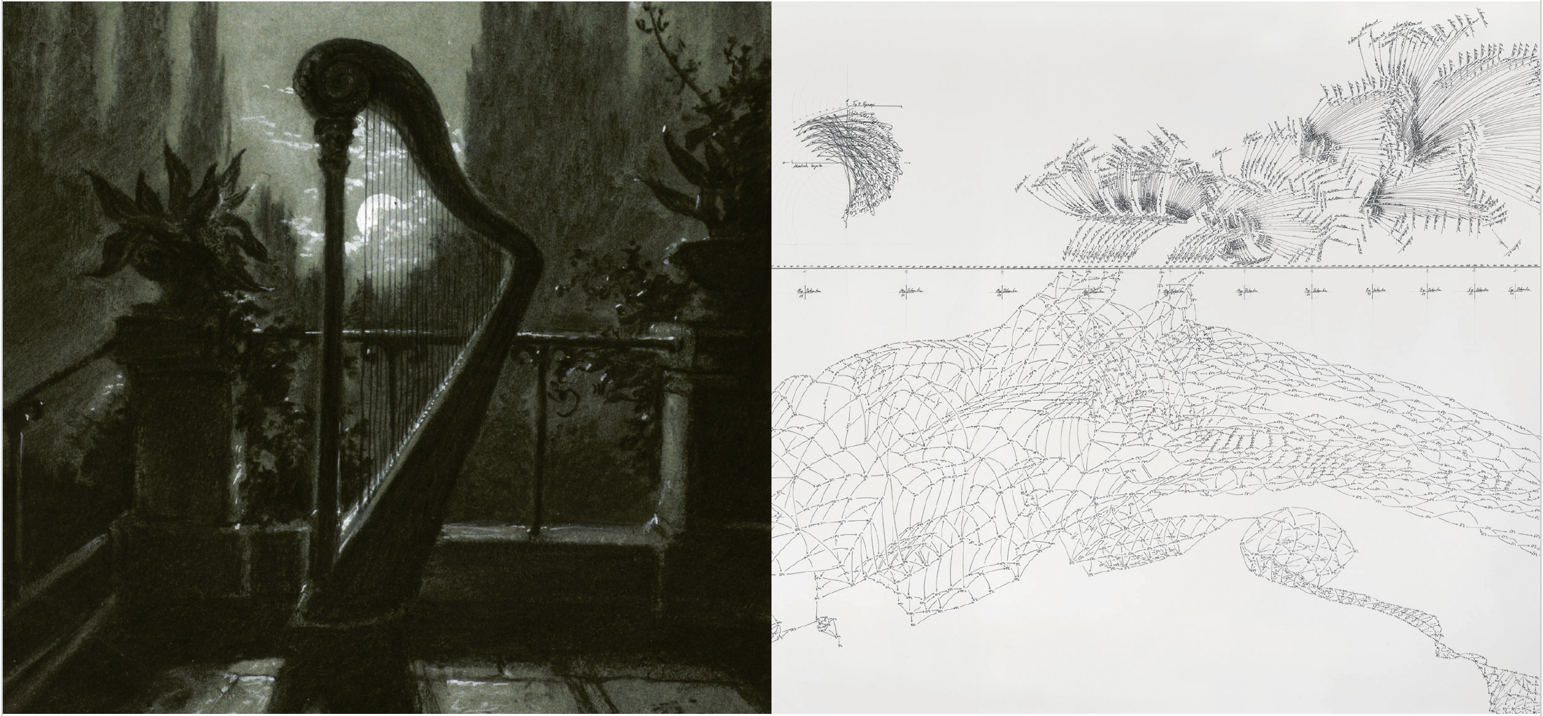 Musik und Bildender Kunst wohnt die Kraft inne, den Gefühlen menschlicher Erfahrung Ausdruck zu verleihen und sie mitzuteilen. Doch die Zeichnung von Voigt ist auf den ersten Blick schwer zu entschlüsseln: Abstrakte Beziehungen zwischen ganz unterschiedlichen Komponenten fügen sich zu einer Art Diagramm zusammen, das ebenso monumental wie fragil wirkt. Jorinde Voigt ist in klassischer Musik ausgebildet und lässt dynamische Impulse, Takte von Popsongs, zwei Küssende, Detonationen, einen Temperaturverlauf und einen Zeitstrahl zu einer rätselhaften Partitur werden. Dabei widmet sie sich nicht nur akustischen Signalen, sondern stellt einen ganzen akustischen Wahrnehmungsraum im zweidimensionalen Bildmedium dar. Das Diagramm konstruiert dabei eine ganz eigene Realität. Würde man beispielsweise versuchen, die Notationen der Popsongs abzuspielen, bekäme man ein Rauschen zu hören – der praktische Nutzen als musikalische Partitur ist also begrenzt. Vielmehr geht es um die Wahrnehmung per se: Wie kann Musik auch ohne Notenschrift einen grafischen Ausdruck finden? Wie können Geräusche visuell erfahrbar werden? Wie lassen sich akustische und visuelle Erfahrungen verschmelzen? Die Schenkung Sammlung Hoffmann lässt zeitgenössische Werke mit den Objekten der unterschiedlichen Museen der Staatlichen Kunstsammlungen Dresden in einen Dialog treten, um für die heutigen wie die historischen Exponate neue Betrachtungsweisen und Bedeutungsebenen zu öffnen. Auch bei Carl Gustav Carus blickt man auf eine geheimnisvolle Szene: Ruhig und solitär steht eine Harfe in einer mediterranen Landschaft, nichts deutet auf ein baldiges Konzert hin. Es wird deutlich: Diese Harfe soll nicht gespielt werden, sie ist ein rein symbolisches Element. Beiden Werken ist der Versuch einer Visualisierung von akustischen Phänomenen gemeinsam.