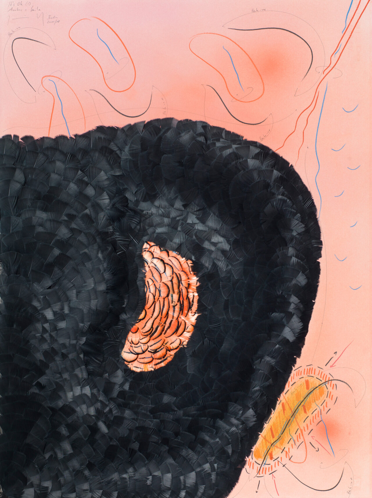 Ink, feathers, oil chalks, pastels, pencil on paper, unique work, Signed