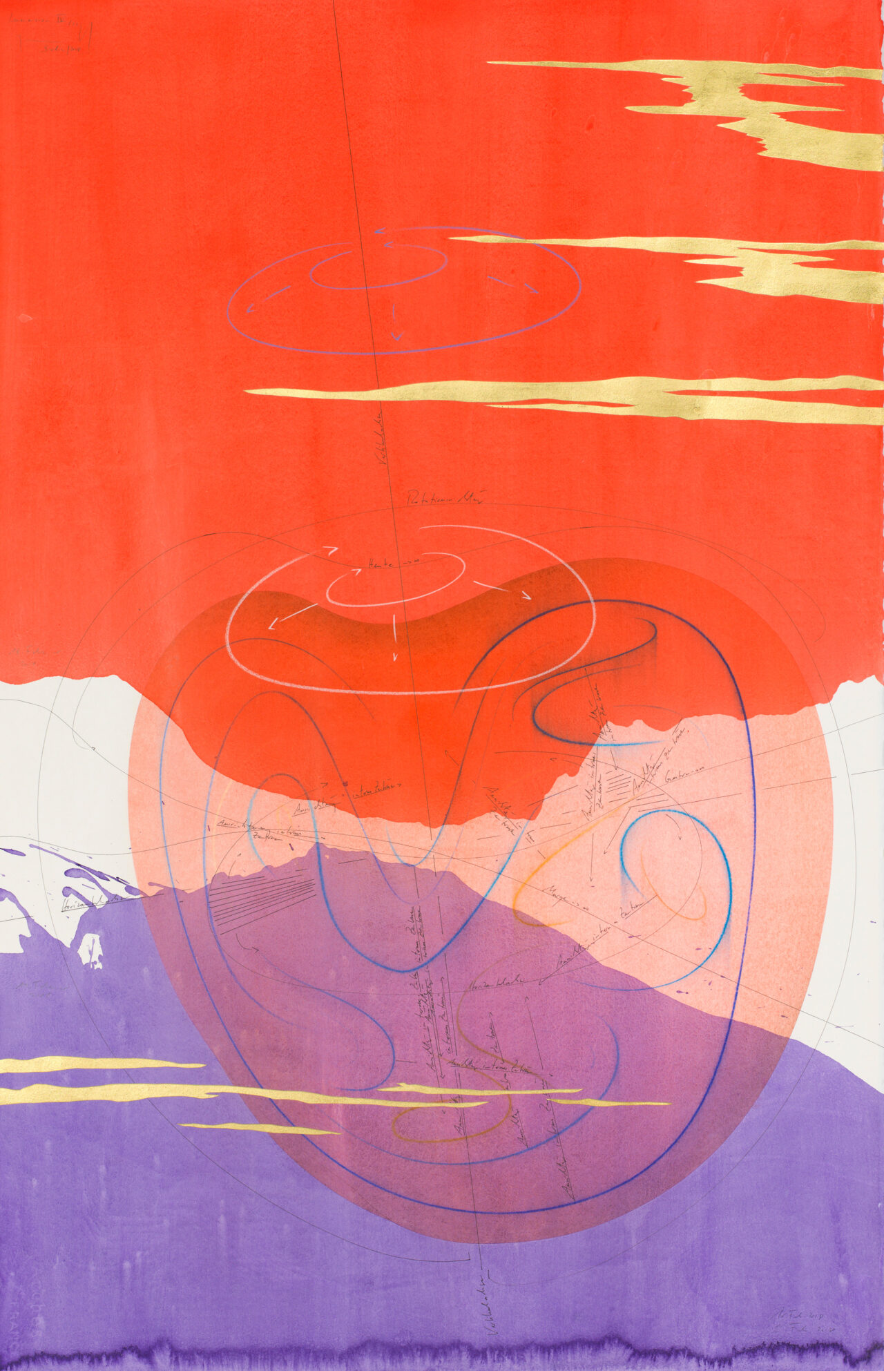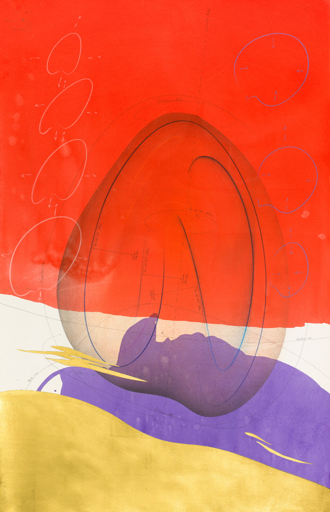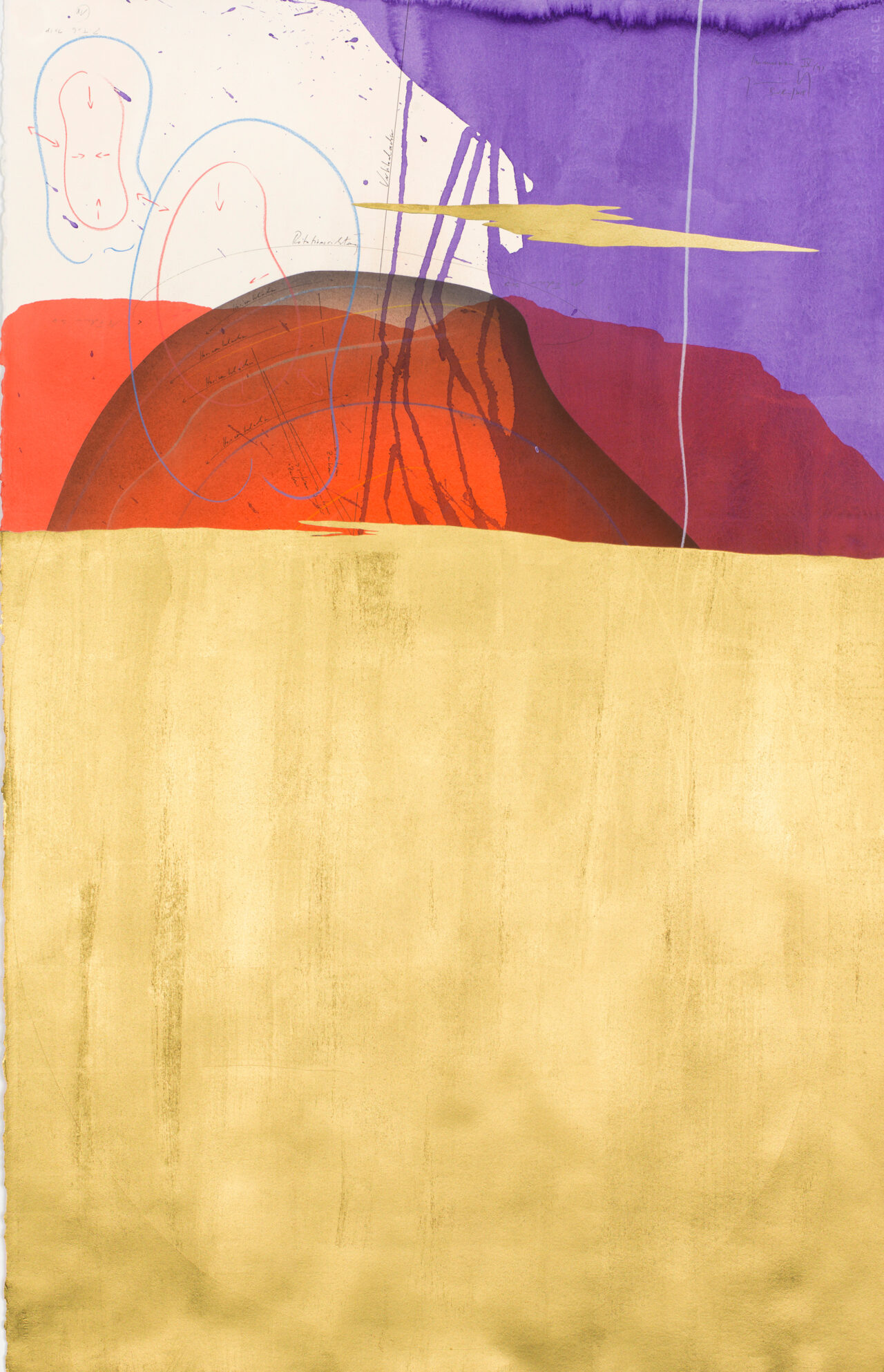 Ink, India ink, gold leaf, pastels, oil chalks, graphite on paper, unique, signed