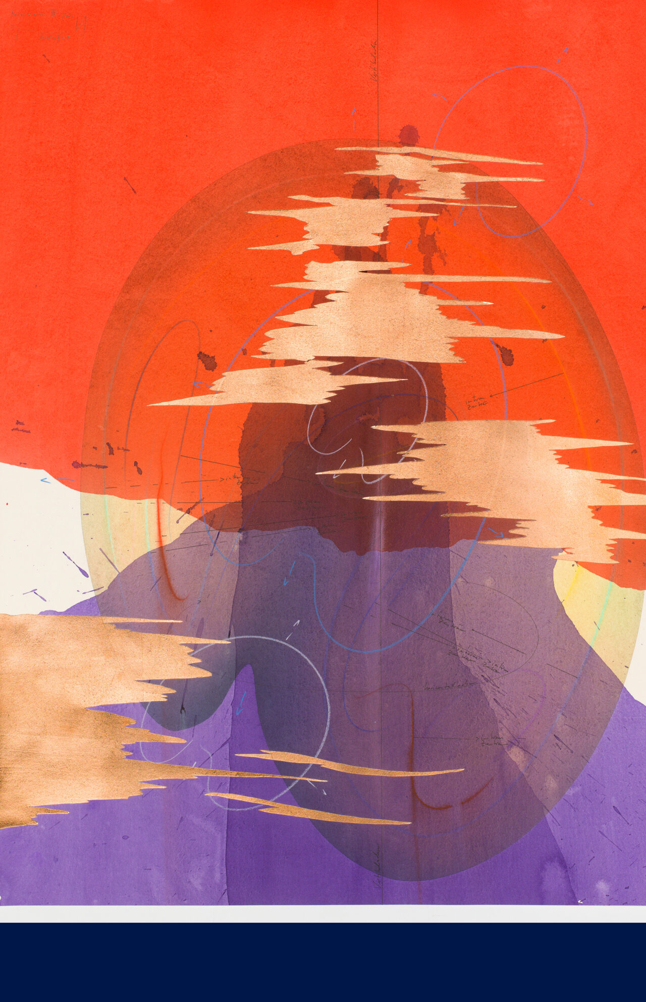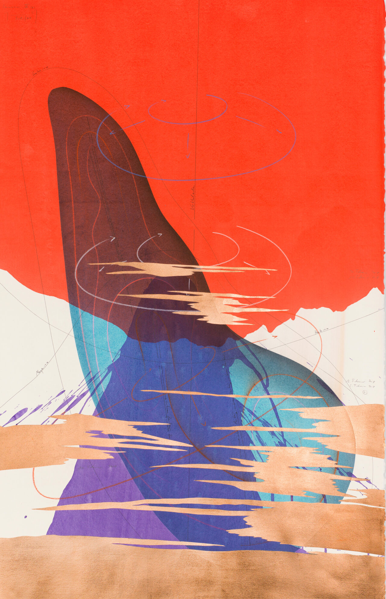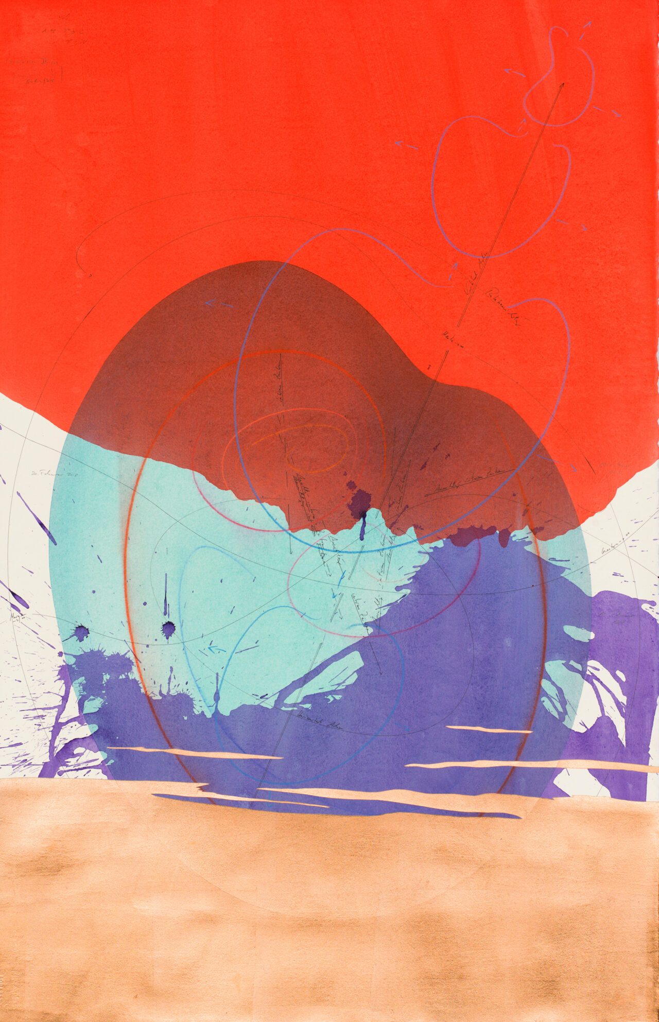 Ink, India ink, copper leaf, pastels, oil chalks, graphite on paper, unique, signed