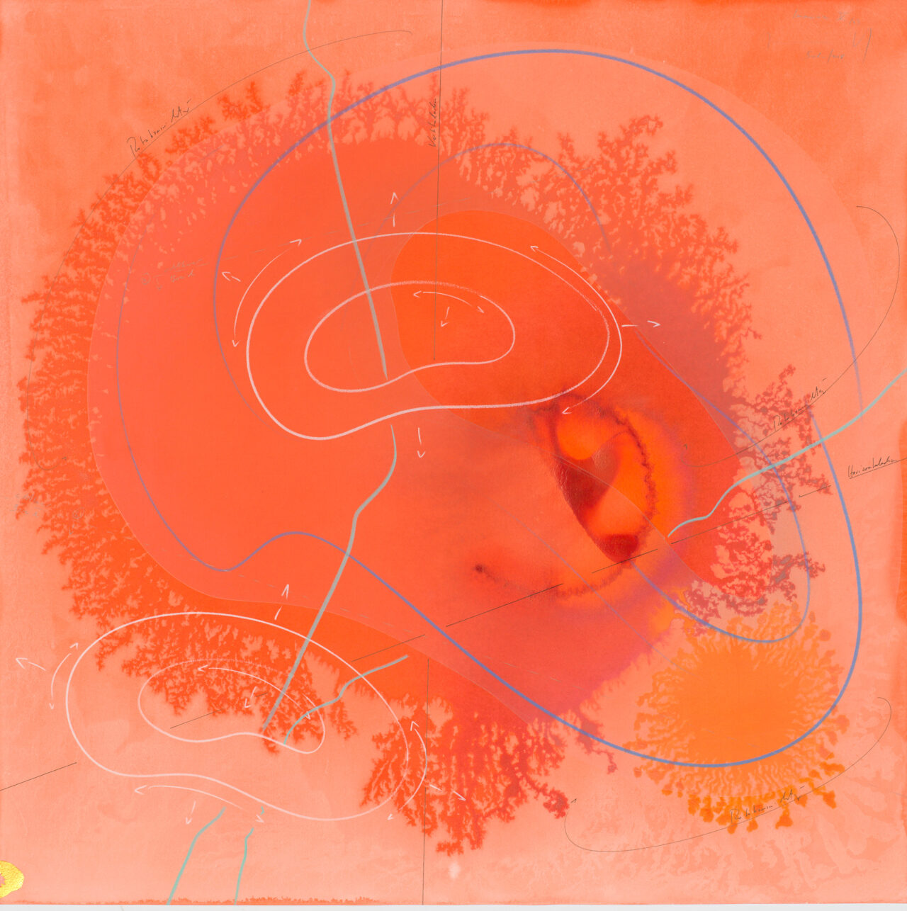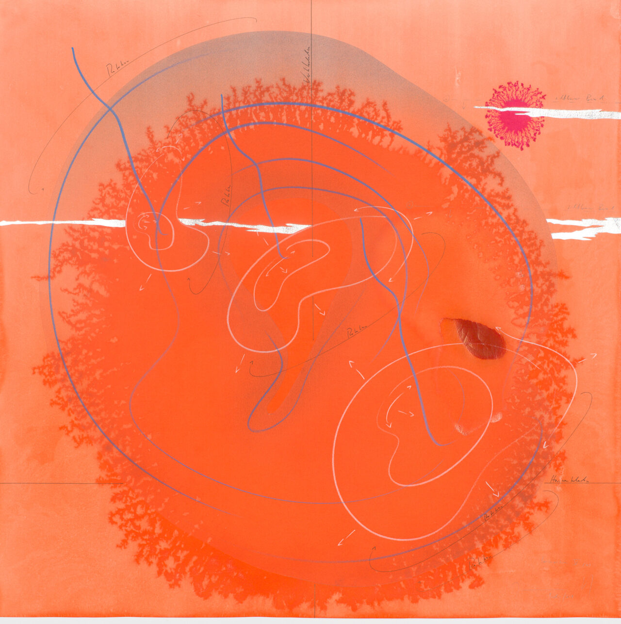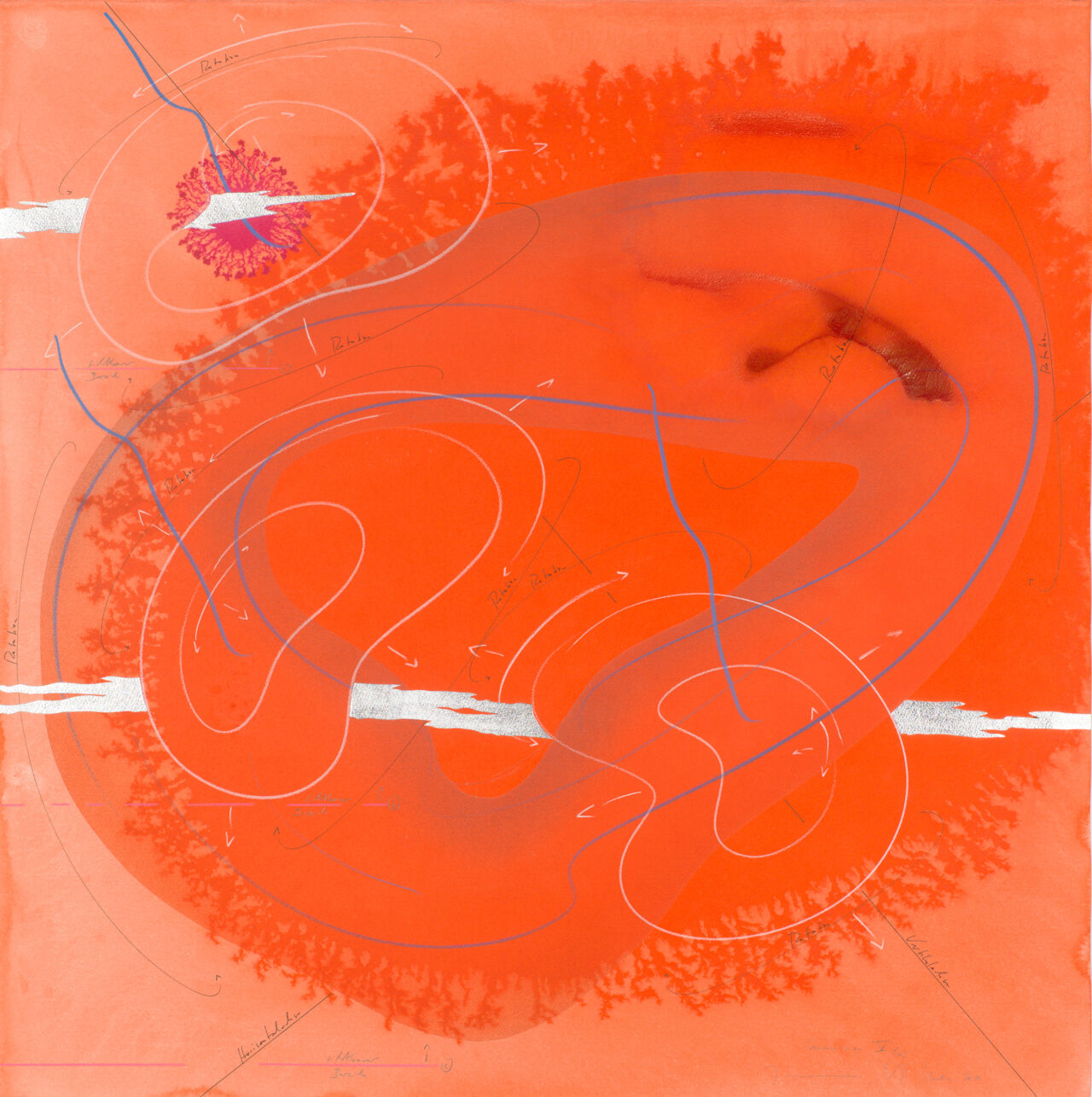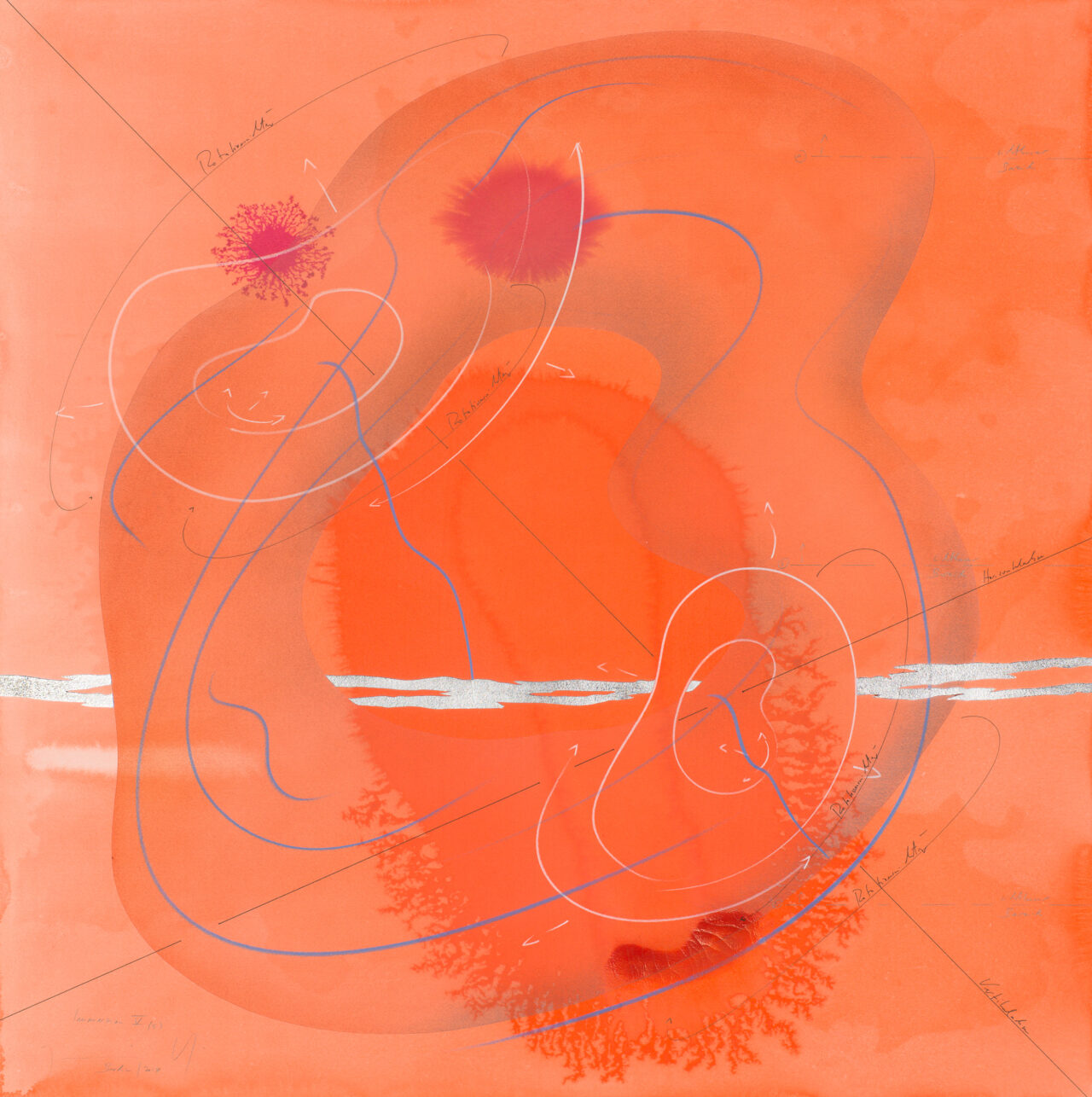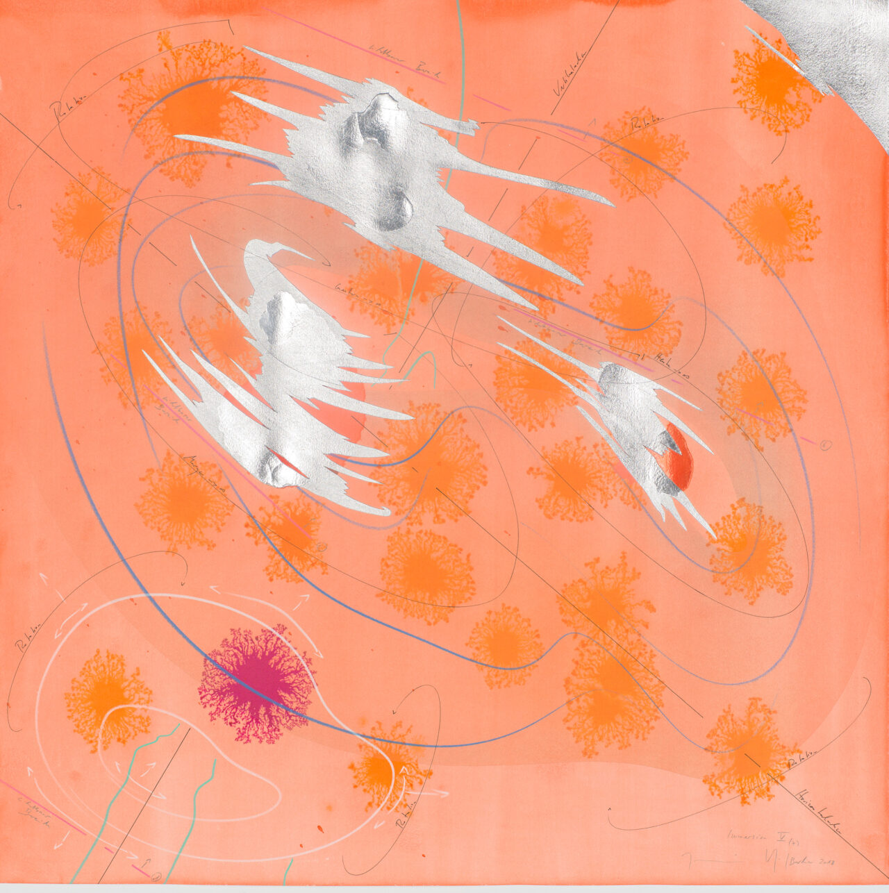 Ink, India ink, aluminium leaf, pastels, oil chalks, graphite on paper, unique, signed