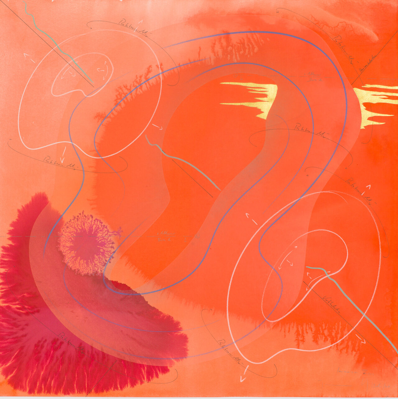 Ink, India ink, gold leaf, pastels, oil chalks, graphite on paper, unique, signed