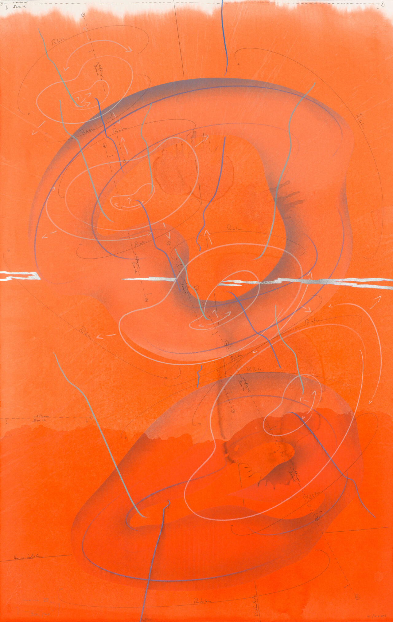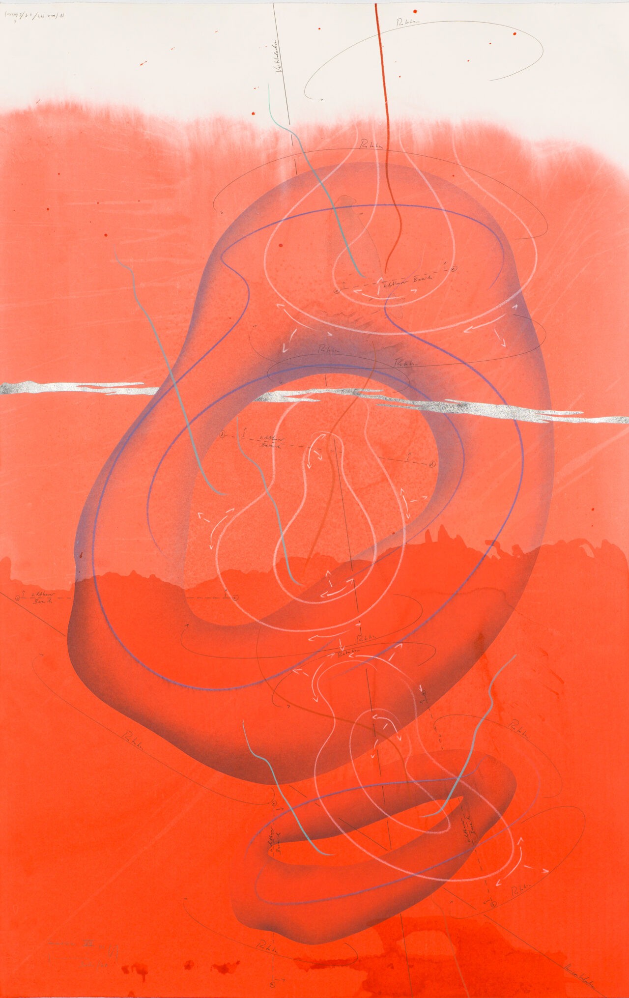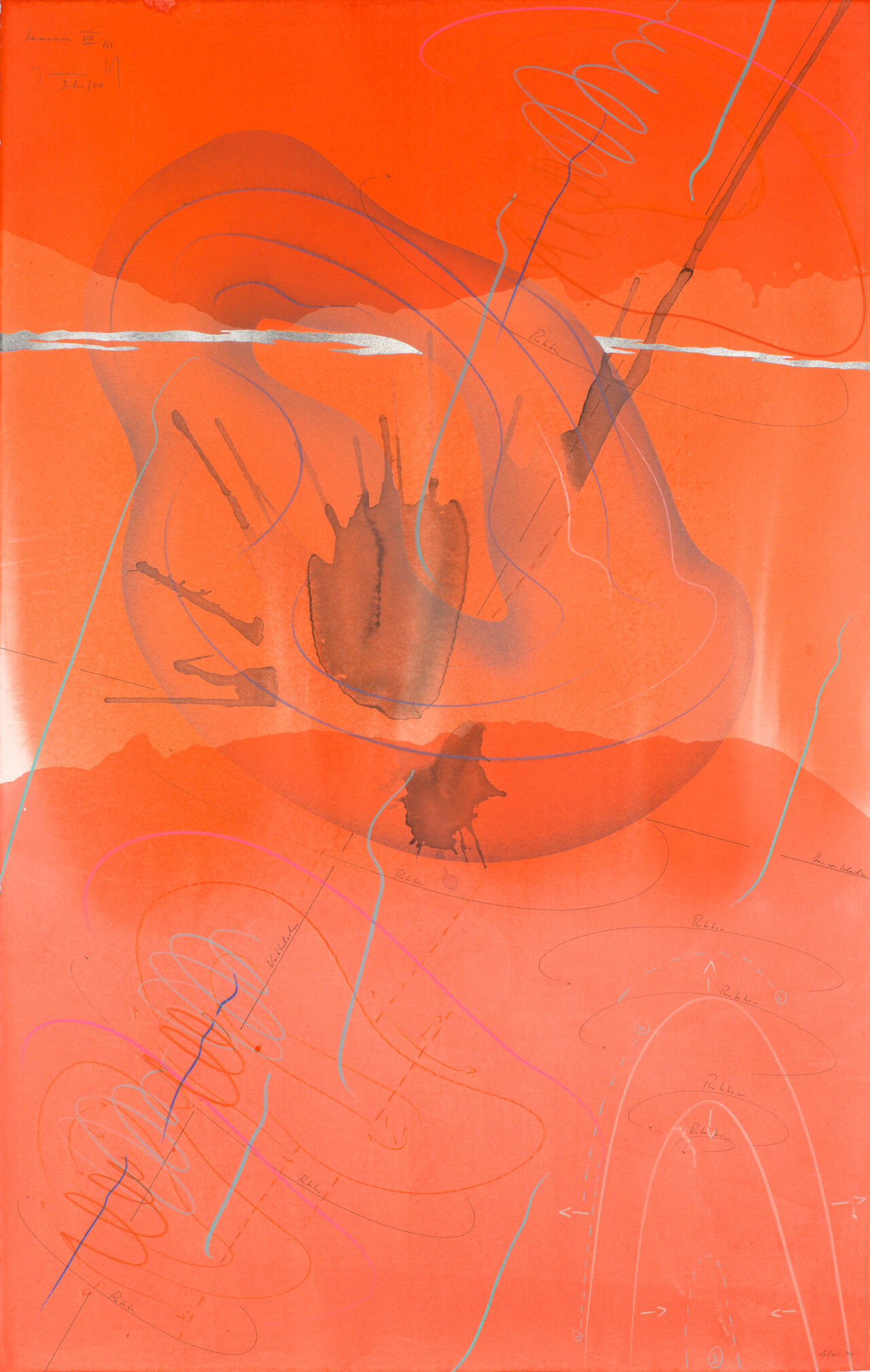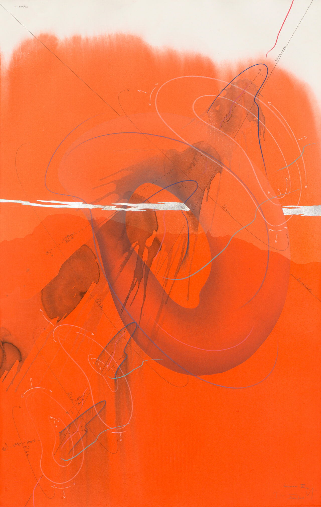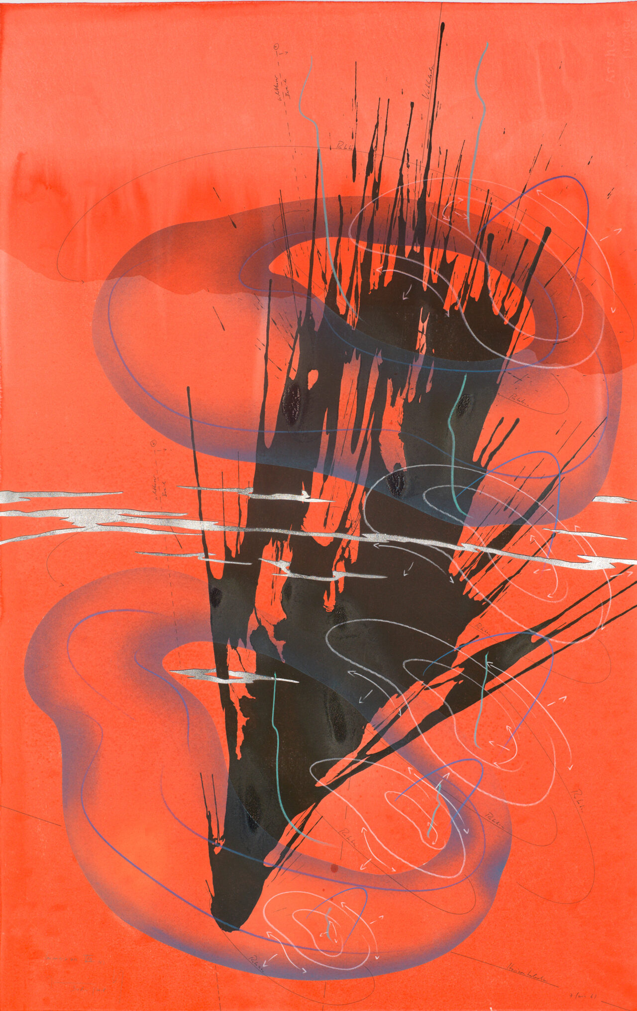 Ink, India ink, aluminium leaf, pastels, oil chalks, graphite on paper, unique, signed