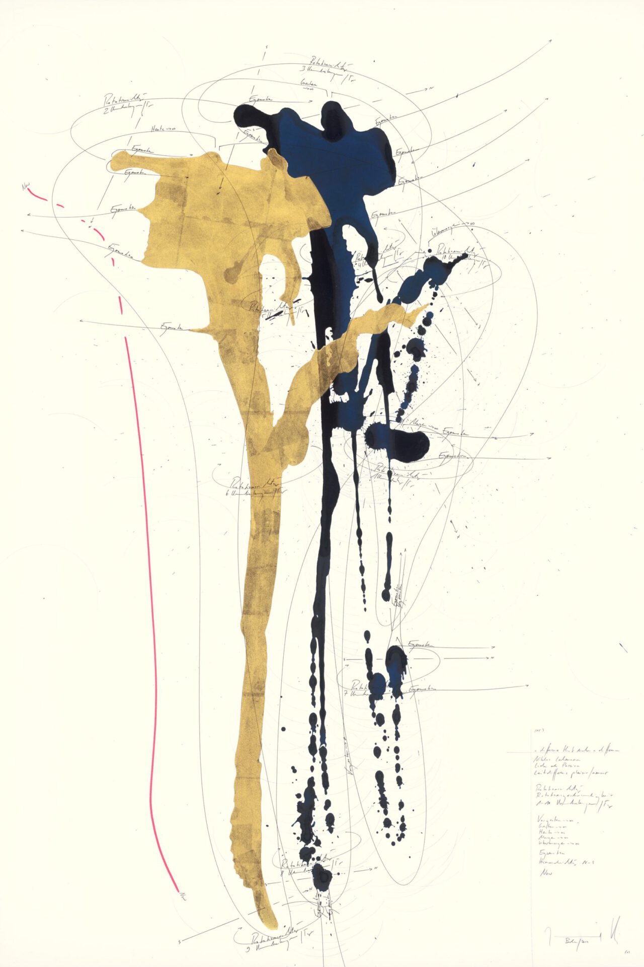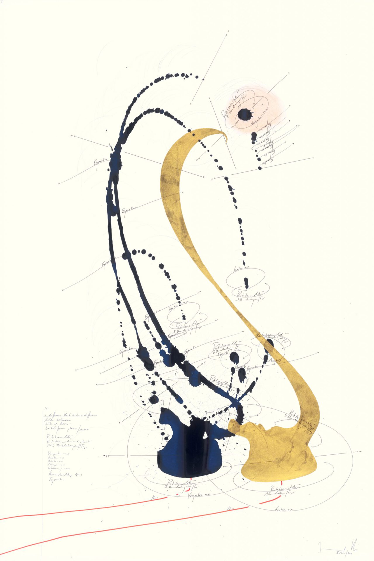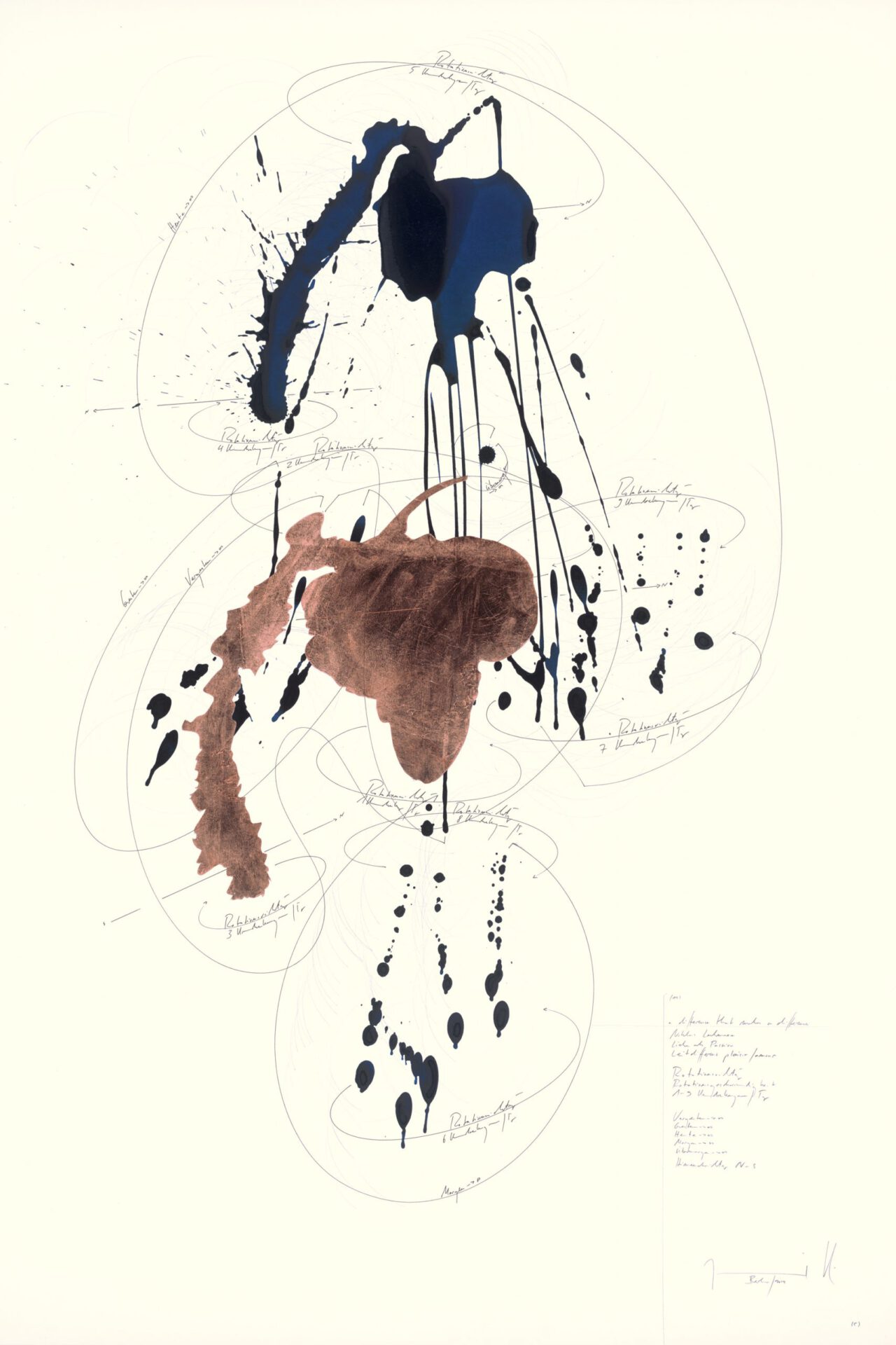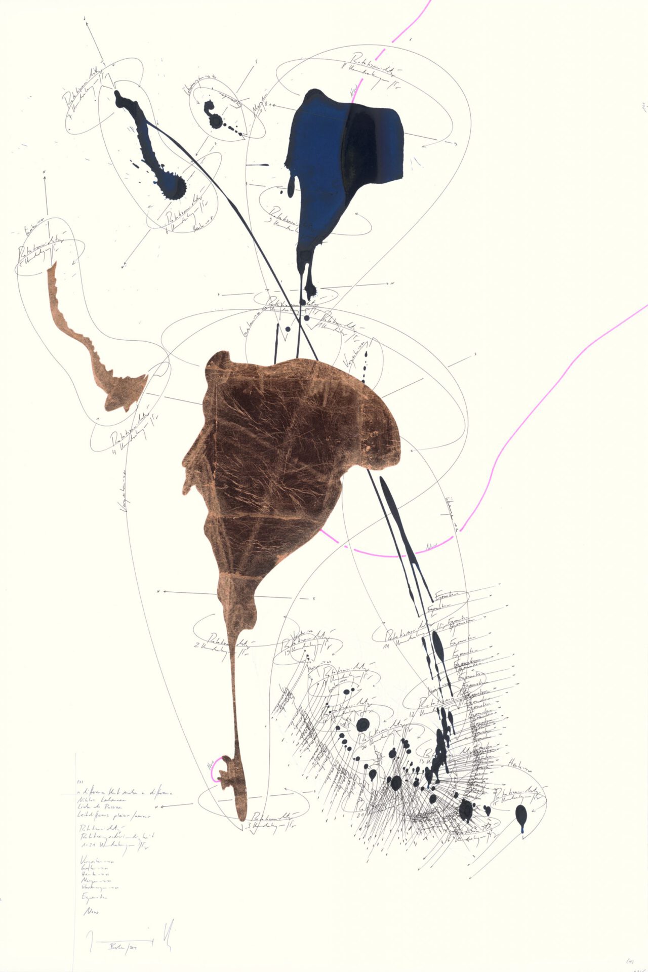 Ink, copper leaf, graphite, pastels, oil chalks, unique, signed