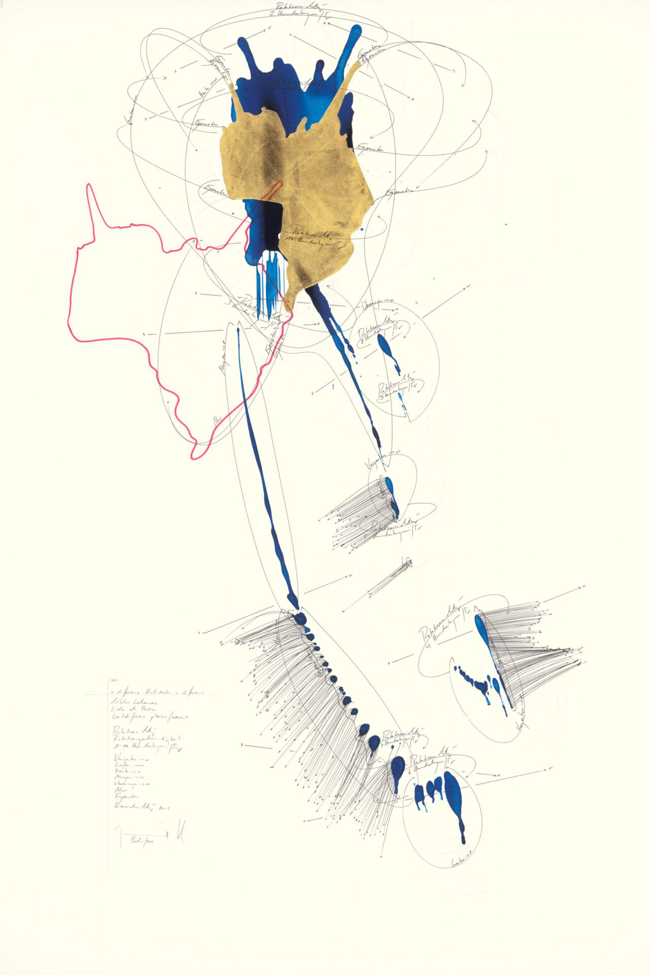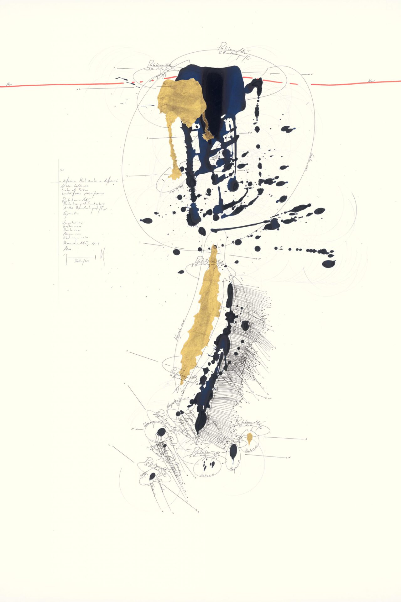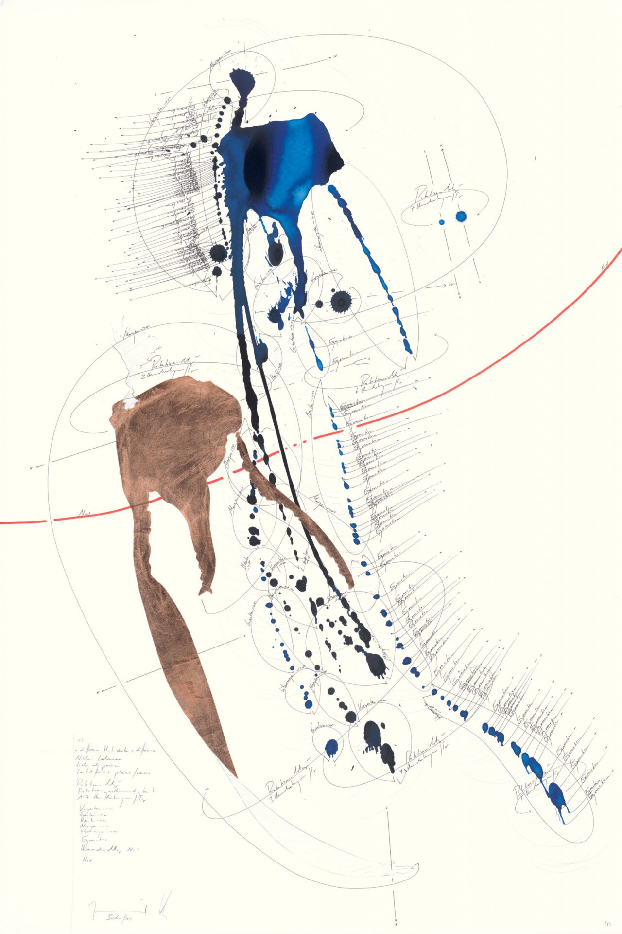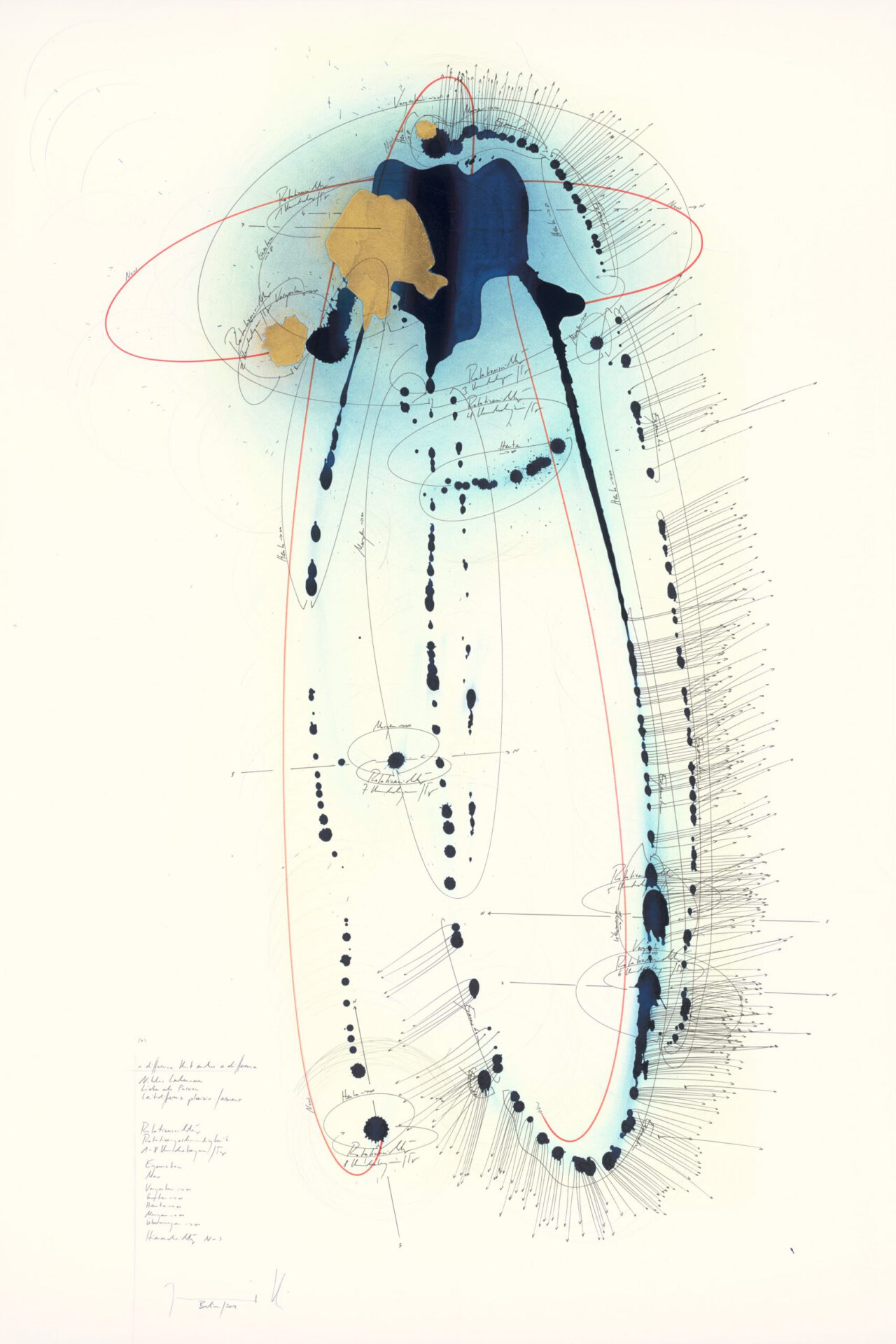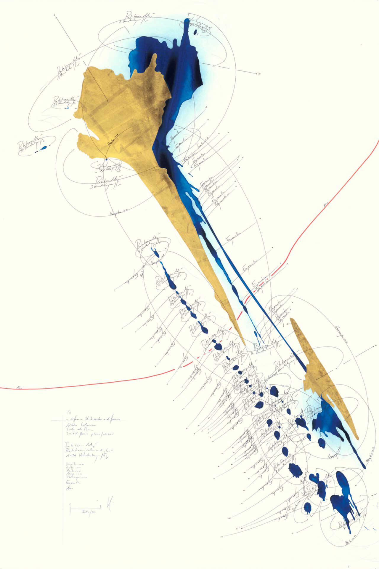 Ink, copper leaf, graphite, pastels, oil chalks, unique, signed
