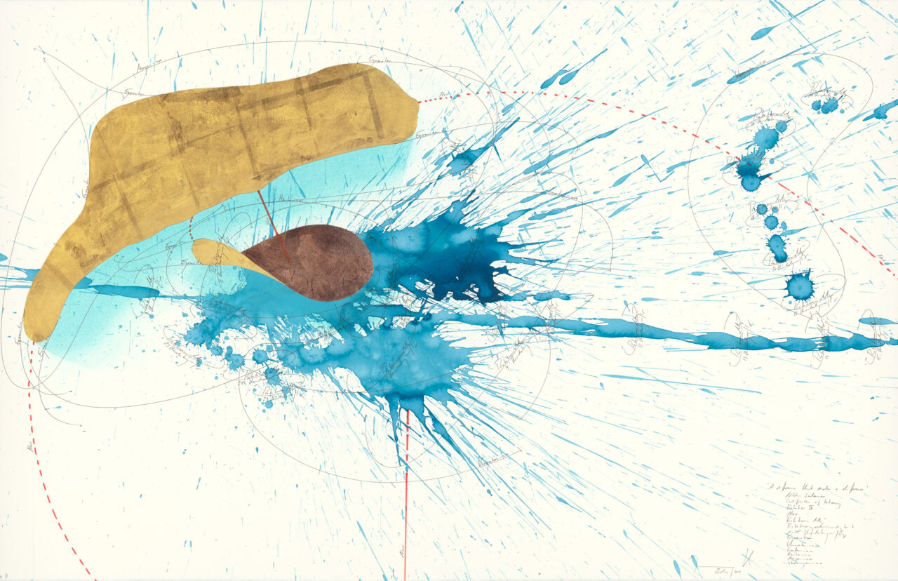 Ink, gold leaf, pastels, oil chalks, India ink, graphite on paper, unique, signed