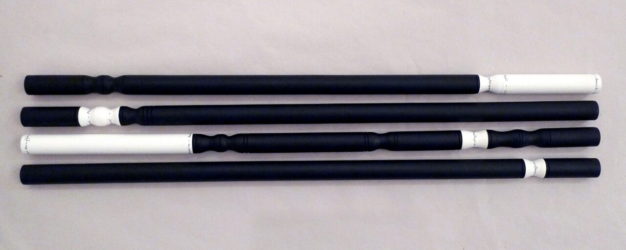4 gedrechselte Holzstangen, Acryl, beschriftet mit Permanentmarker, 1 DIN A4 Blatt, Laserdruck, Tinte, Unikat, Signiert