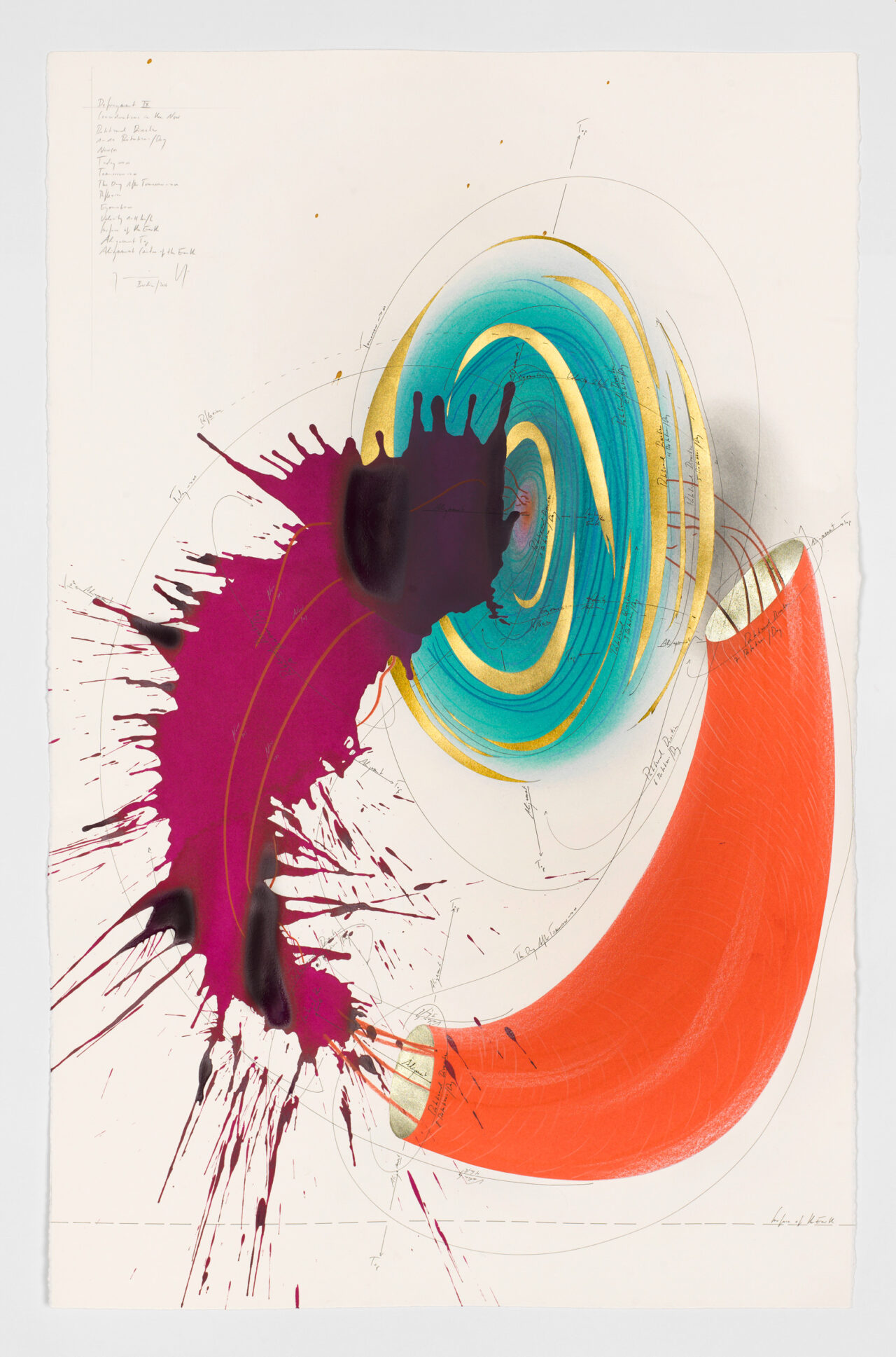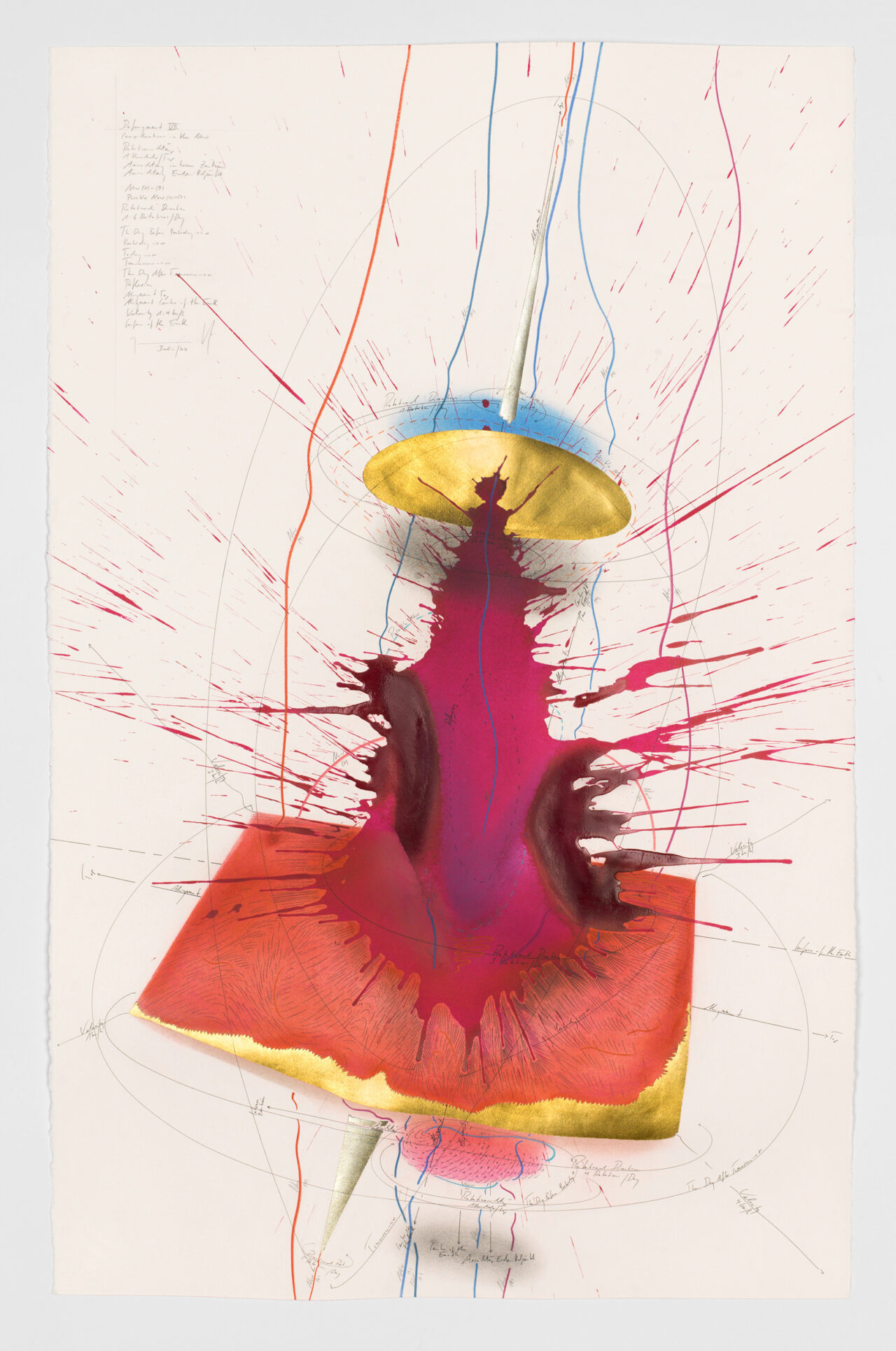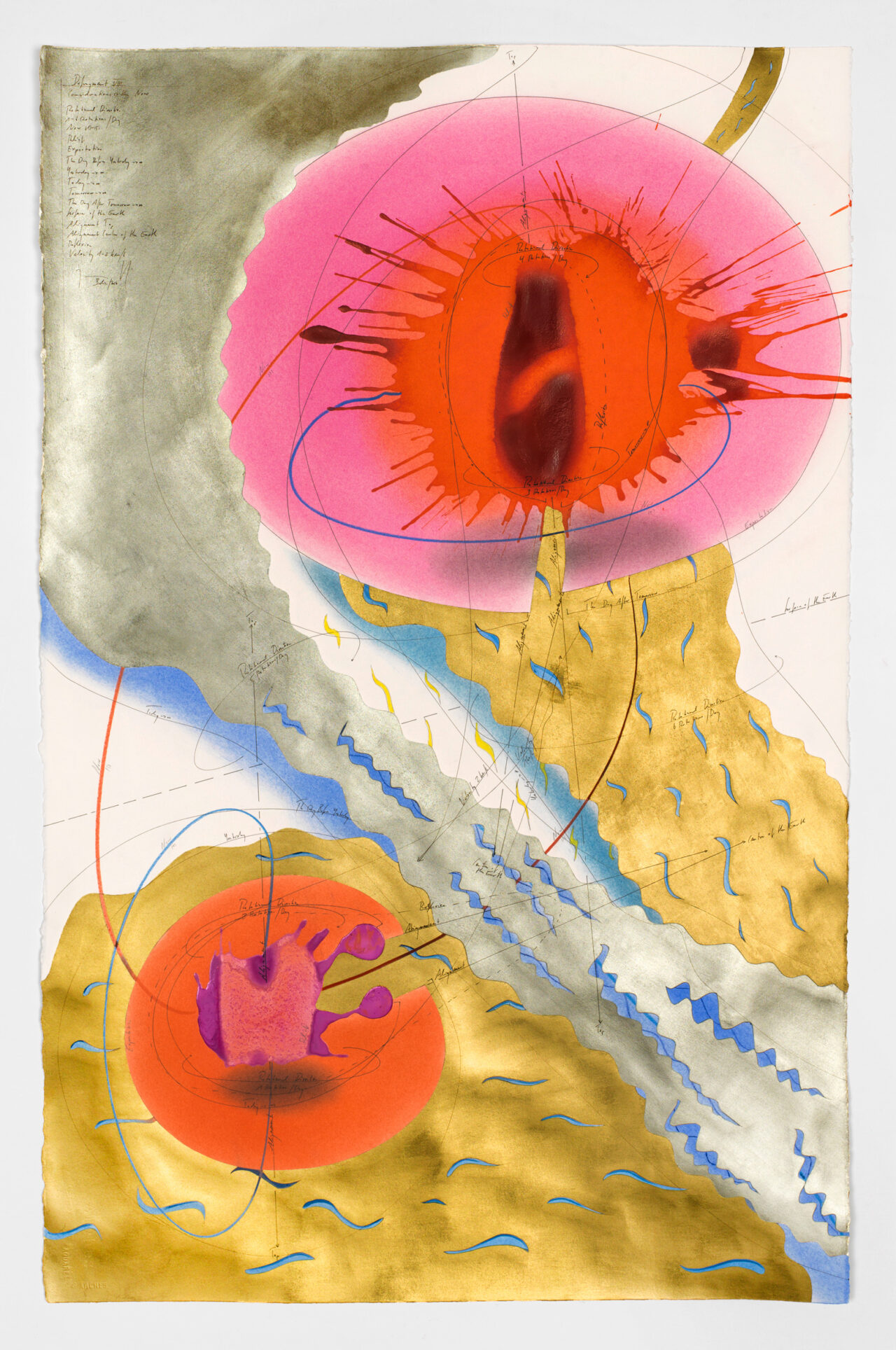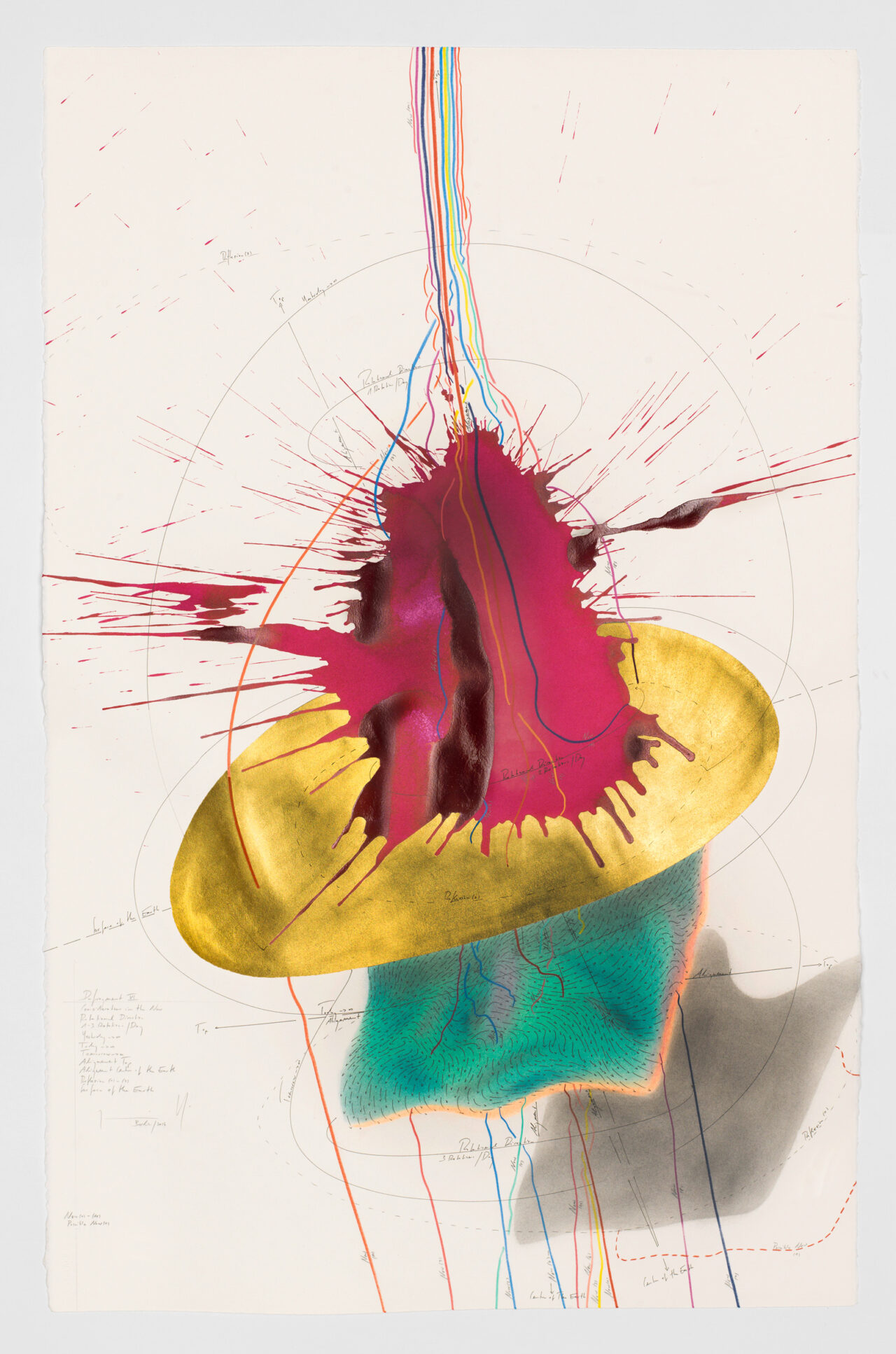 Ink, gold leaf, oil chalks, pastels, pencil on paper, unique, signed