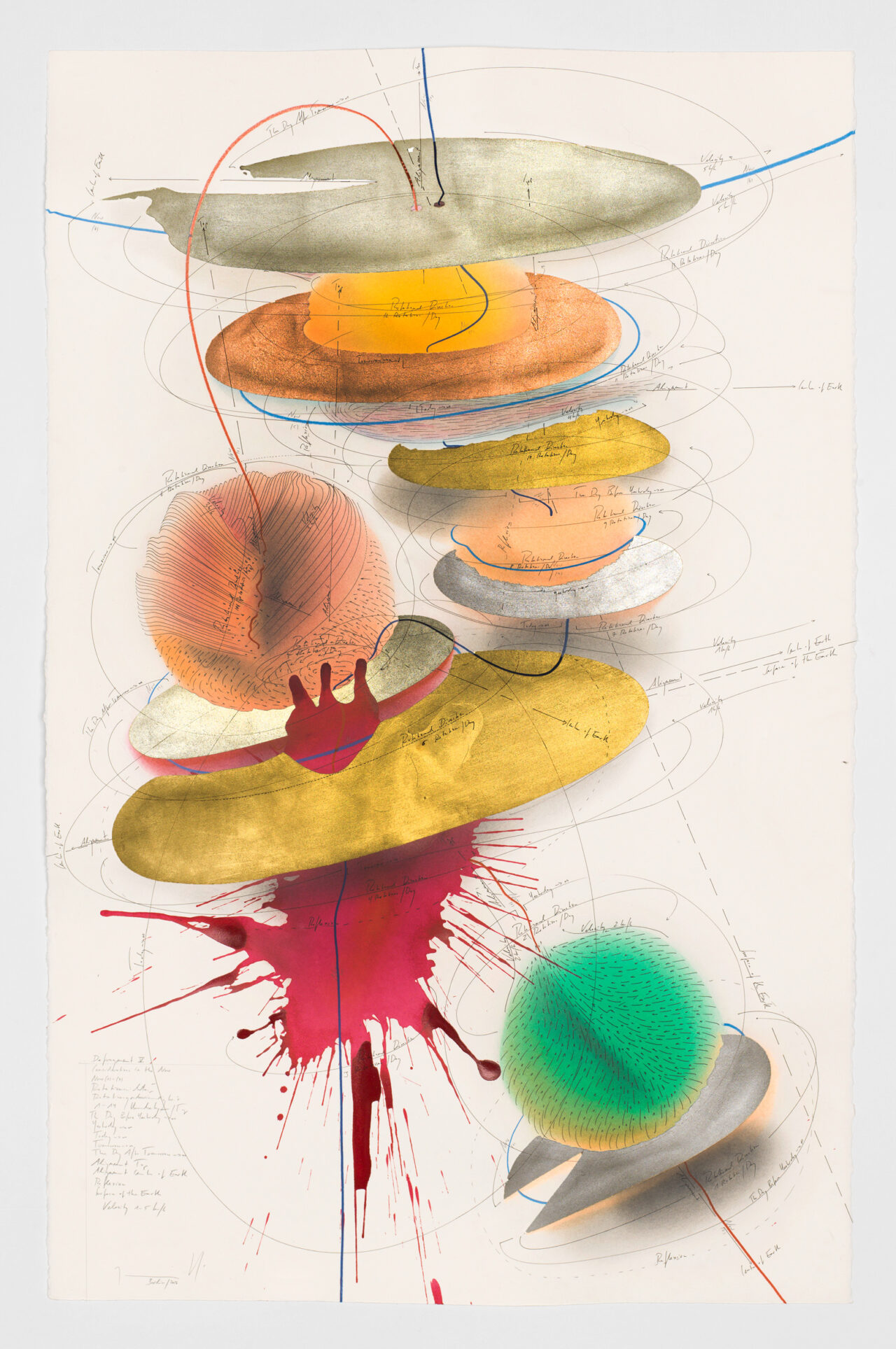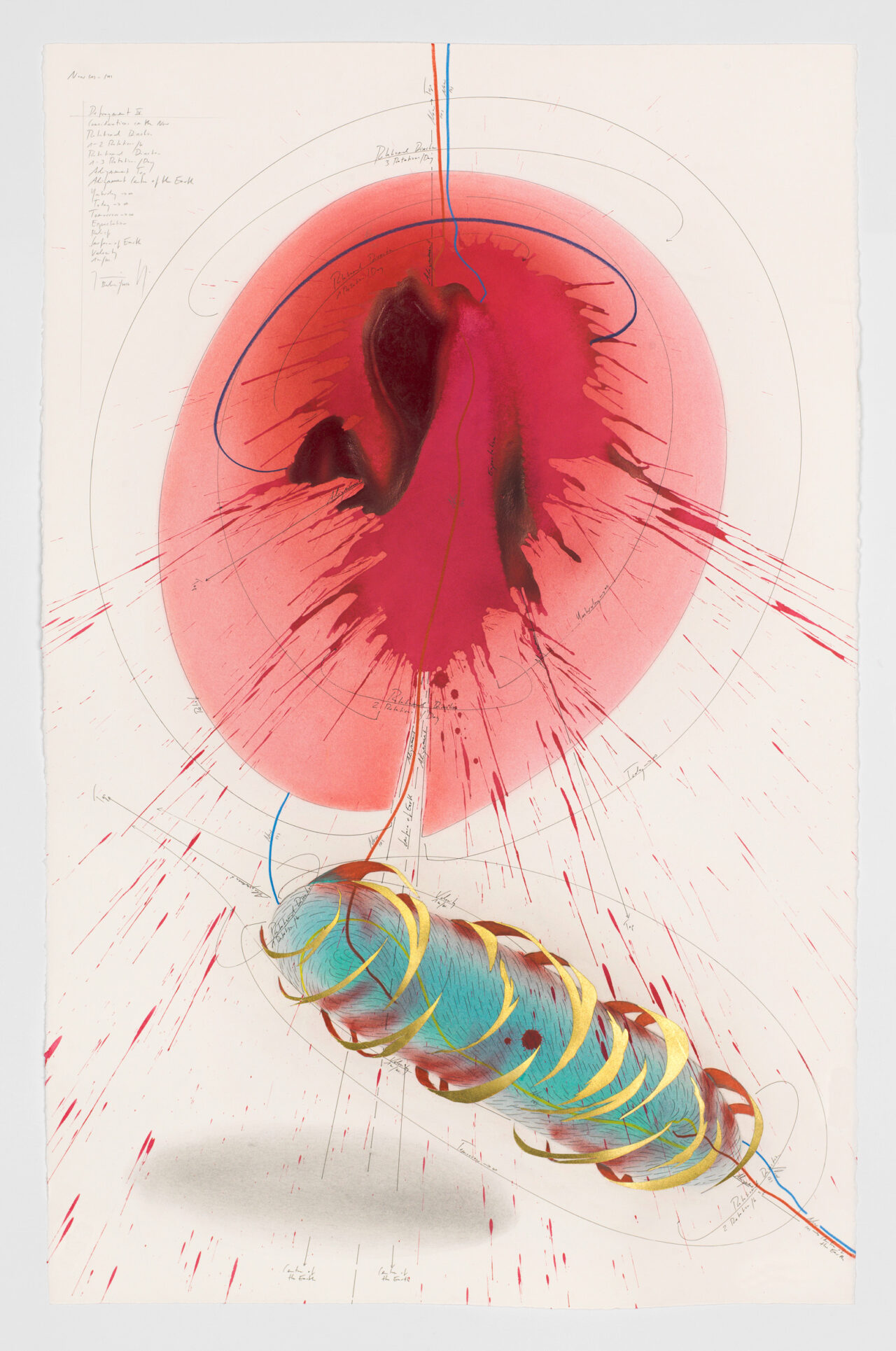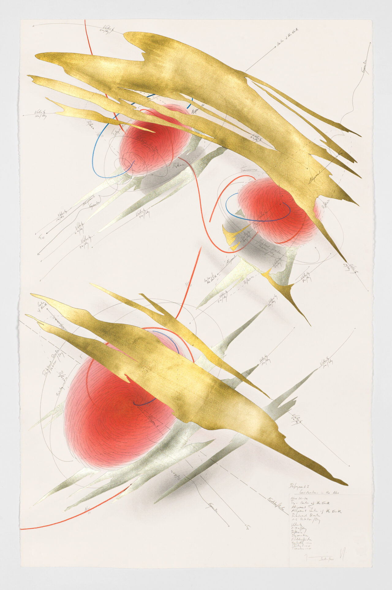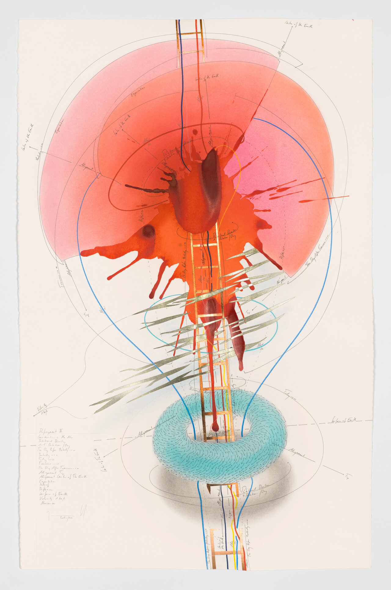 Ink, gold leaf, oil chalks, pastels, pencil on paper, unique, signed