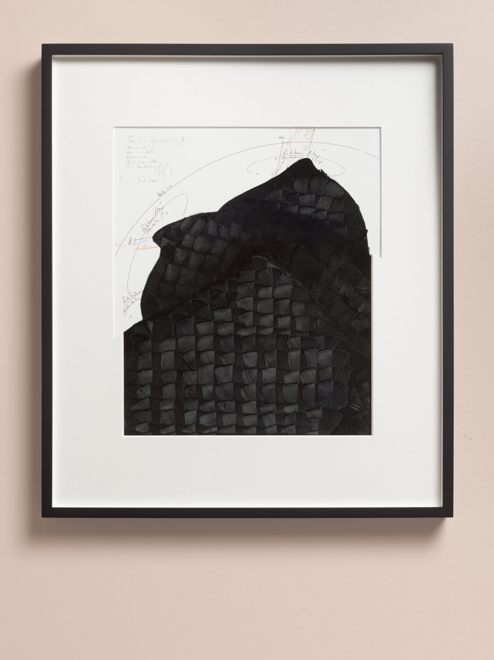 ink, india ink, feathers, oil chalk, graphite on cardboard, unique, signed