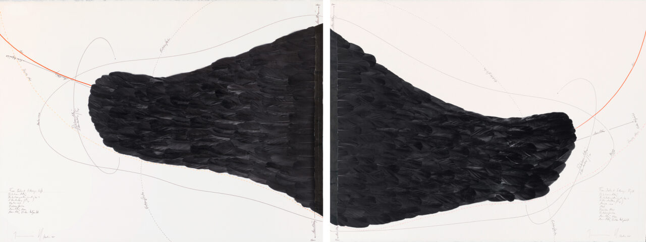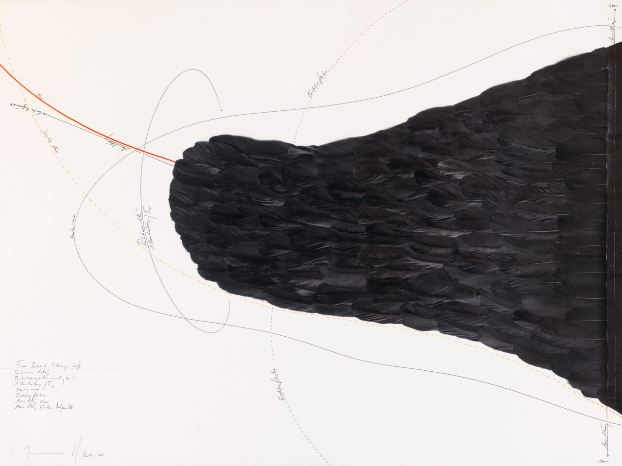 Ink, feathers, oil chalks, India ink, pencil on paper, unique, signed
