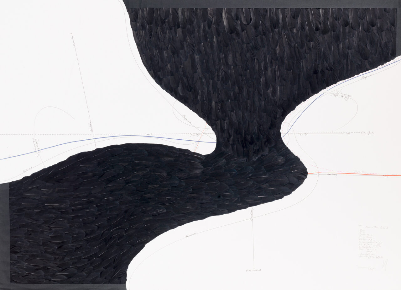Ink, feathers, oil chalks, pencil on paper, unique, signed