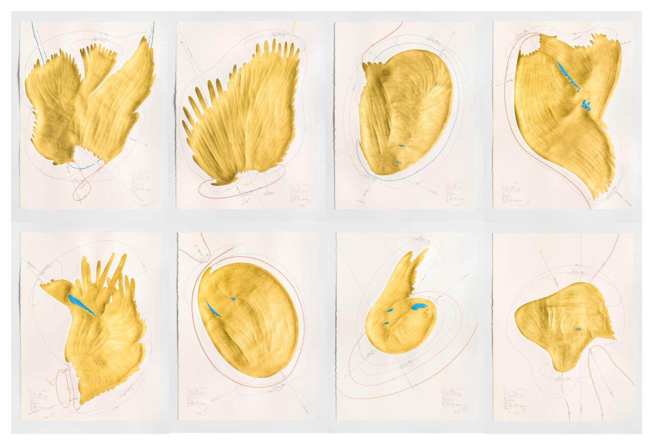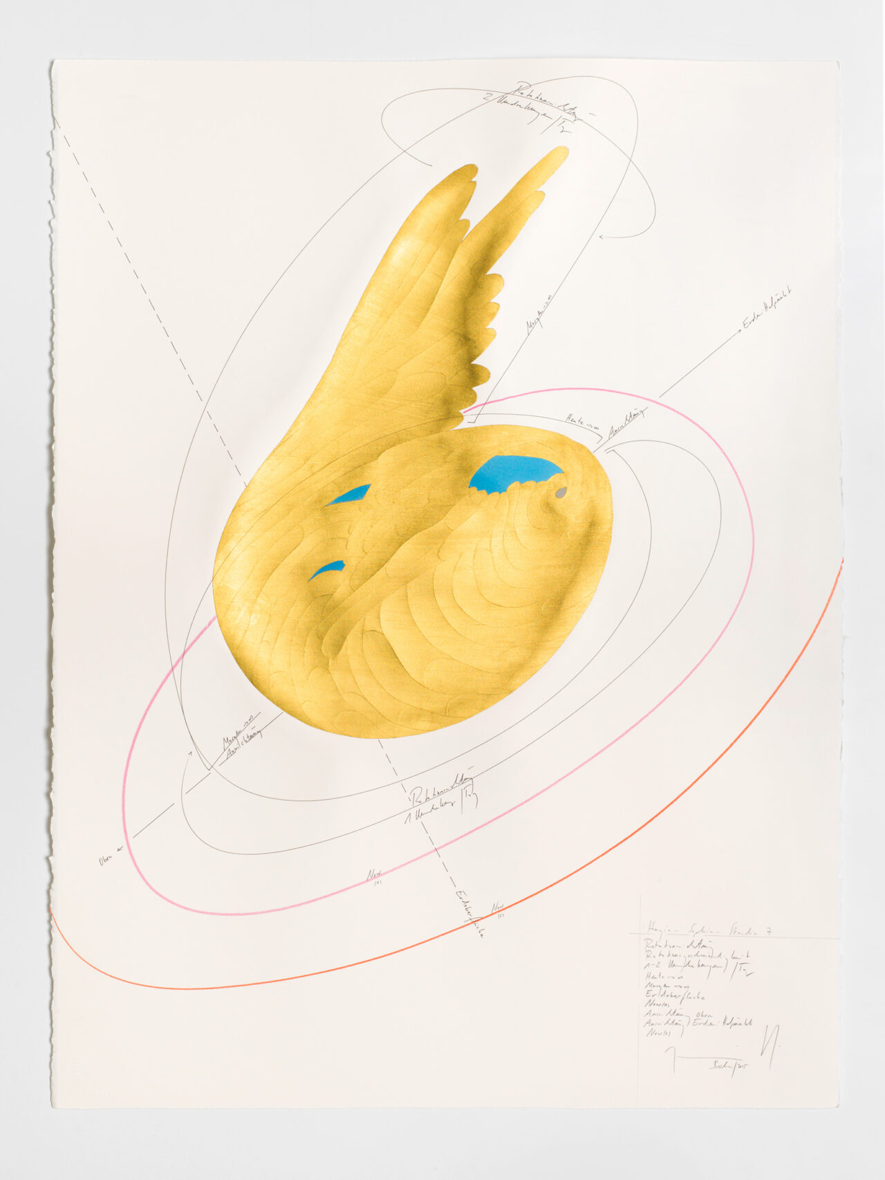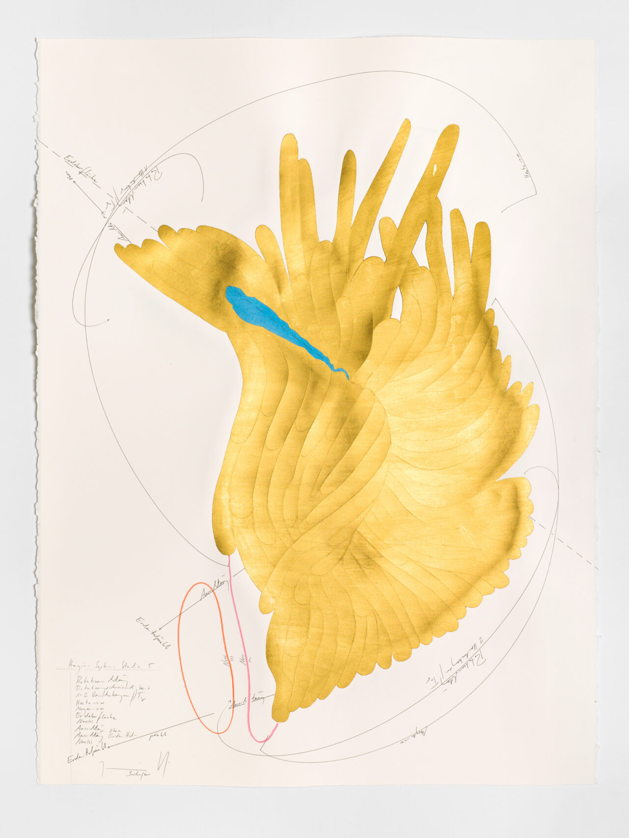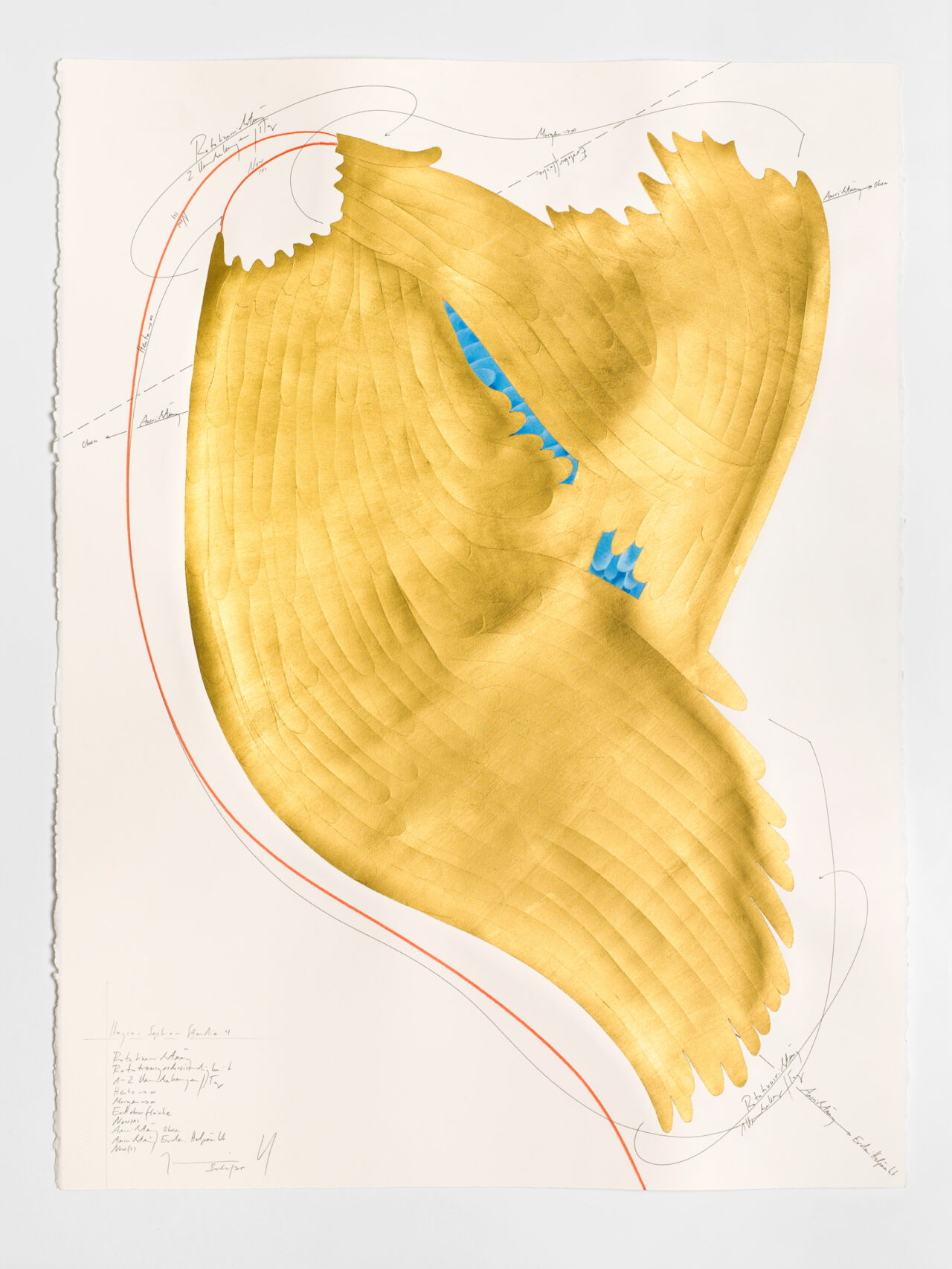 Ink, oil chalks, gold leaf, pastels, pencil on paper, unique, signed