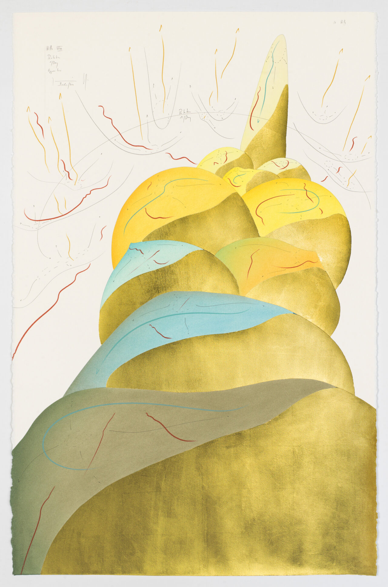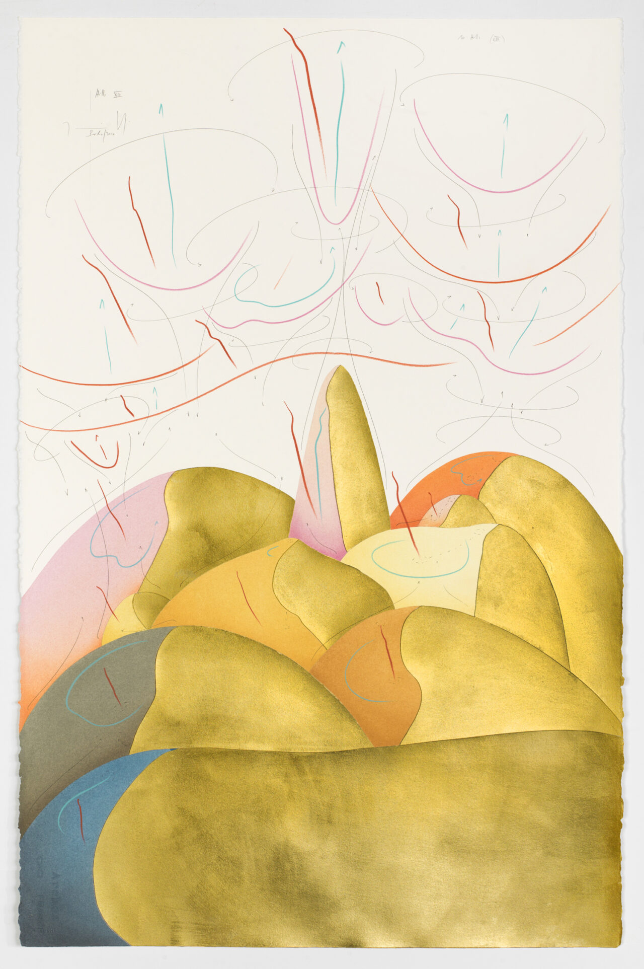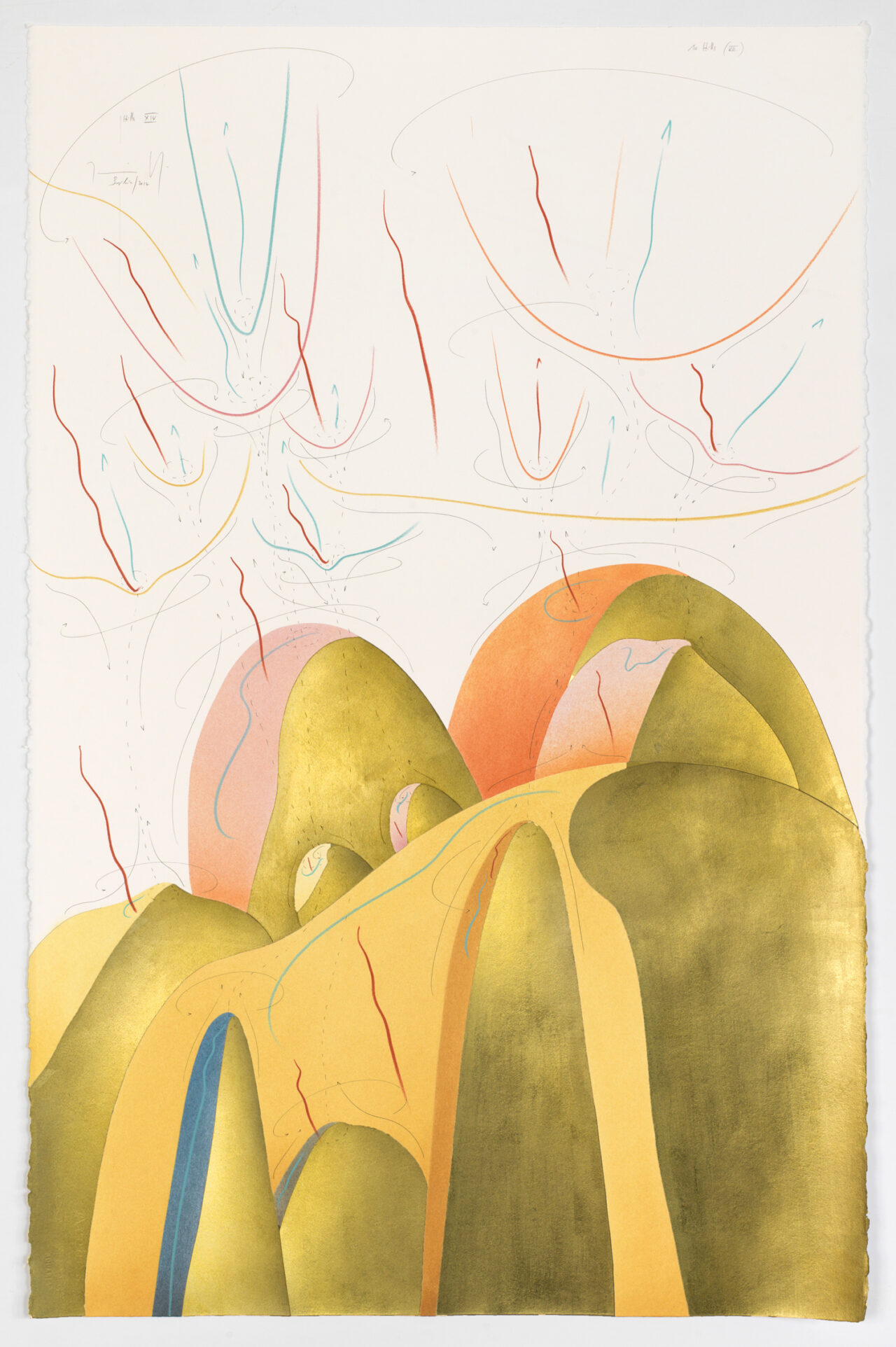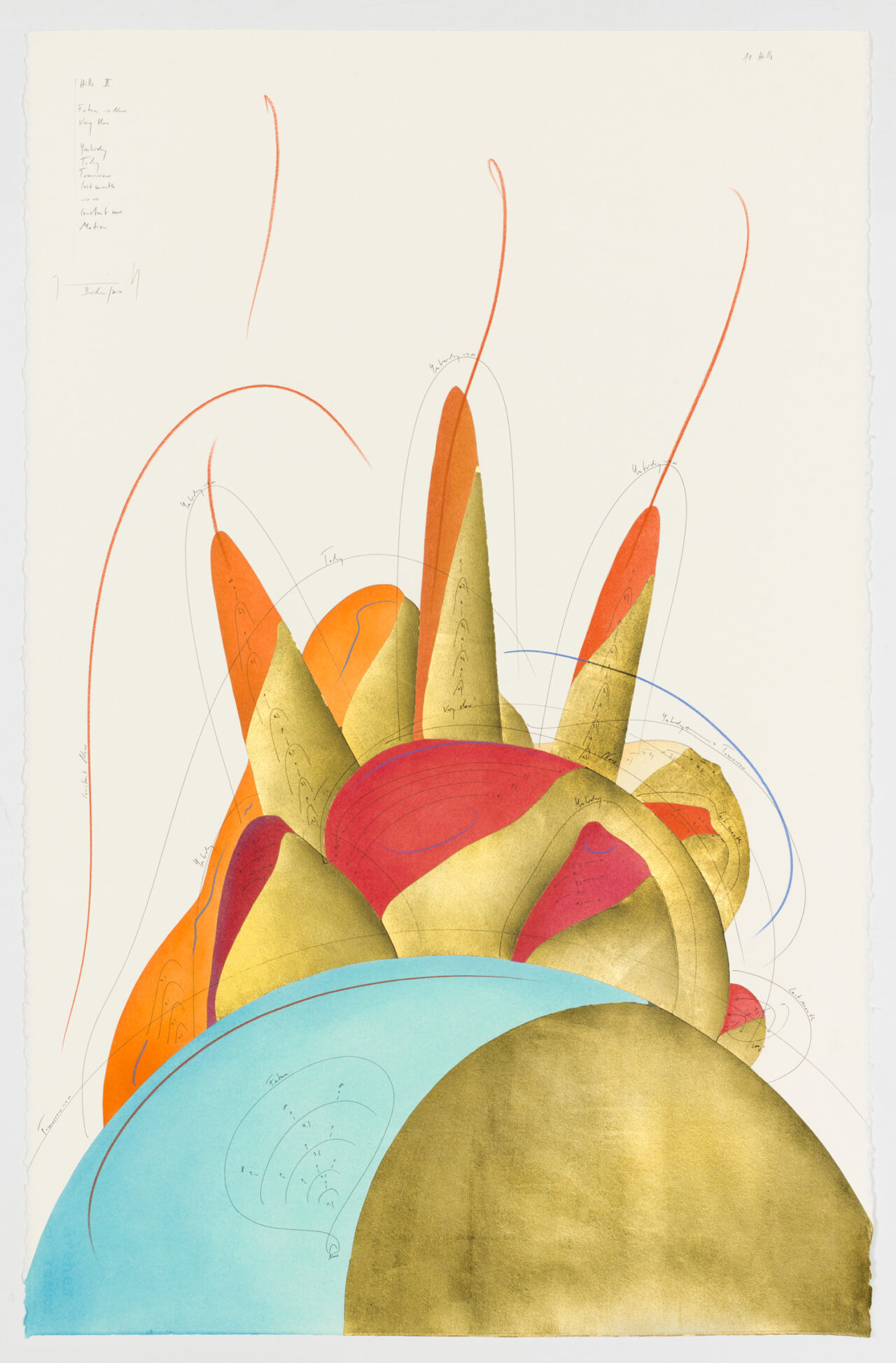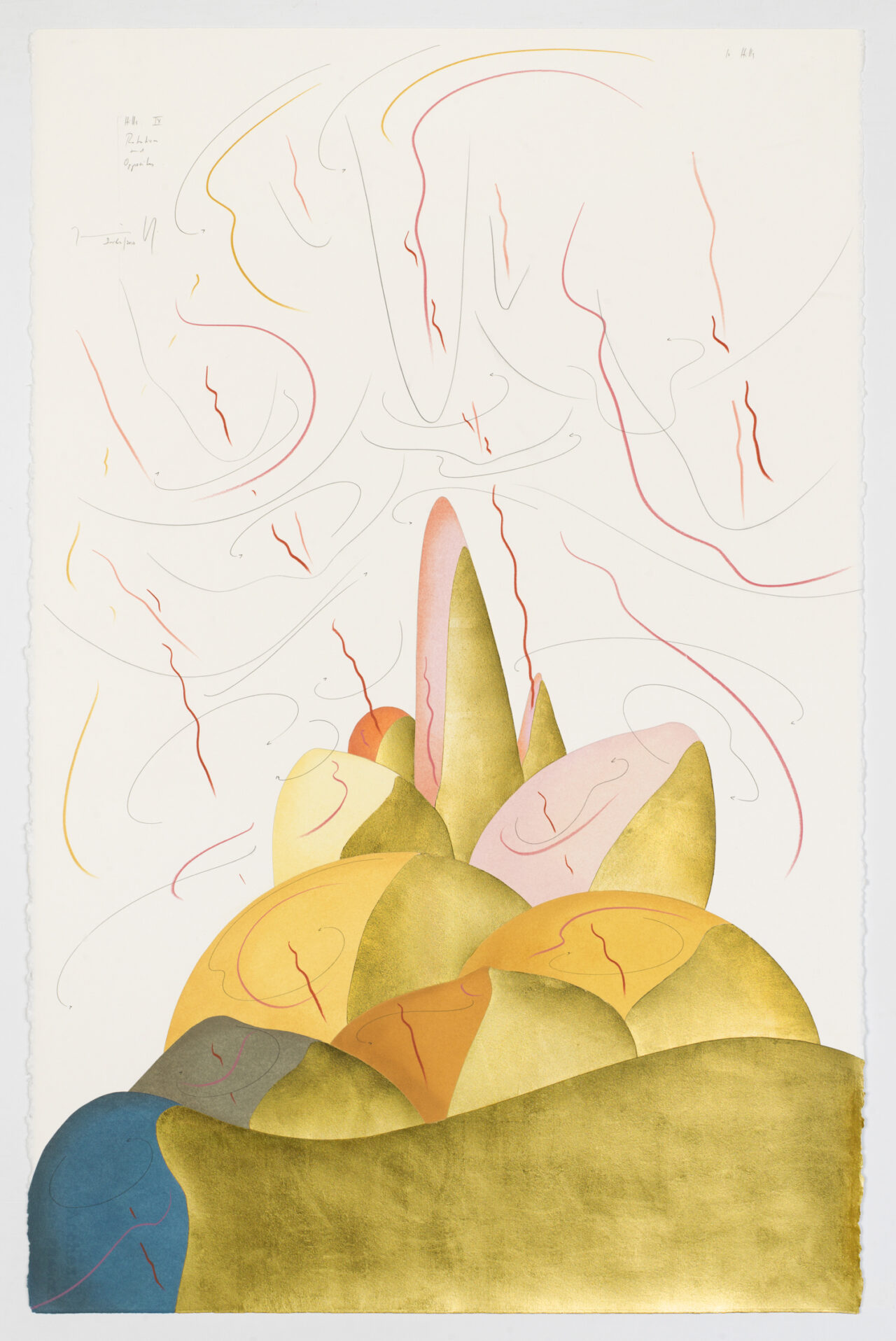 Ink, gold leaf, pastels, oil chalks, pencil on paper Unique work Signed
