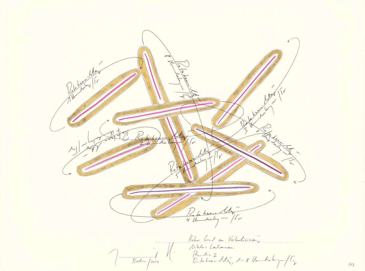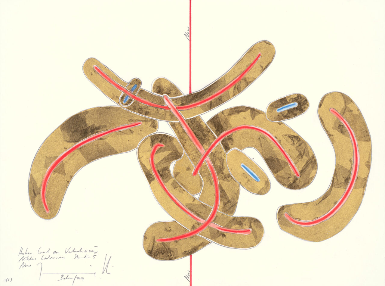 Ink, gold leaf, oil chalks, graphite on paper, unique, signed