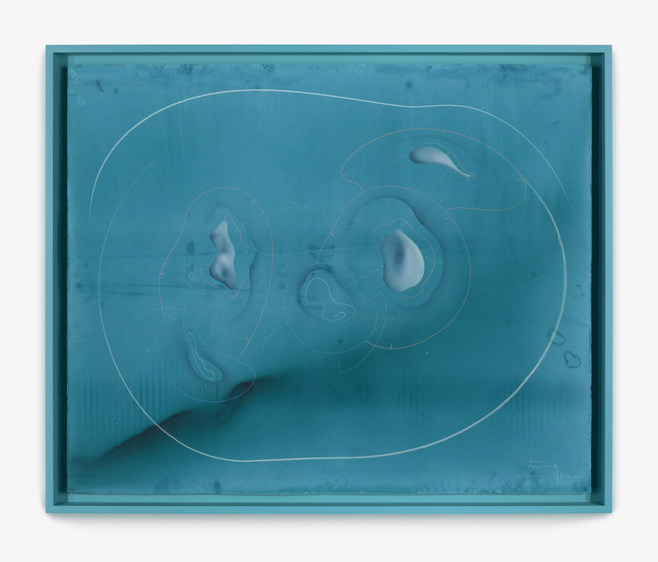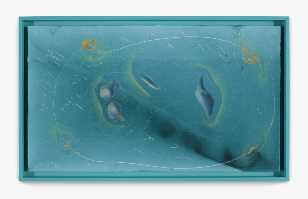 ink, oil chalks, gold leaf and pastel on paper, artist’s frame