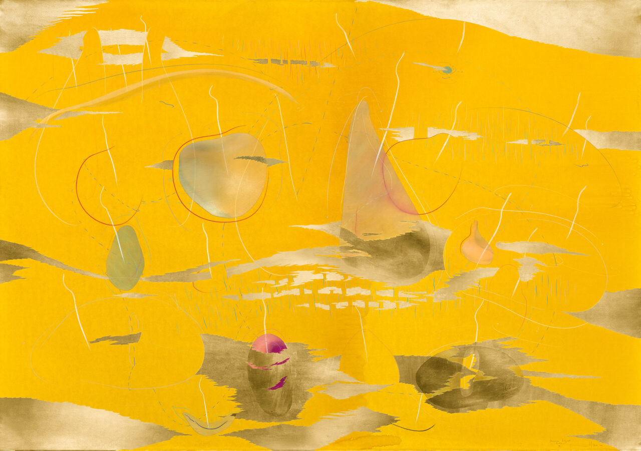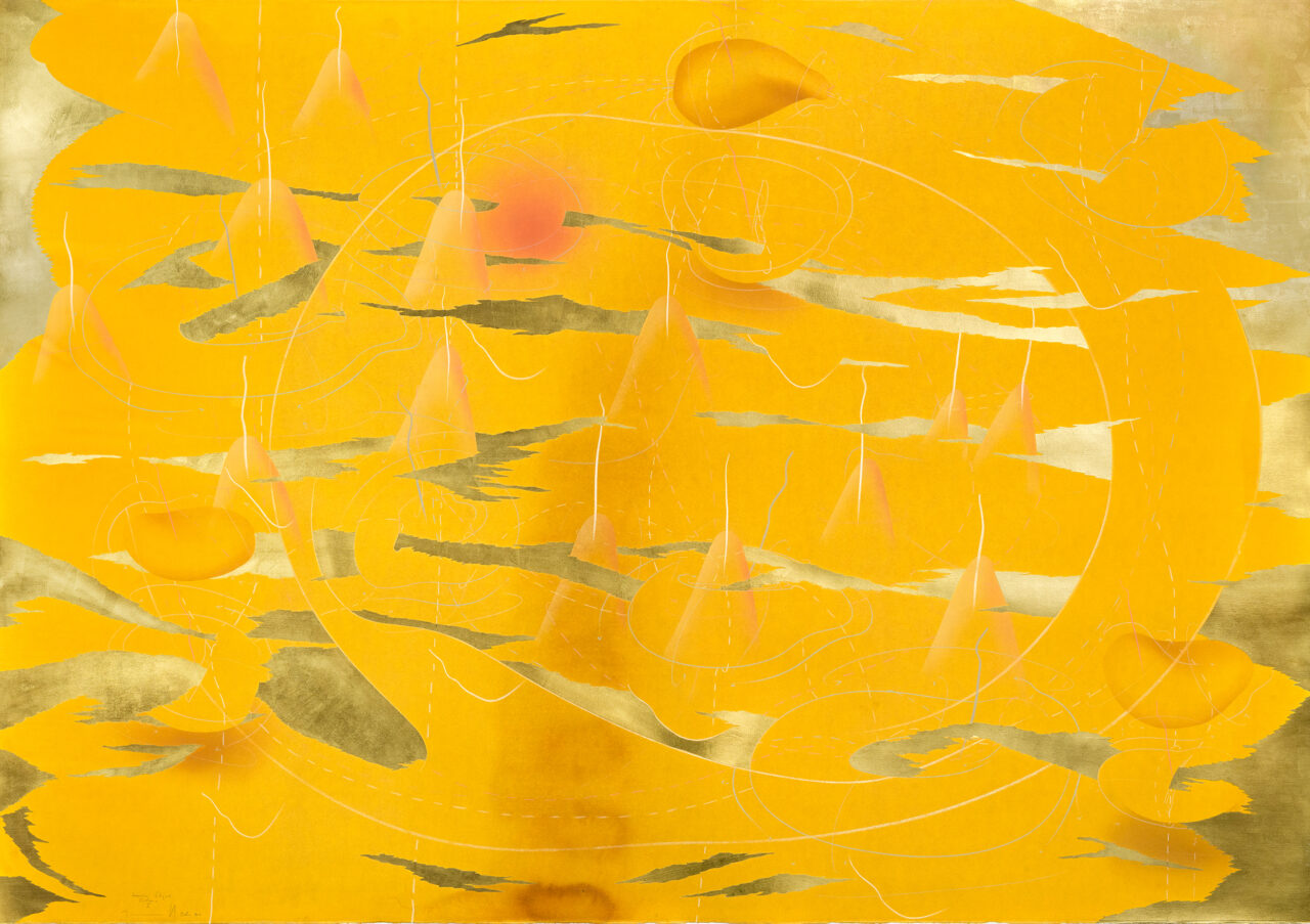 India ink, gold leaf, pastels, oil chalks, graphite on paper, unique work, signed