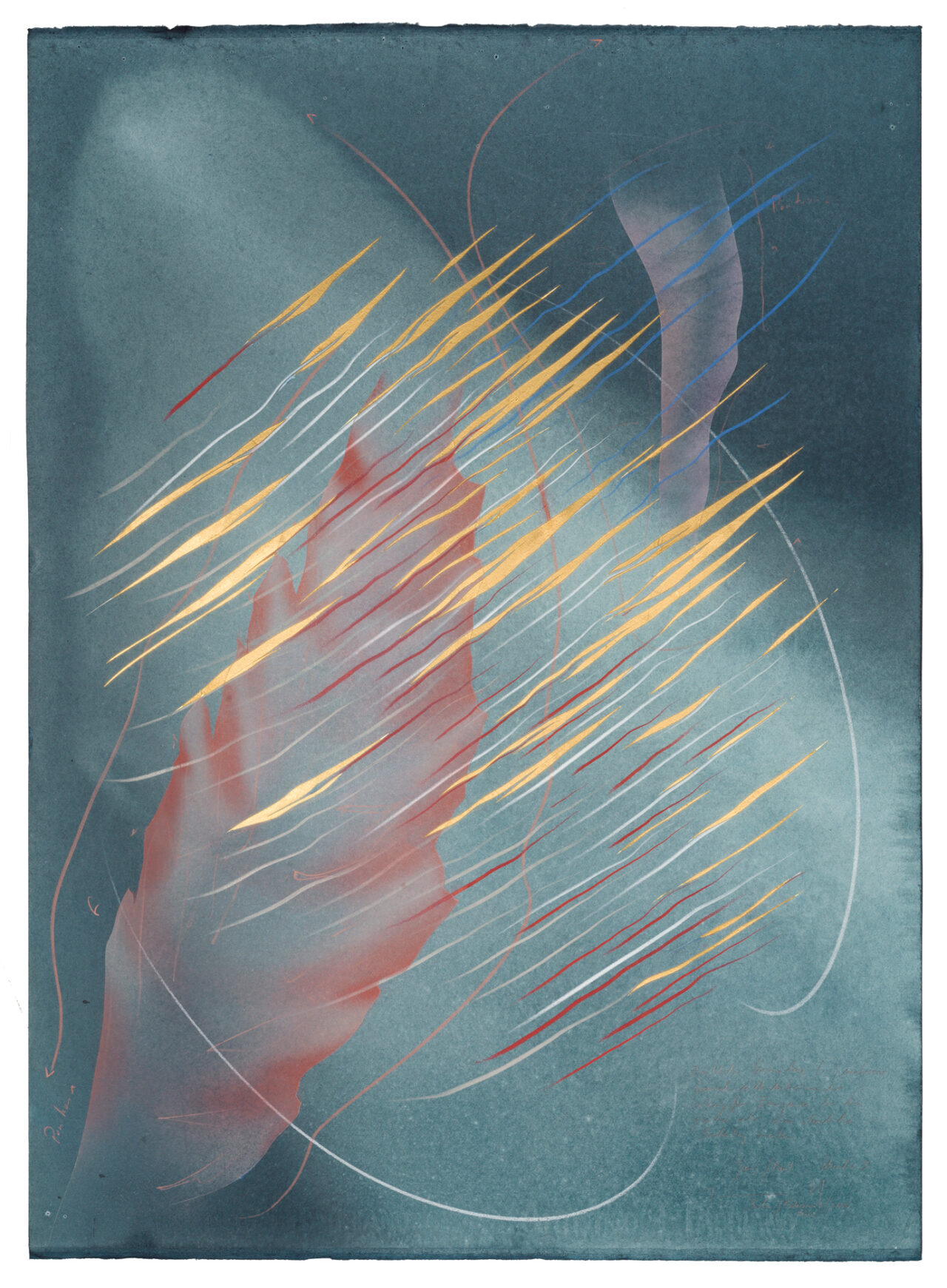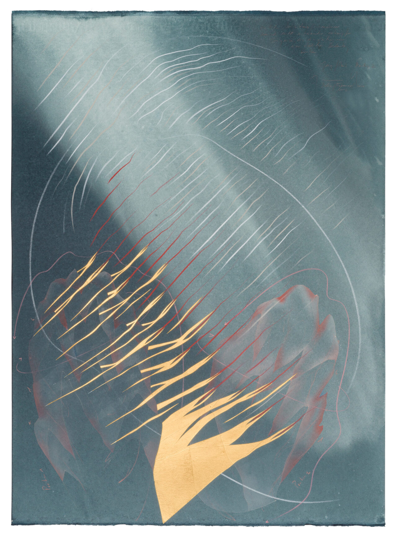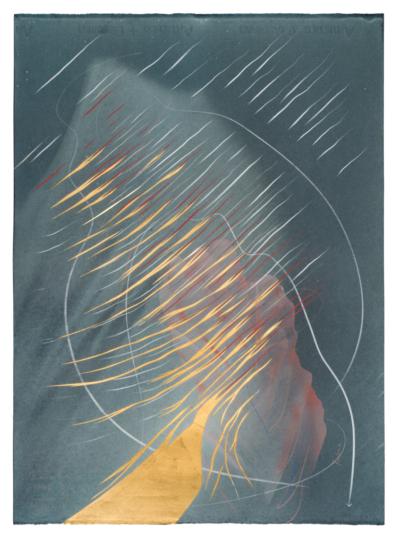 India Ink, gold leaf, pastels, oil chalks, graphite on paper, unique work, signed