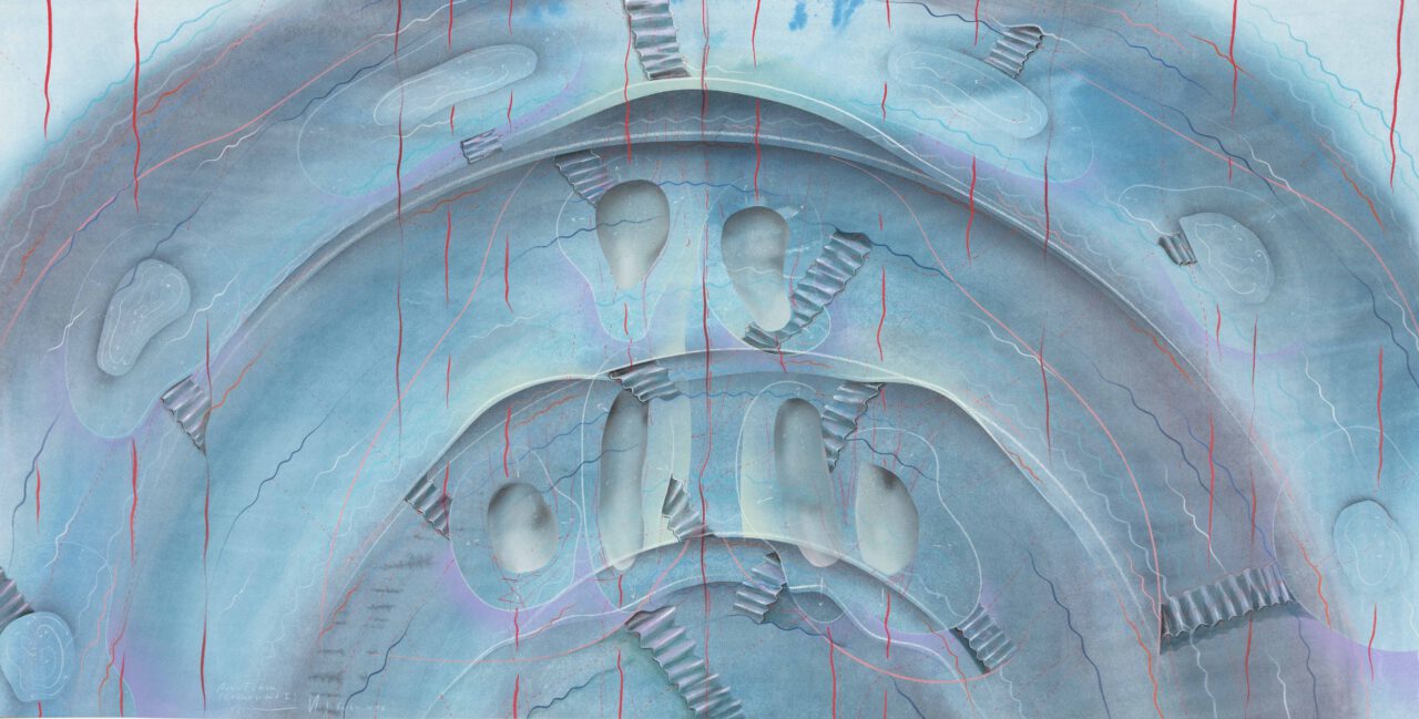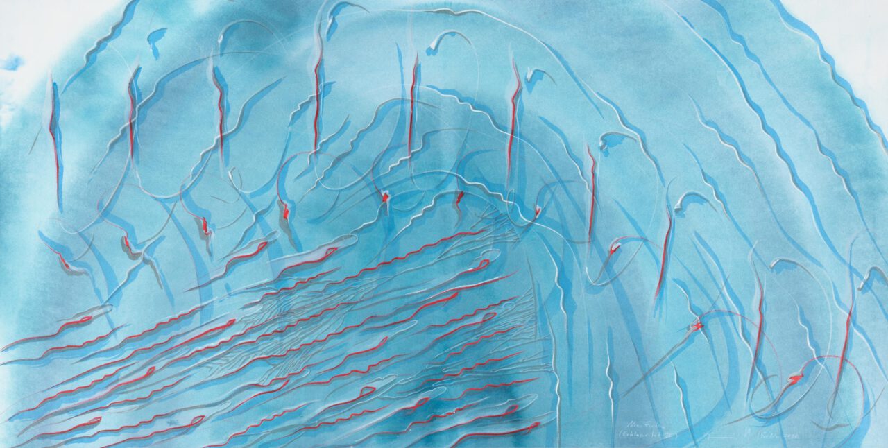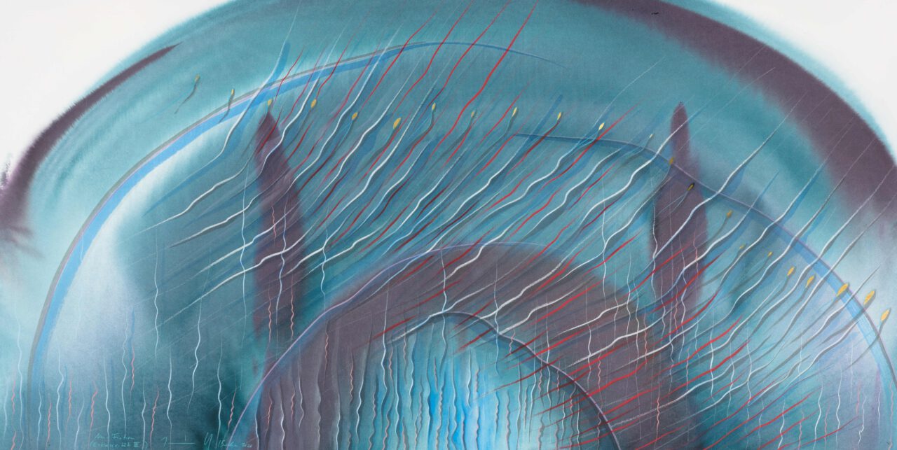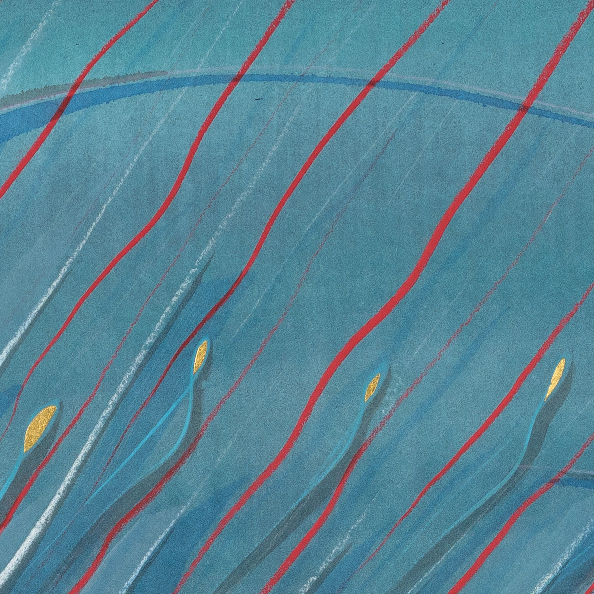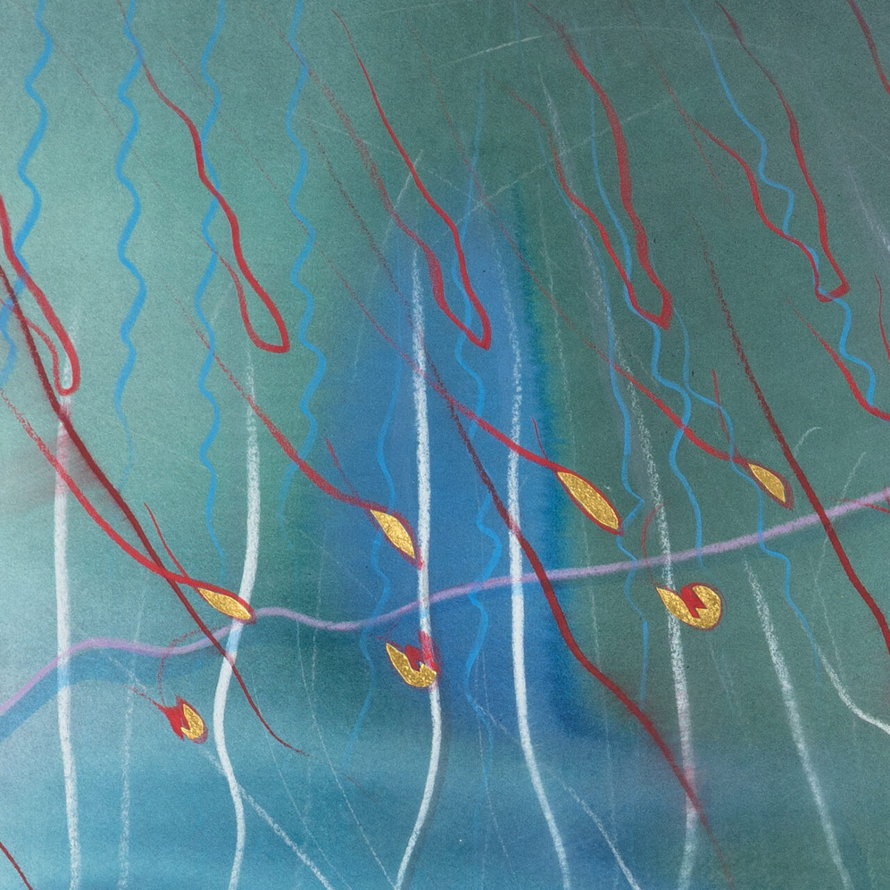 Tinte, Pastell, Farbstift, Gold auf Papier