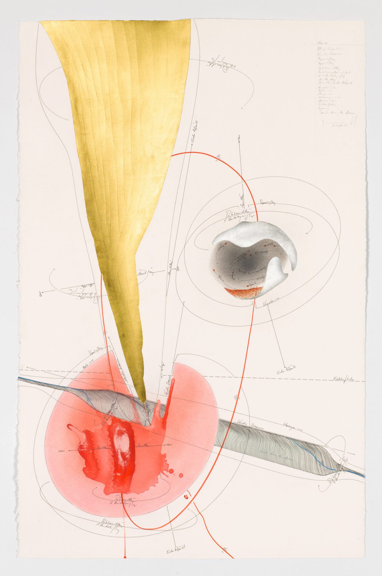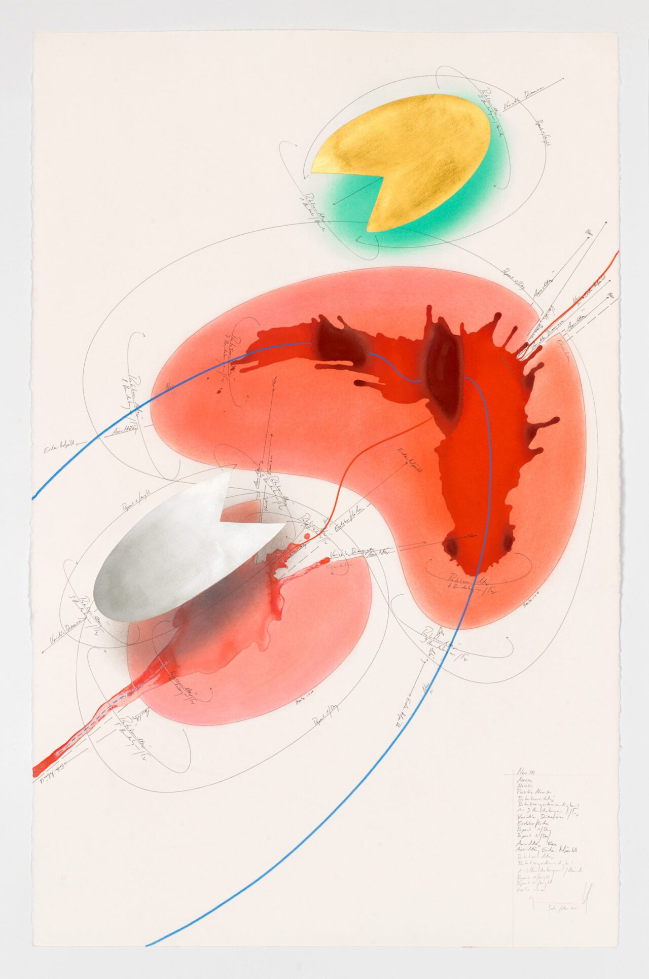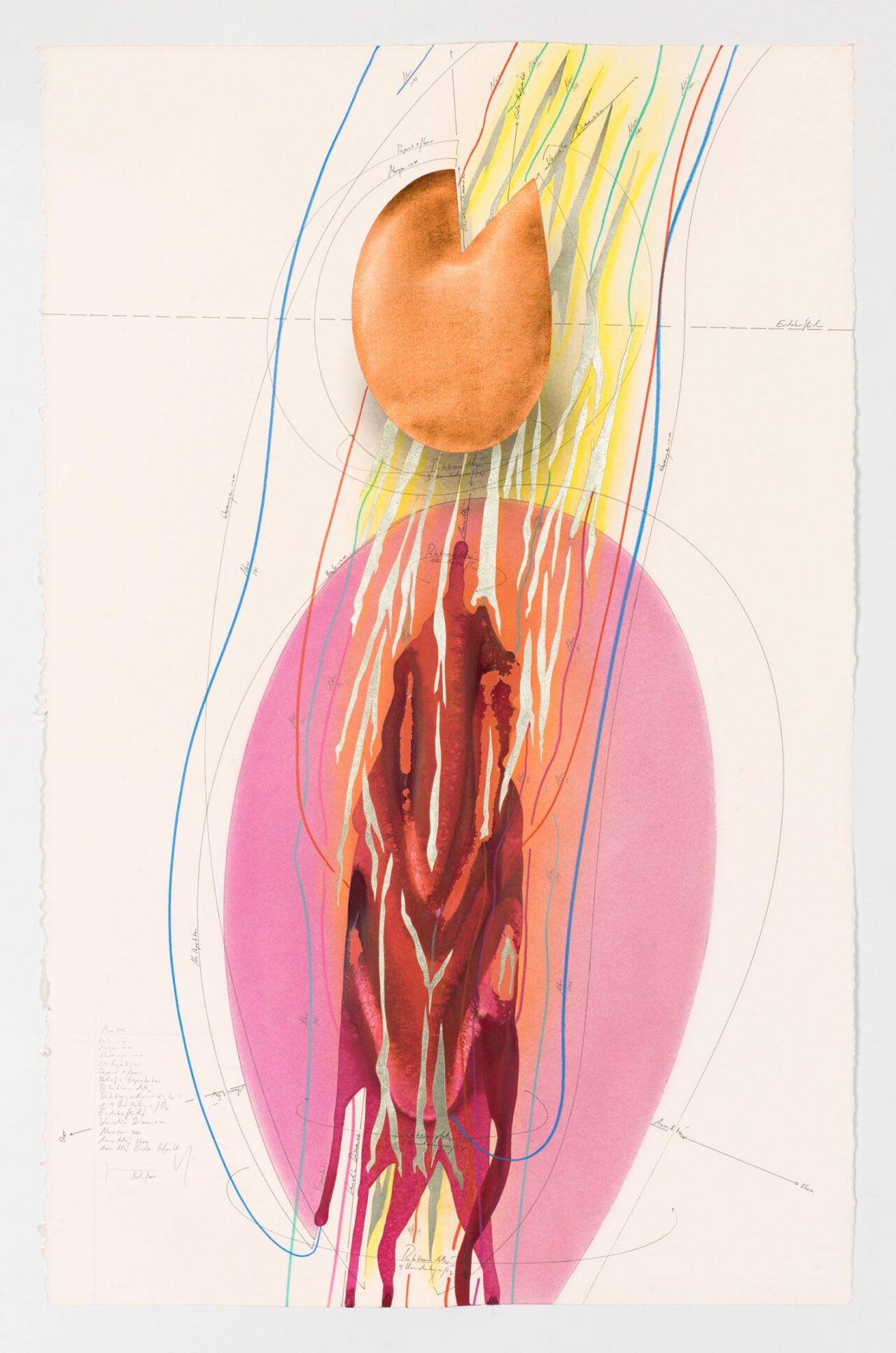 Ink, india ink, oil chalks, gold leaf, pastels, pencil on paper, unique, signed