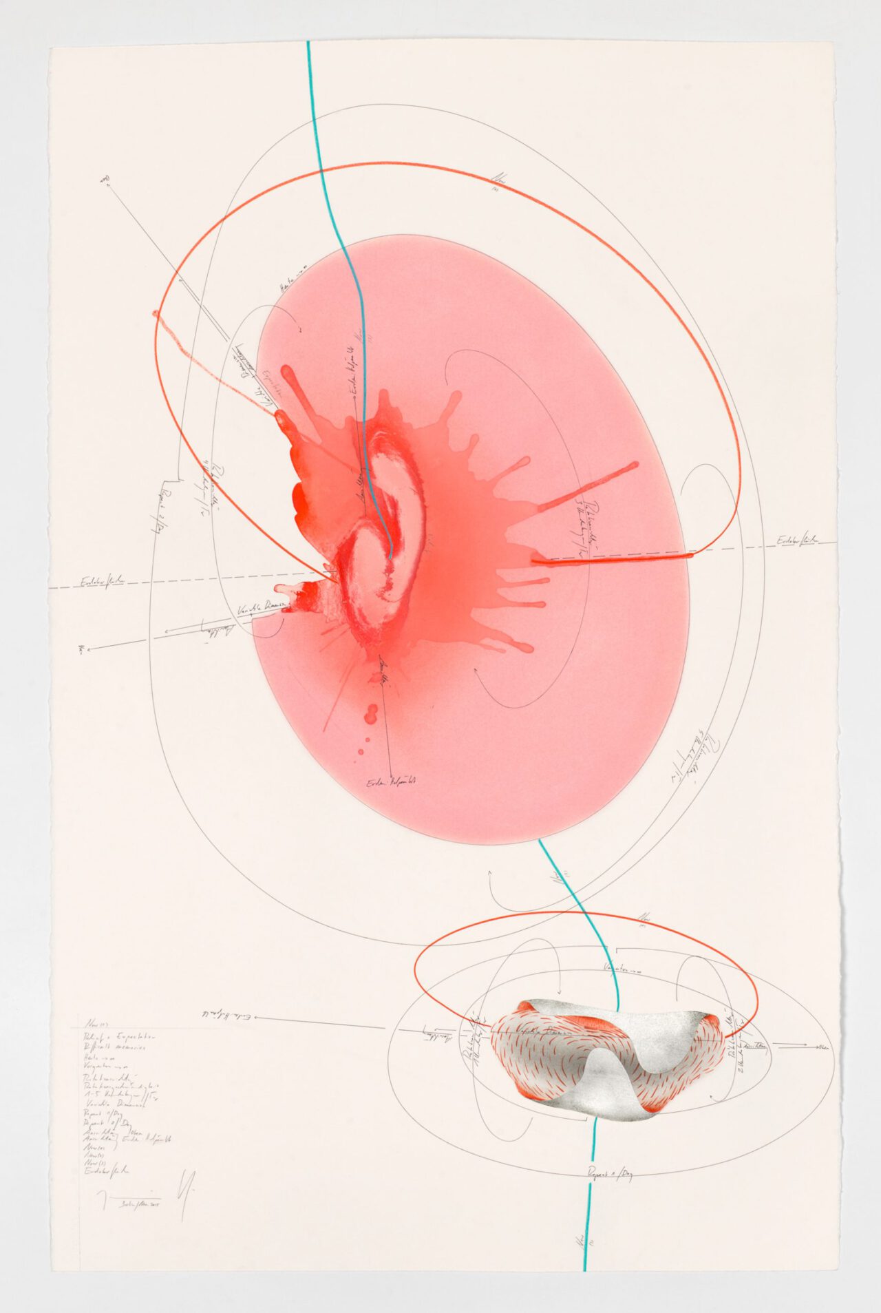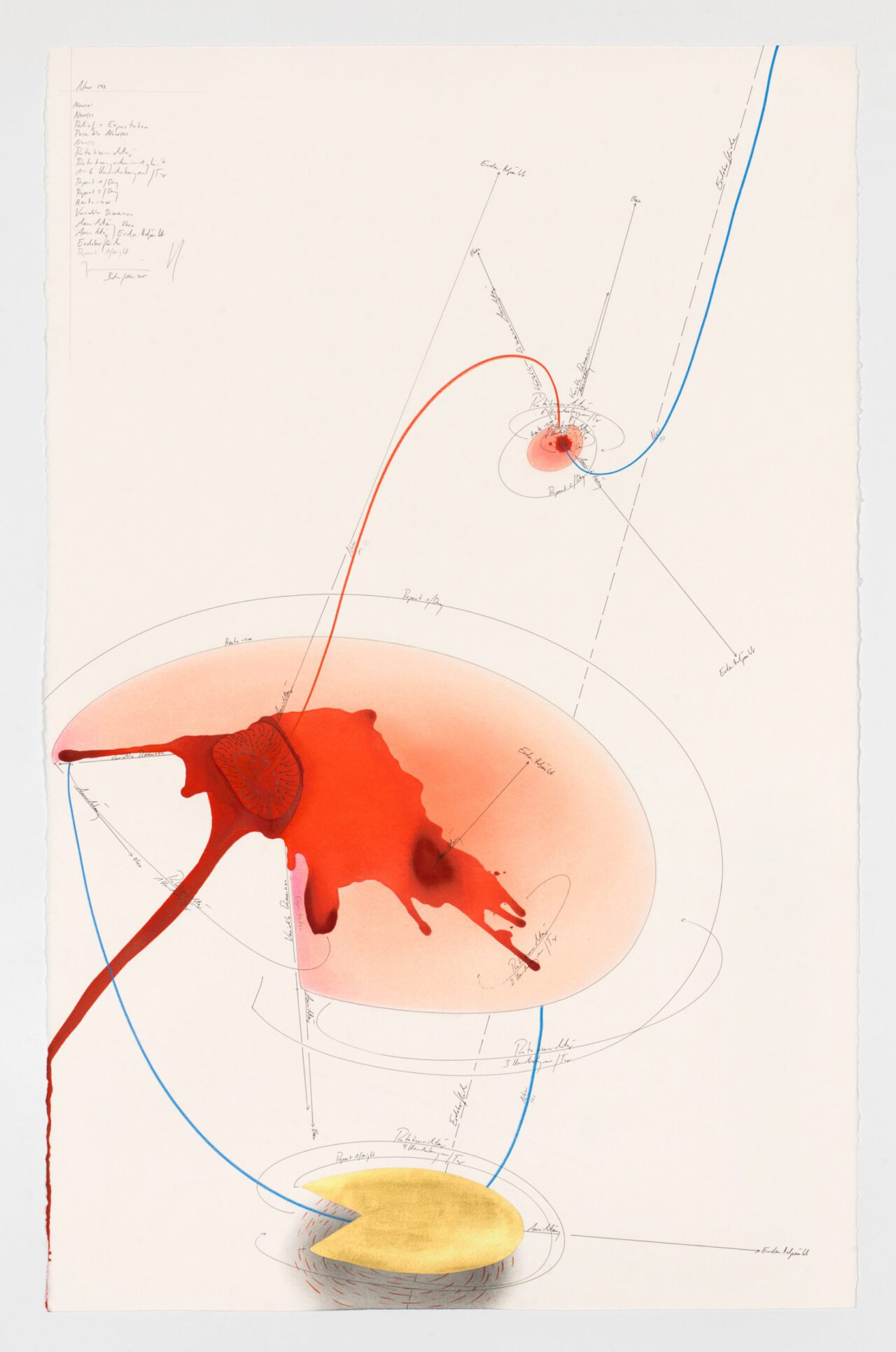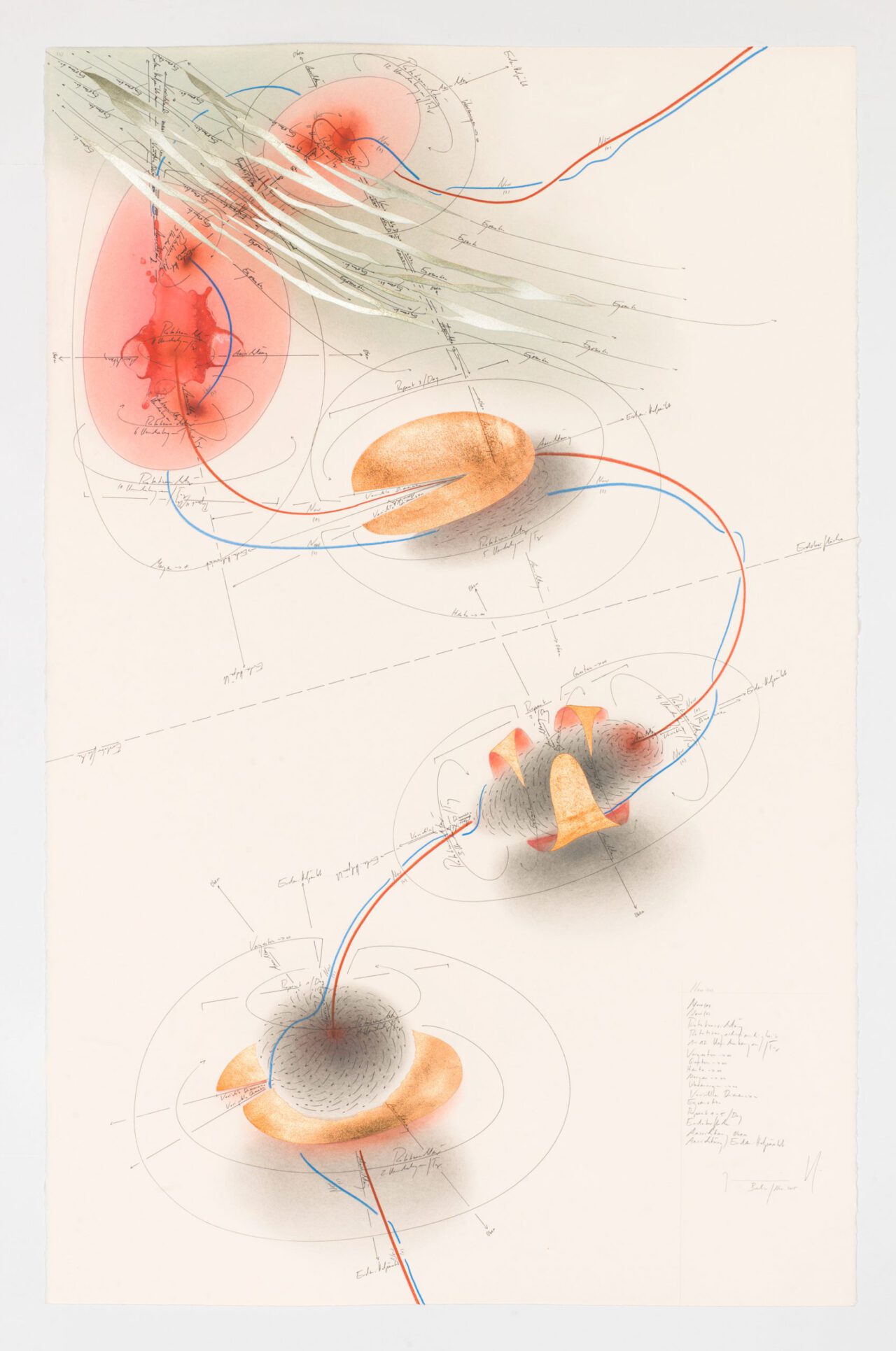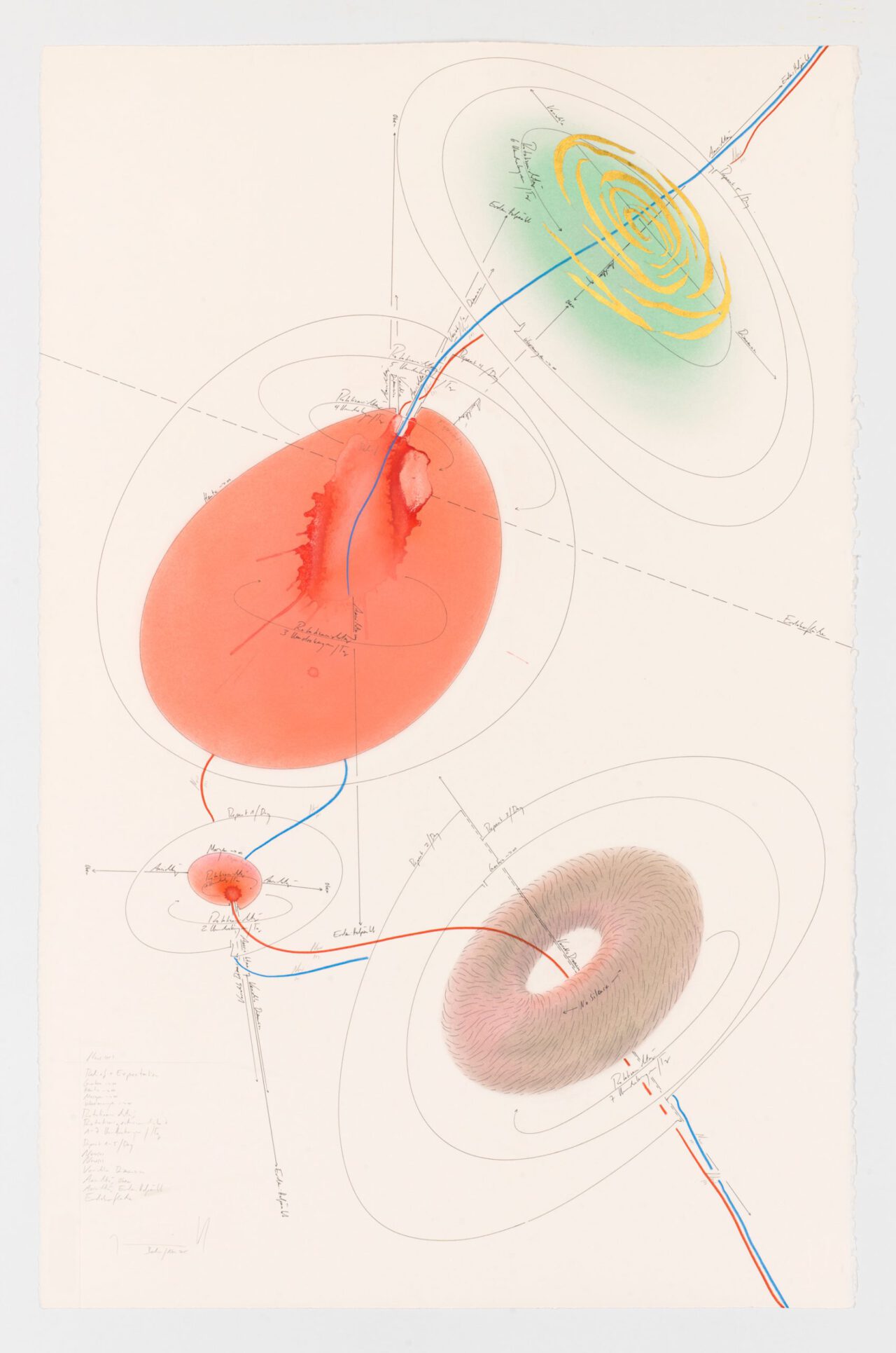 Ink, india ink, oil chalks, gold leaf, pastels, pencil on paper, unique, signed