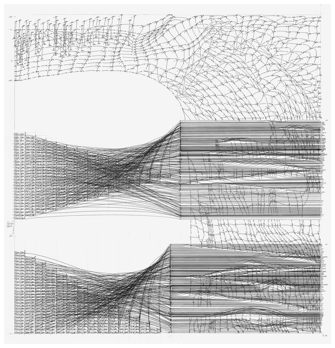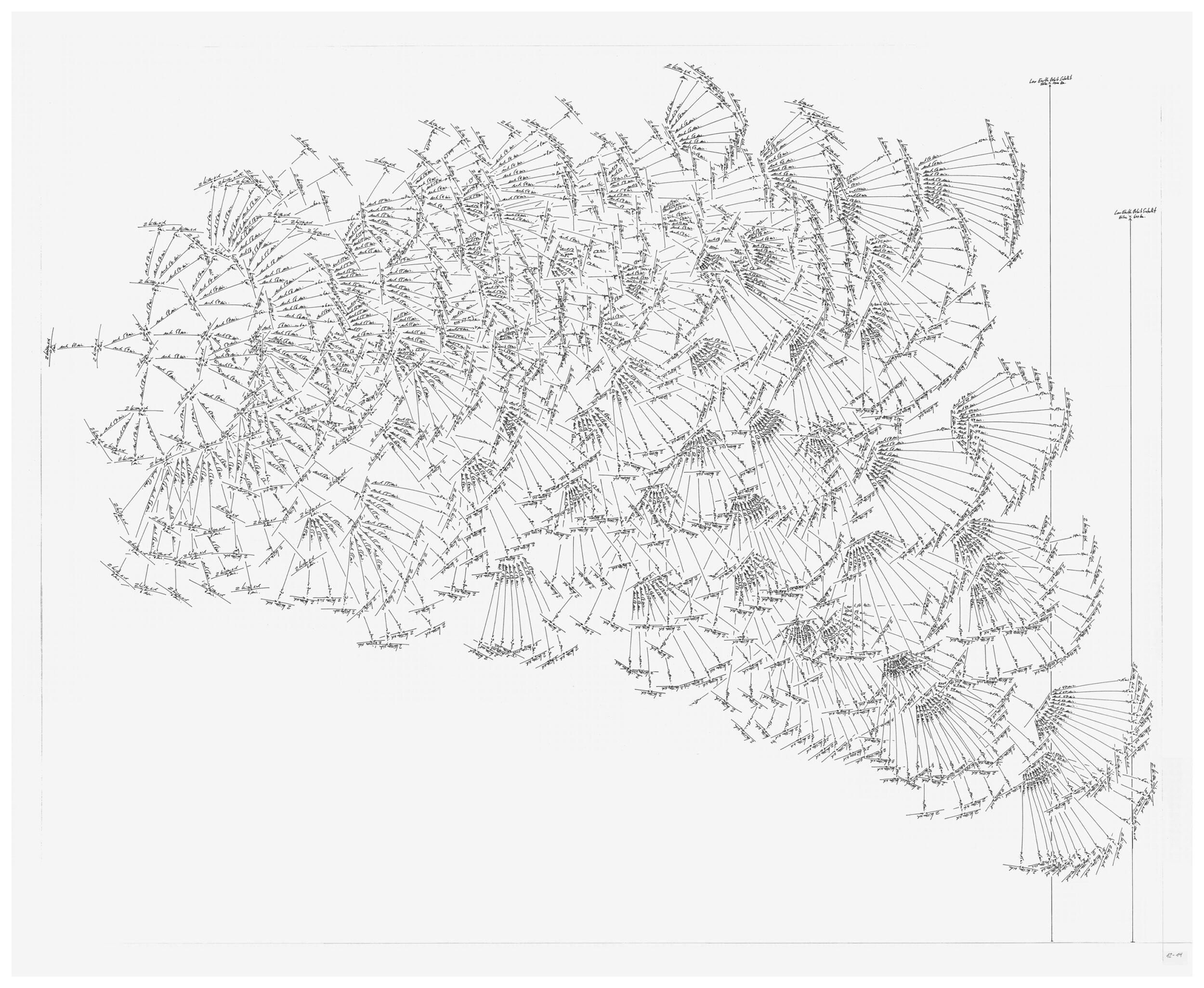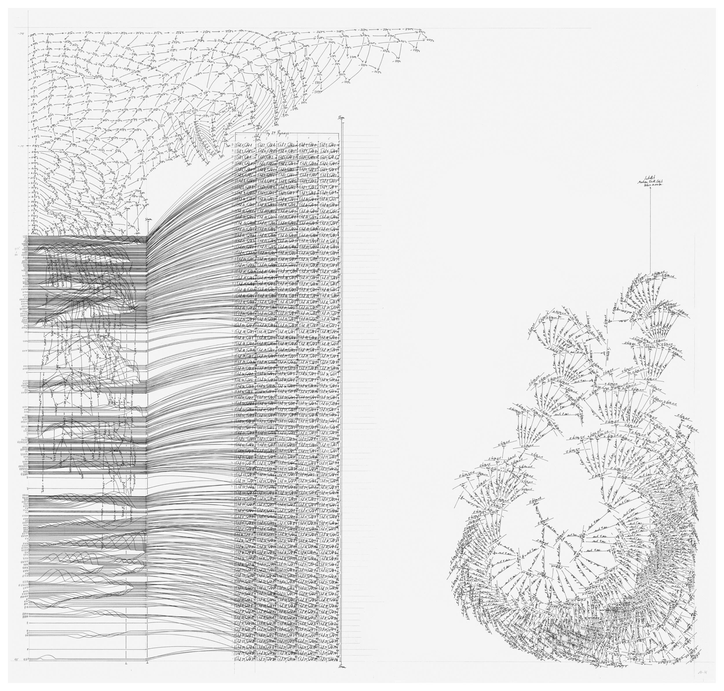 O.T. 13-14 (Temperaturverlauf 44°C bis 0°C, 2 küssen sich 10 Minuten (10 Paare), nach 1 Minute küssen sich 2 für 9 Minuten (10 x 9 Paare), nach 2 Minuten küssen sich 2 für 8 Minuten (10 x 9 x 8 Paare)…)