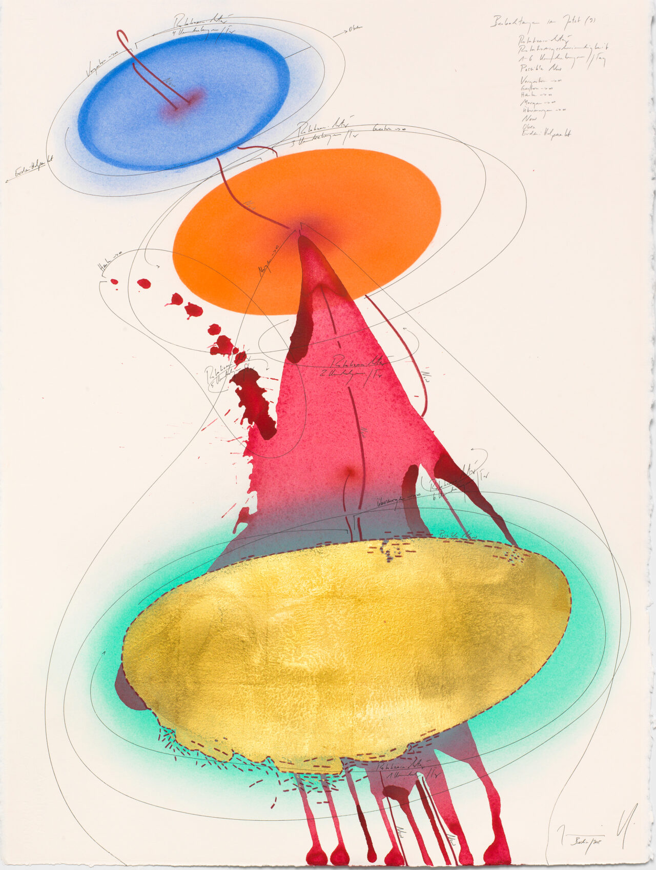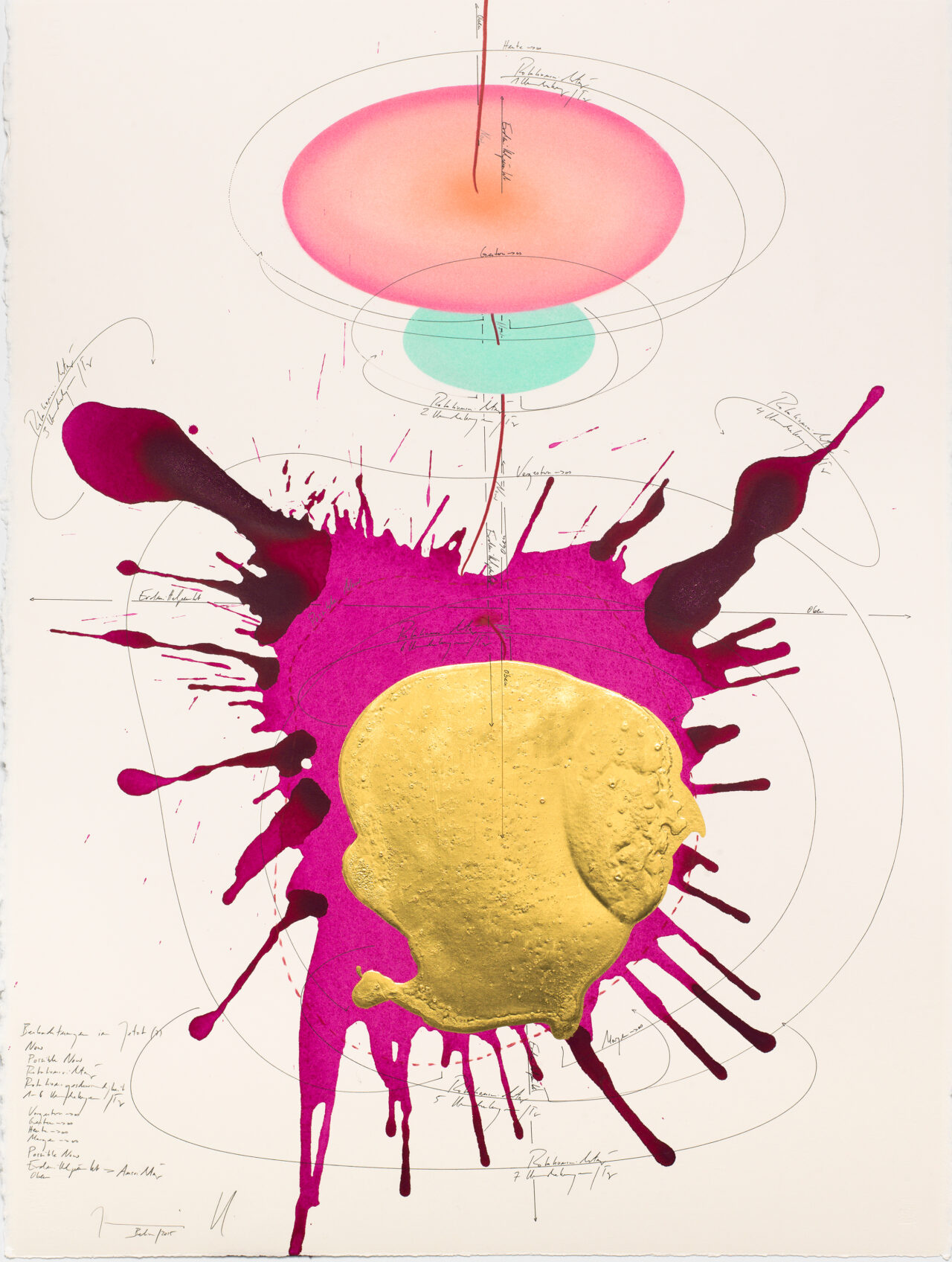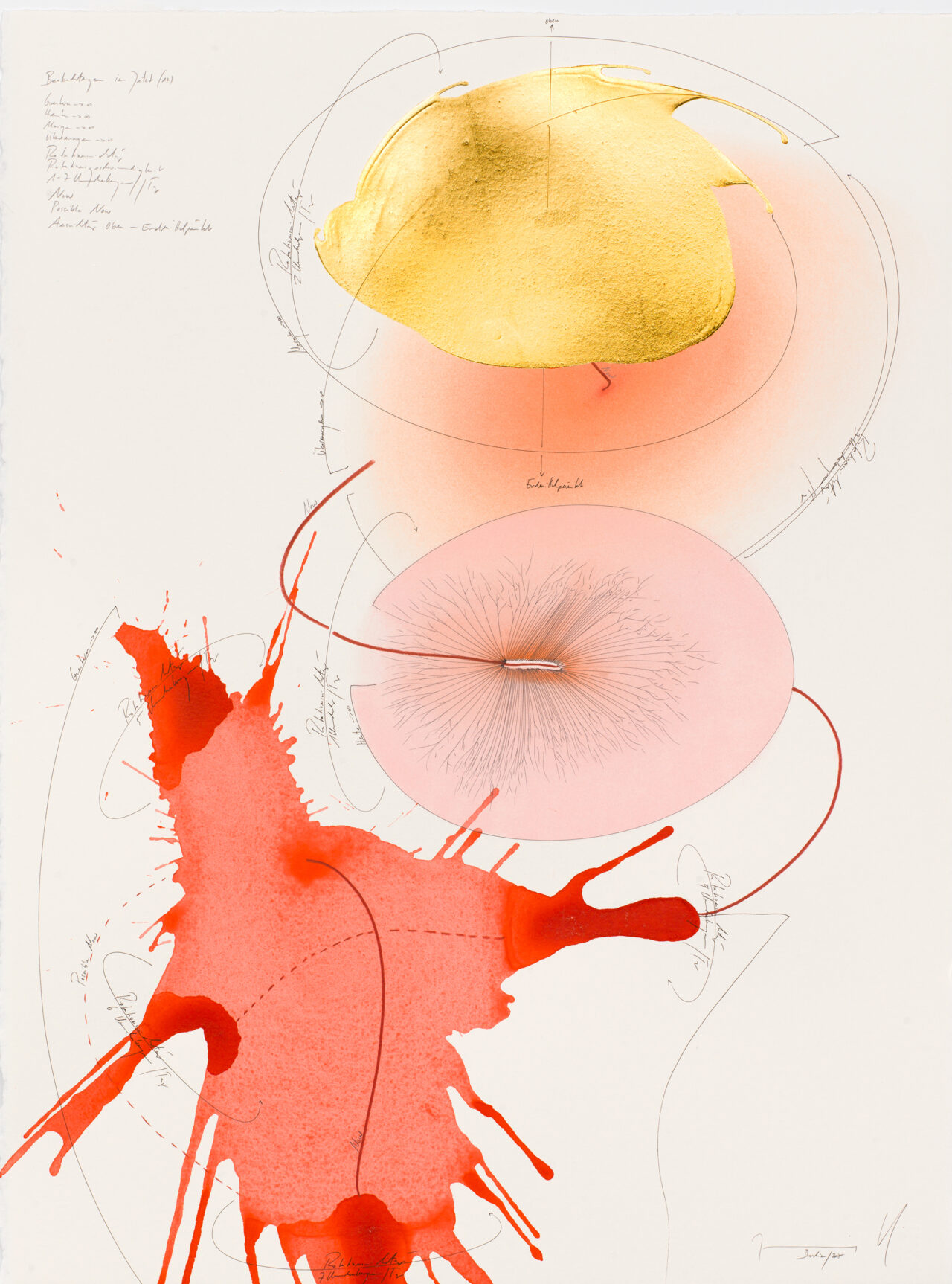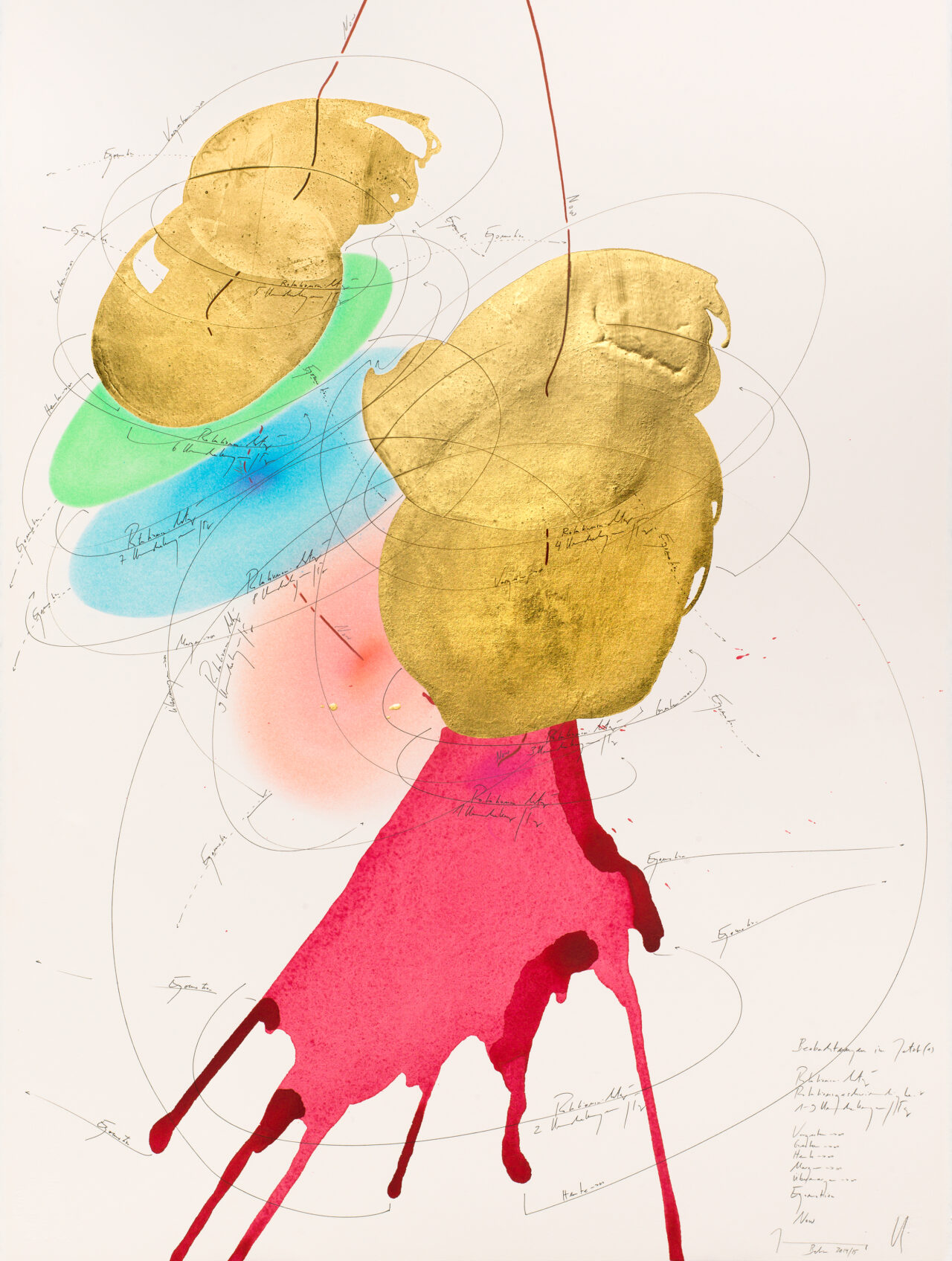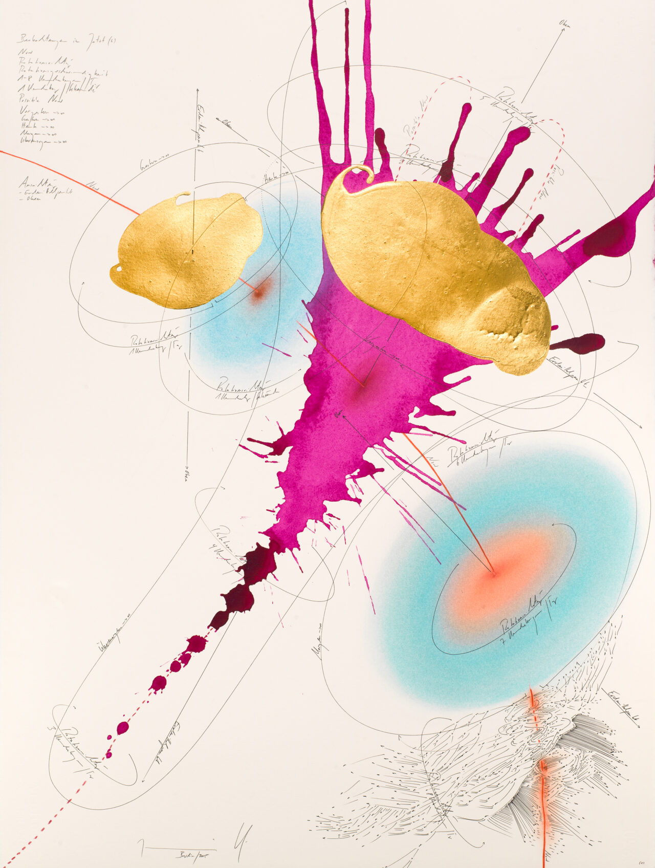 Ink, India ink, gold leaf, oil chalks, pastels, pencil on paper