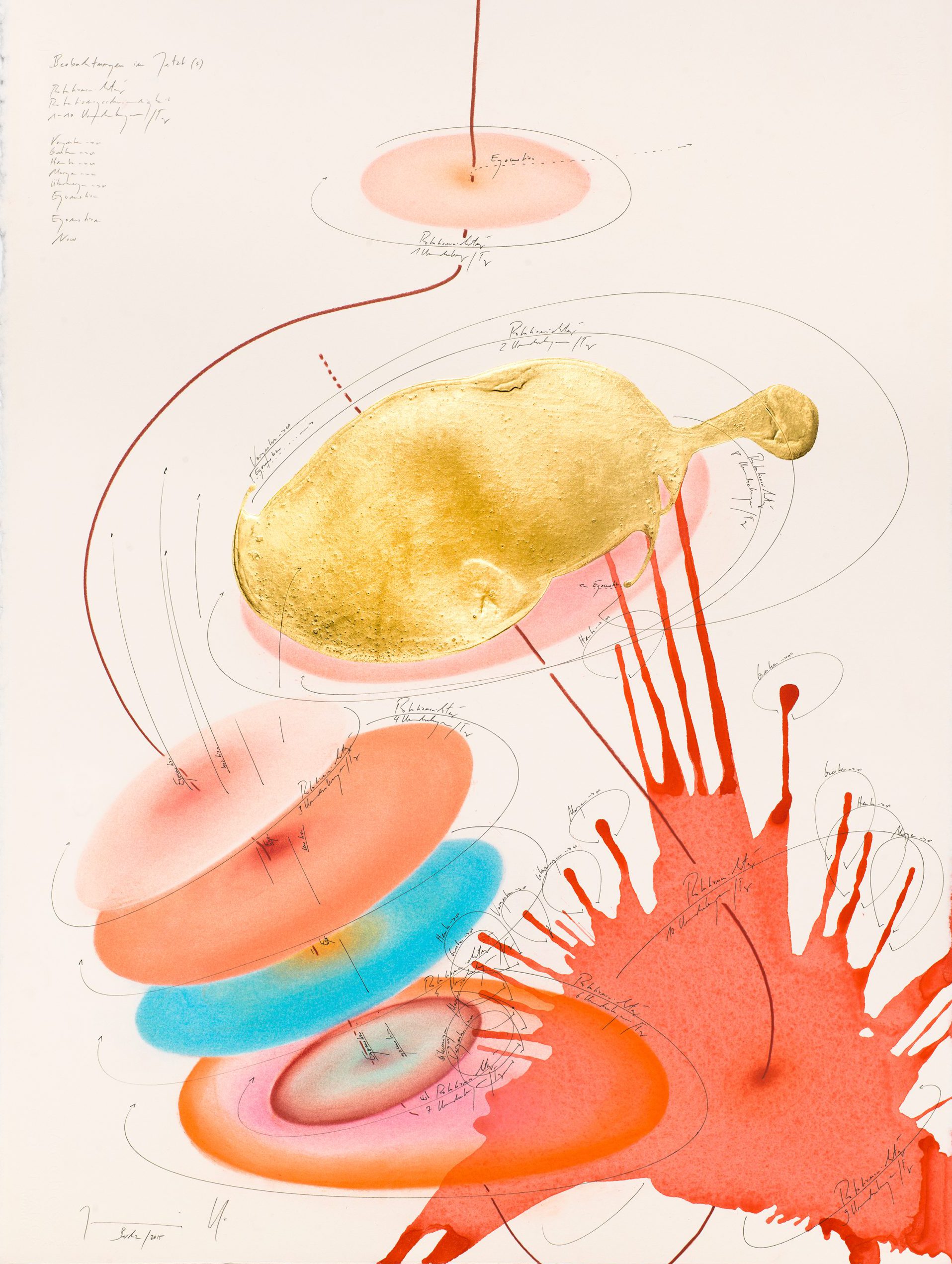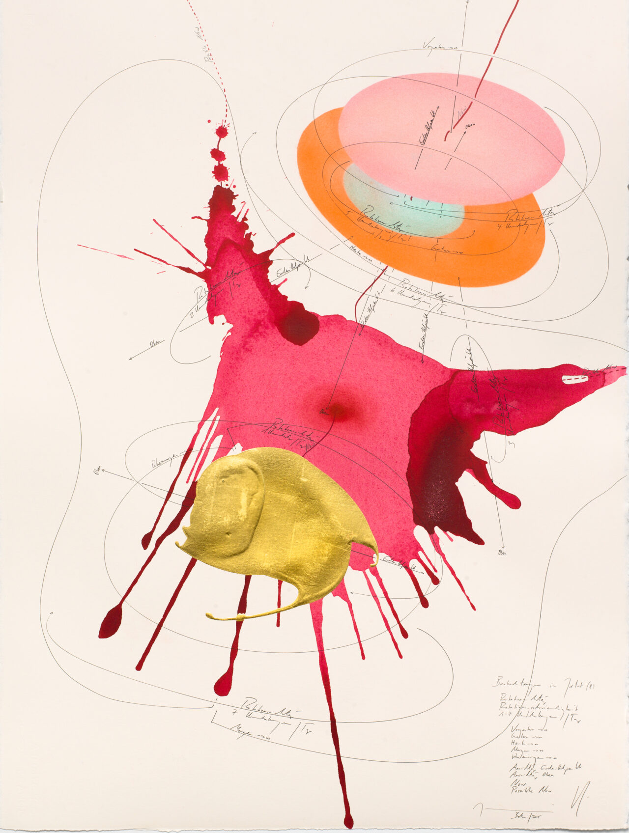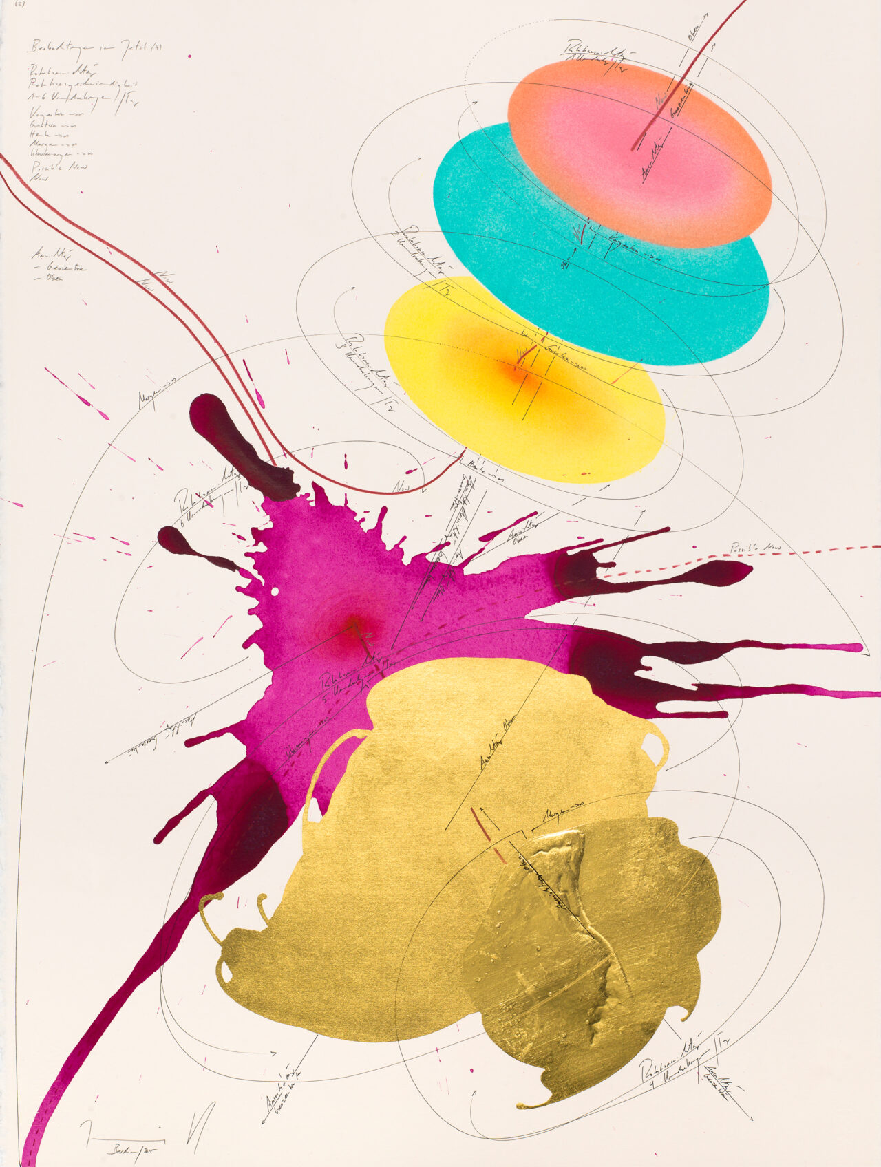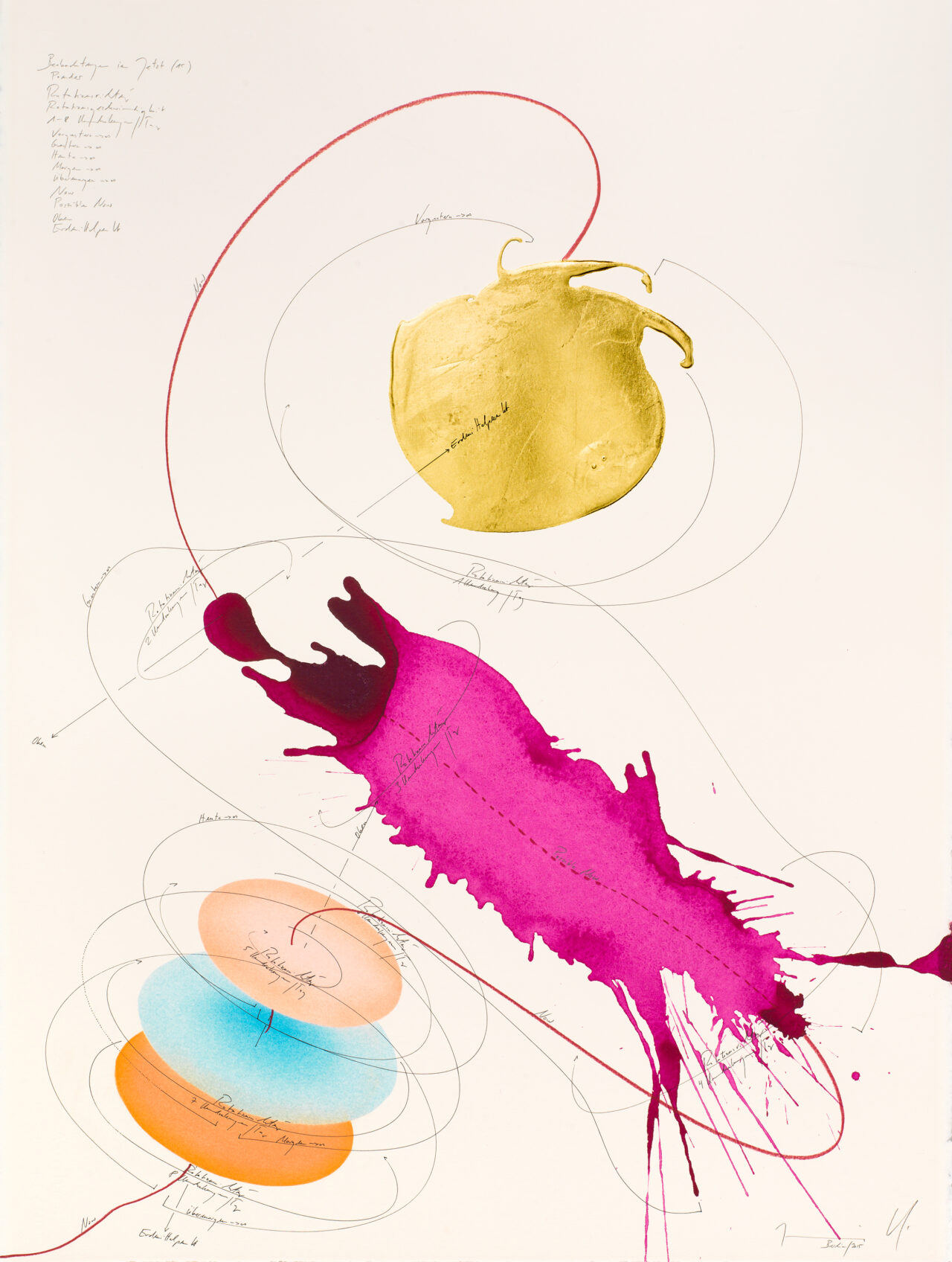 Ink, India ink, gold leaf, oil chalks, pastels, pencil on paper