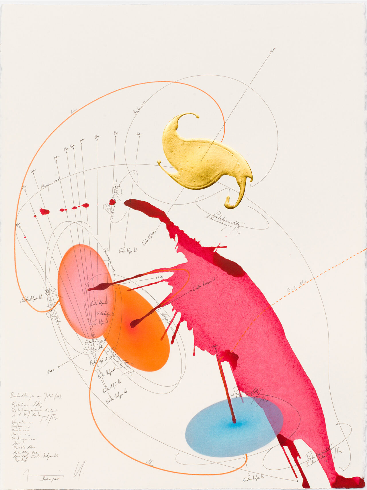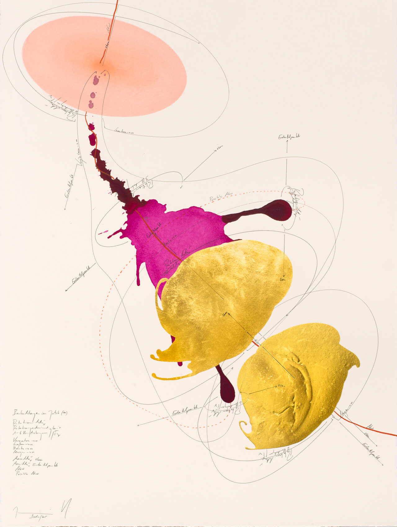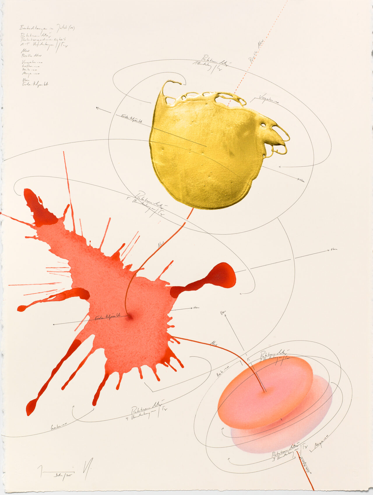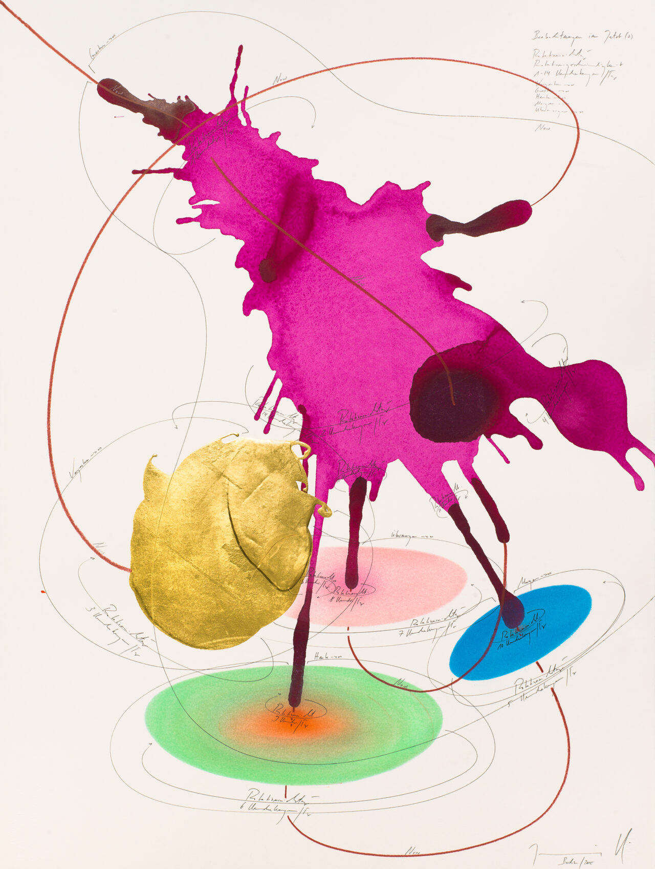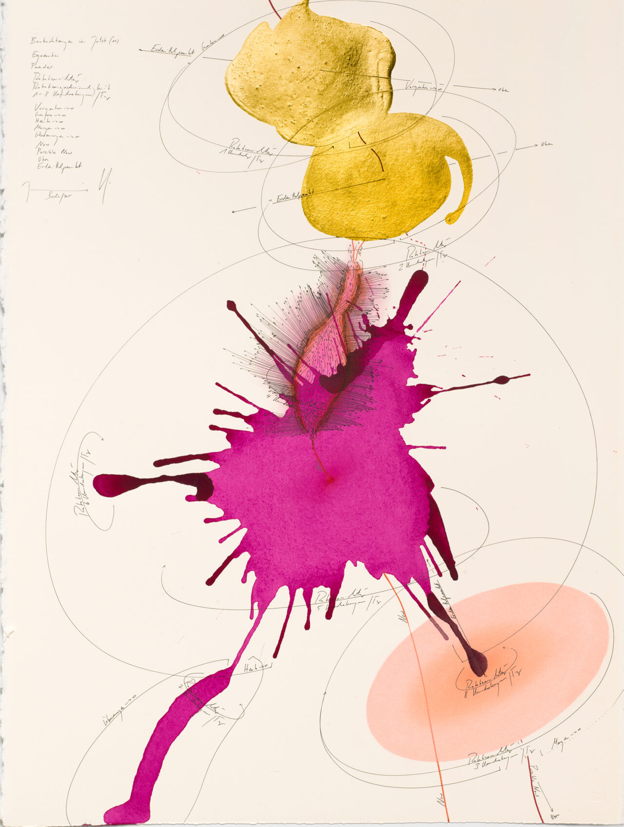 Ink, India ink, gold leaf, oil chalks, pastels, pencil on paper