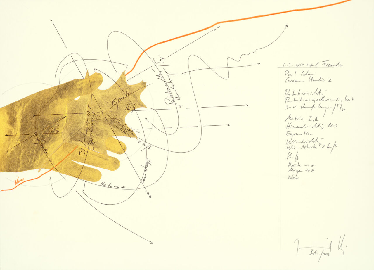 Ink, graphite, oil chalks, gold leaf on paper, unique, signed