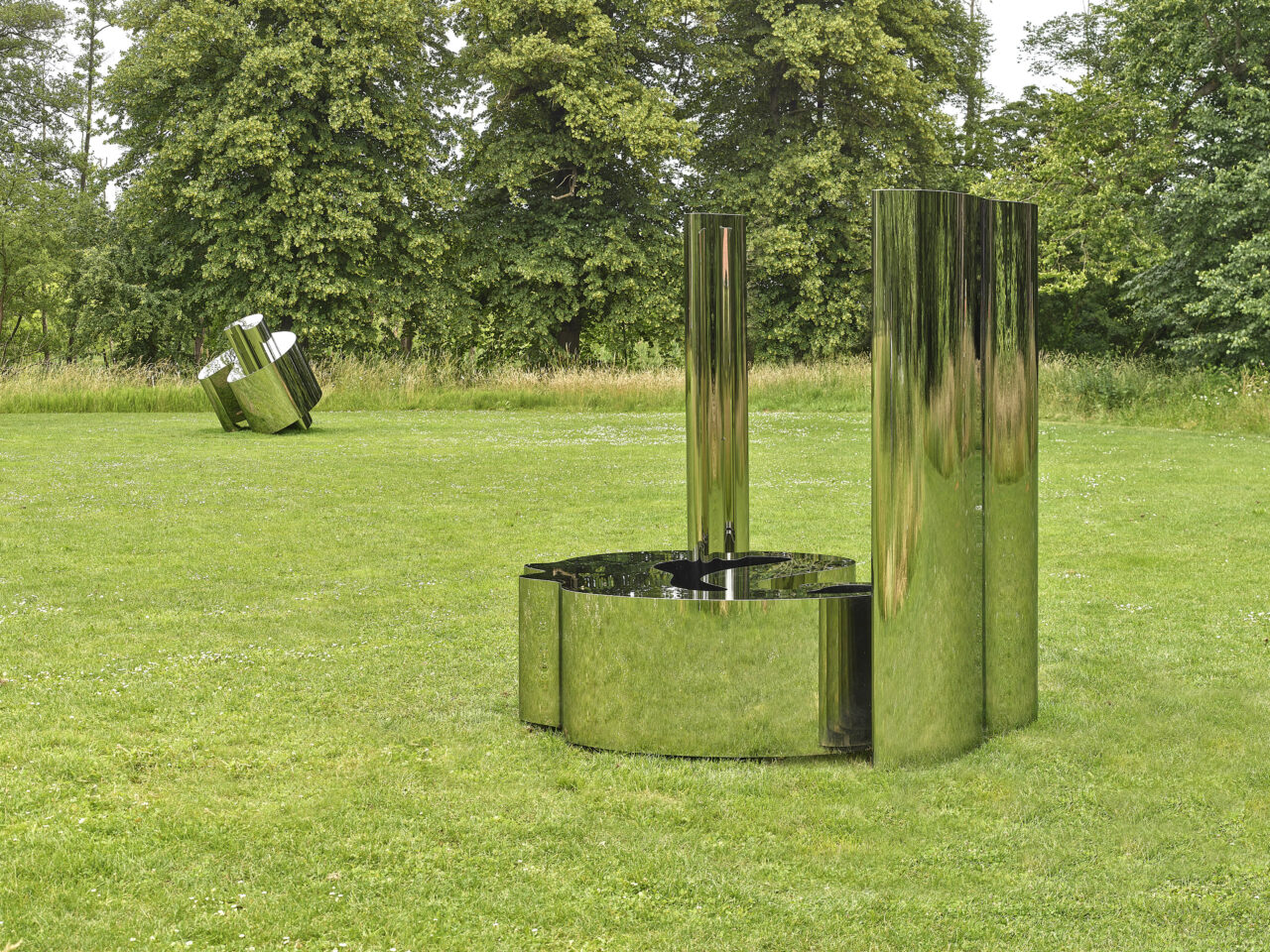 Voigt’s shapes effectively “close in on themselves,” creating a complete form, one whole out of many parts. Reflective surfaces literally mirror the observer, with biomorphic forms that reach into the collective unconscious and evoke sublime natural imagery. Despite the works’ scale, this play of mirrors appears phenomenologically weightless, suggesting a window or void. The distorted reflections of their surroundings change with every step taken by the observer, creating an effect as if the universe were slightly adrift.