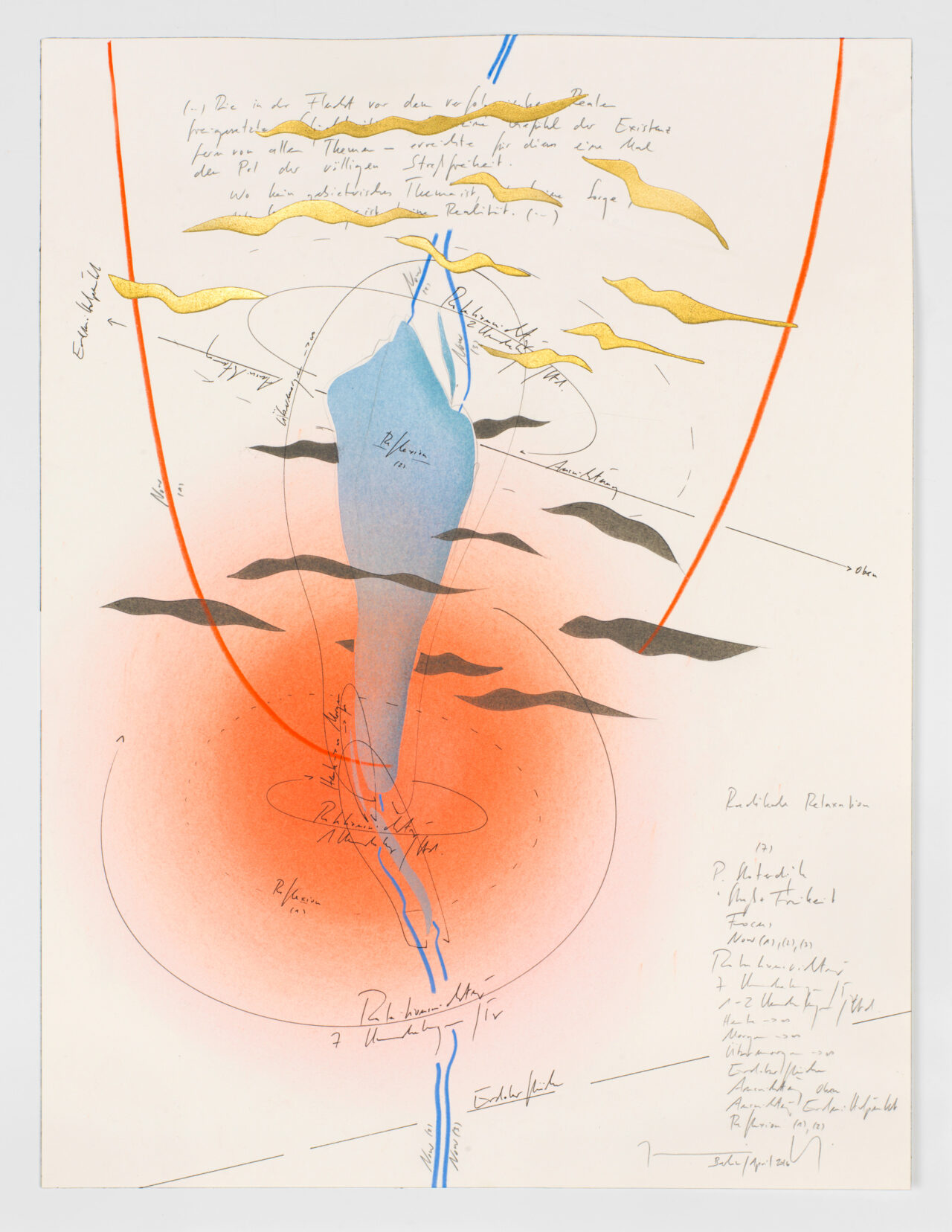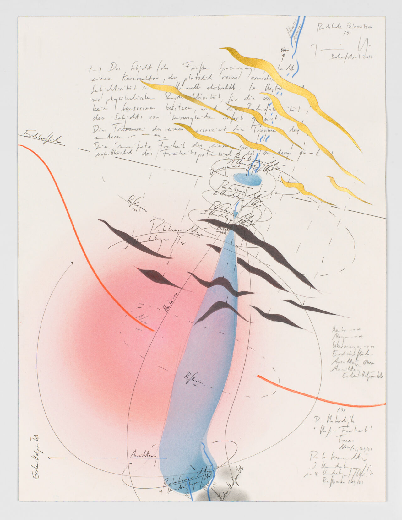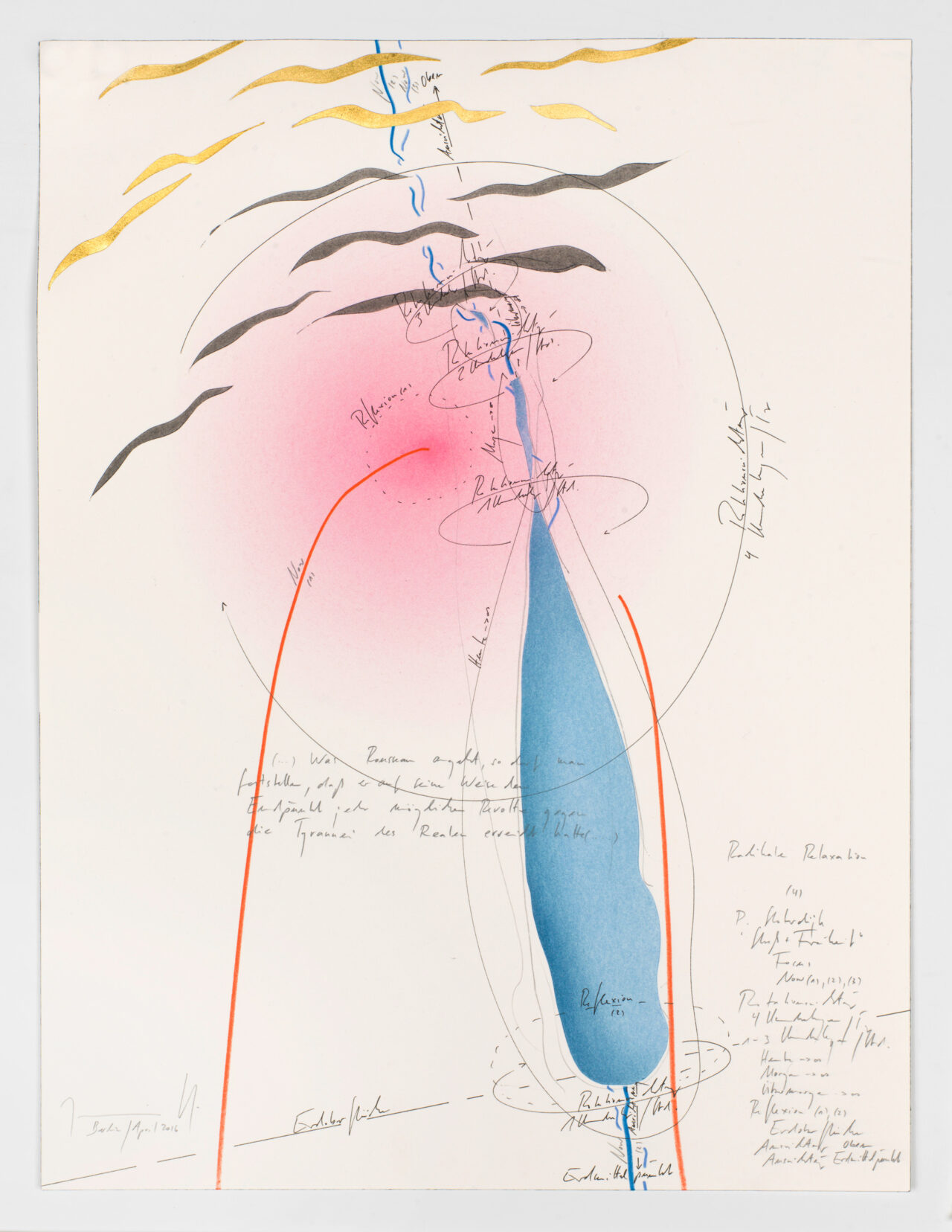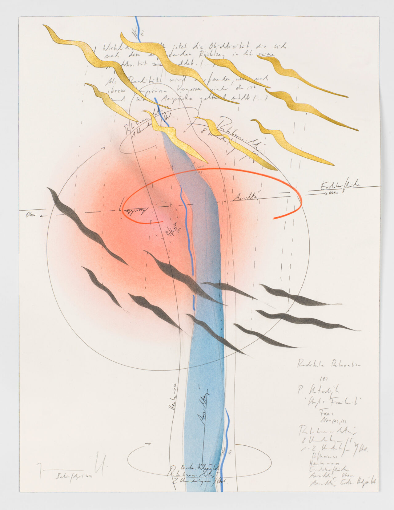 Ink, gold leaf, oil chalks, pastels, pencil on paper, unique, signed