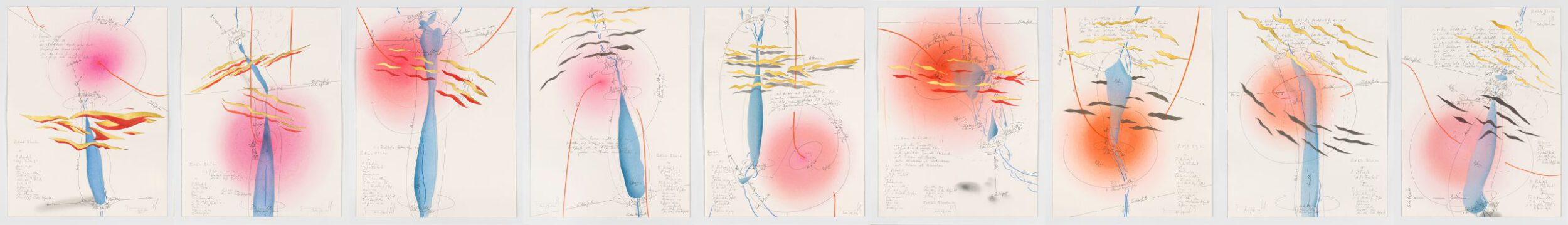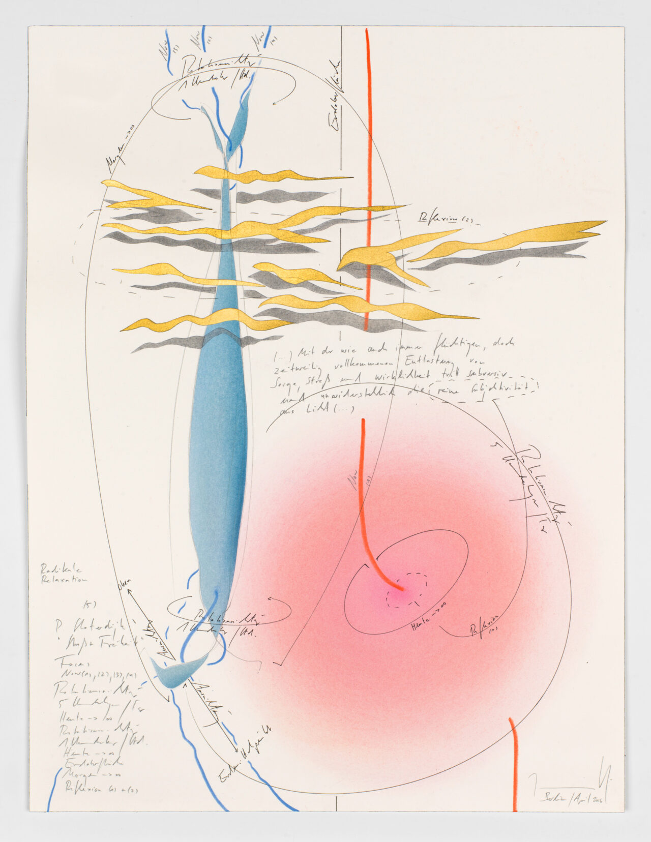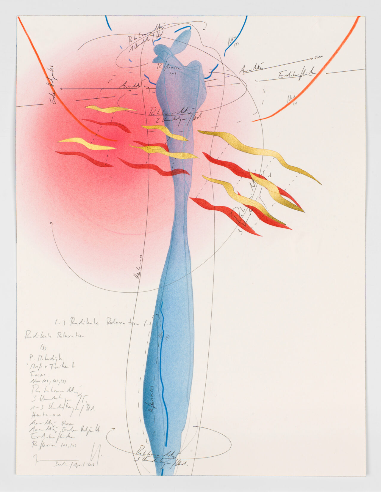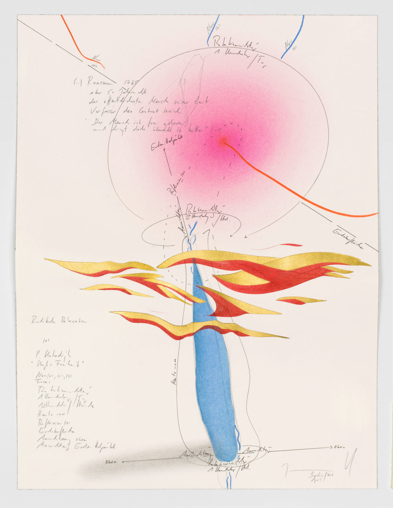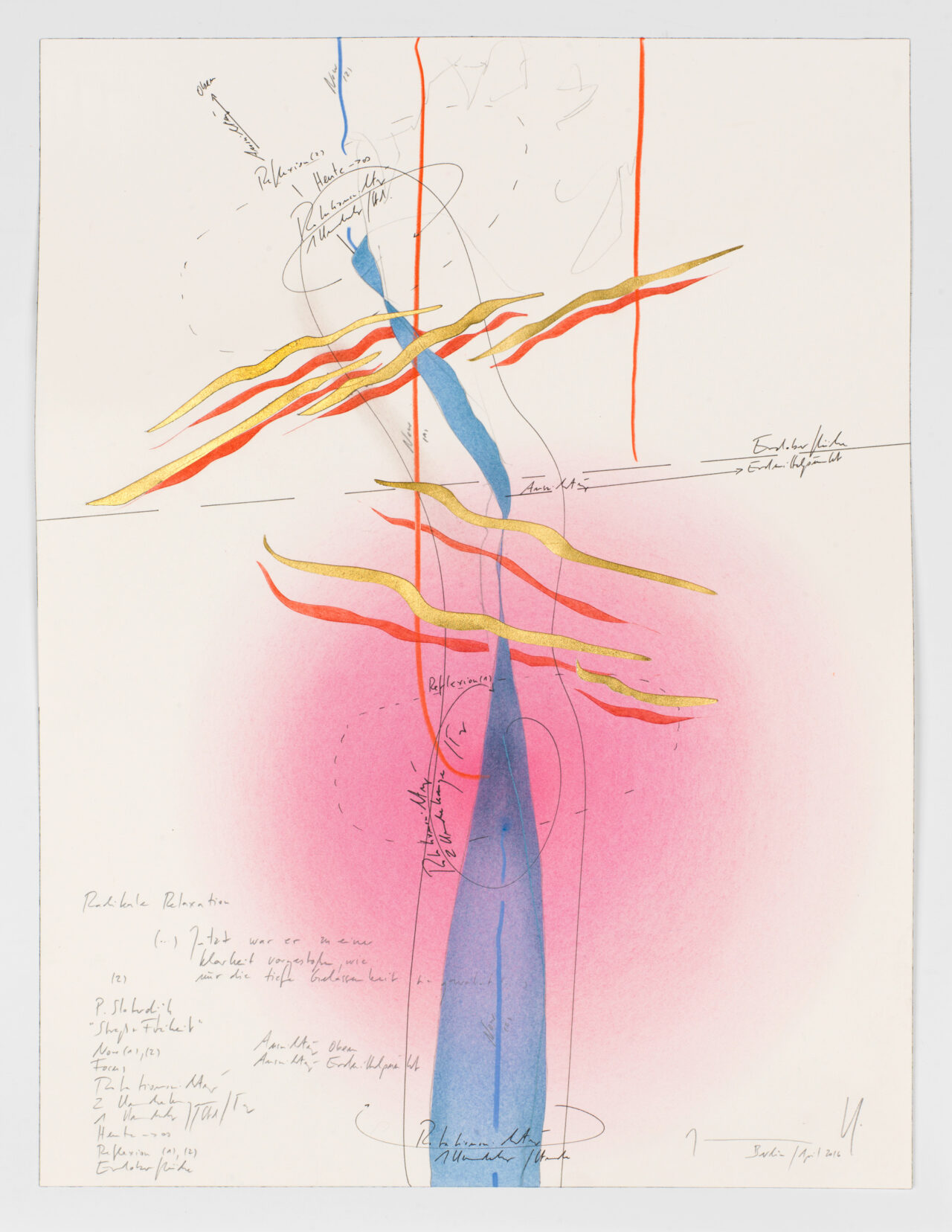 Ink, gold leaf, oil chalks, pastels, pencil on paper, unique, signed