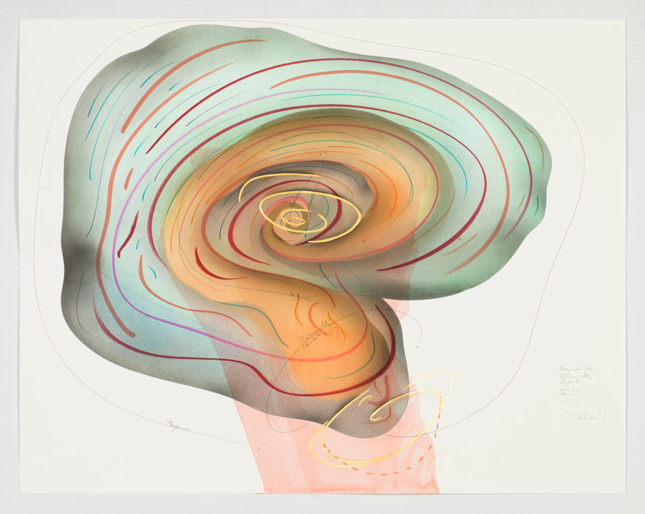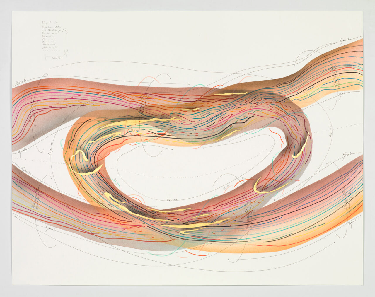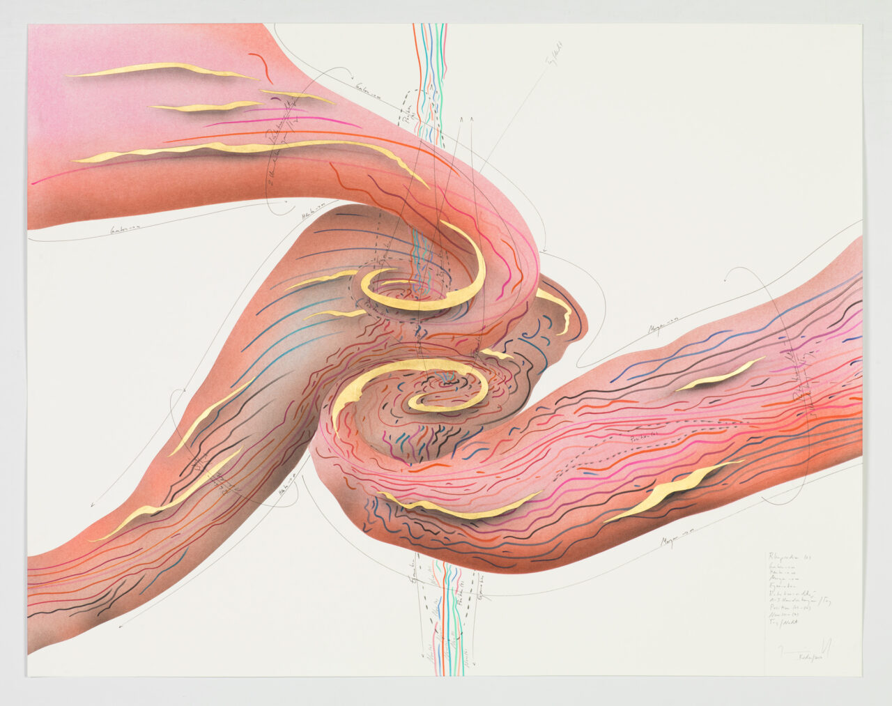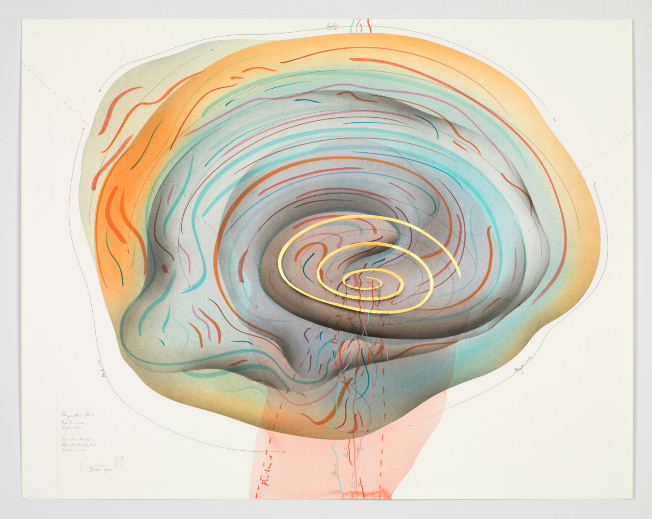 Ink, gold leaf, aluminium leaf, oil chalks, pastels, pencil on paper Unique work Signed