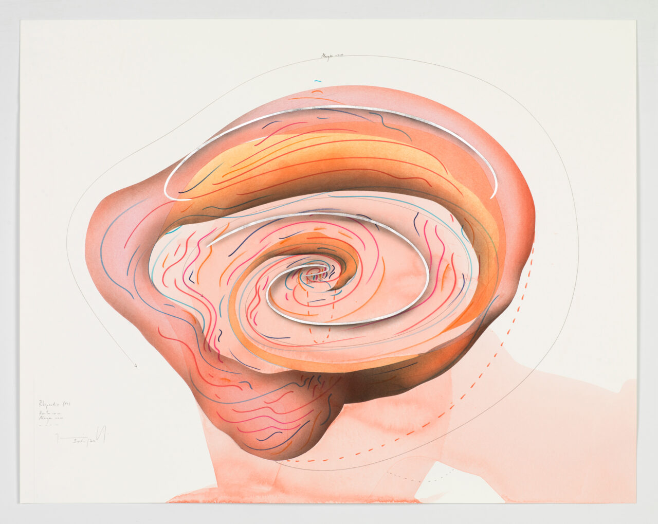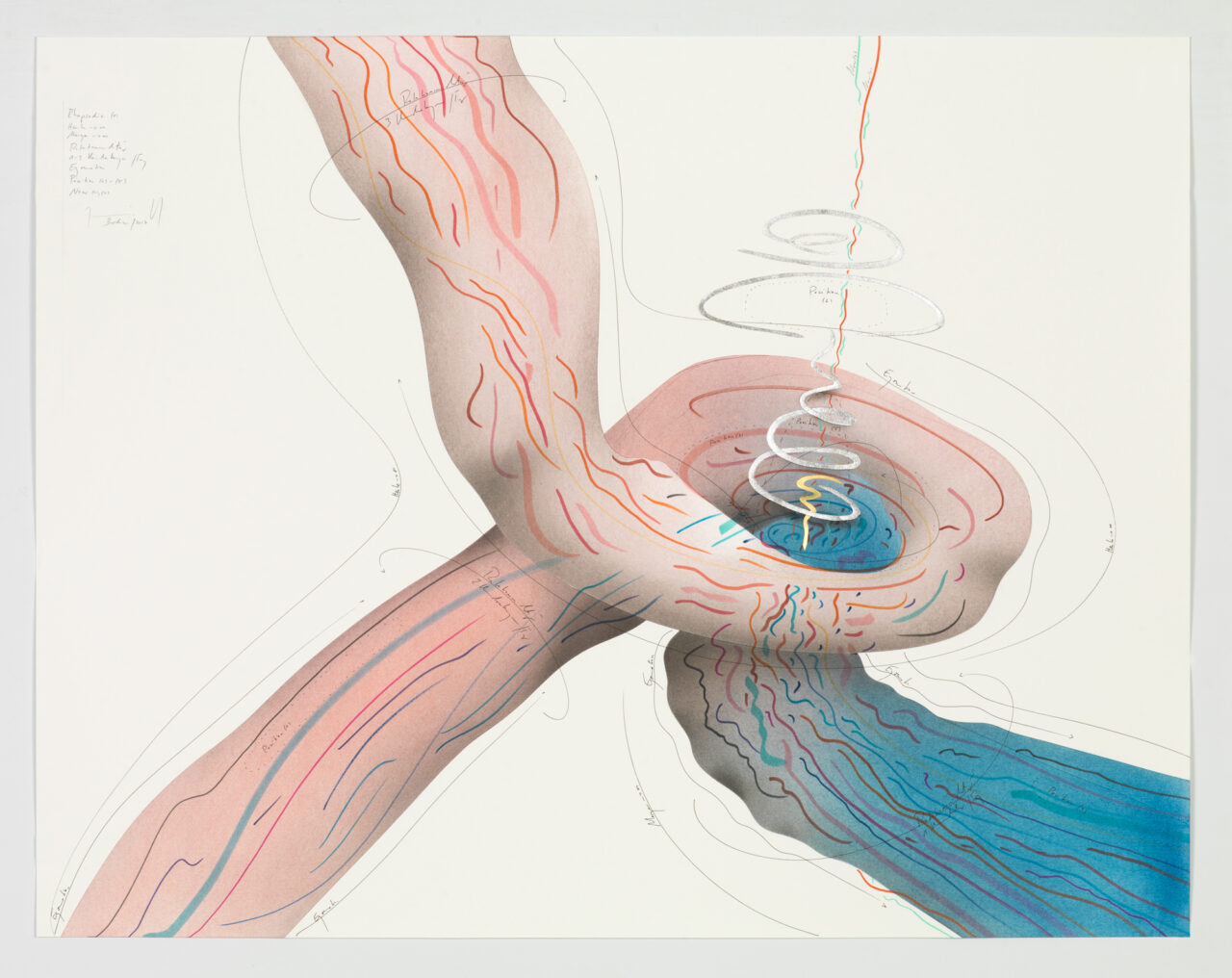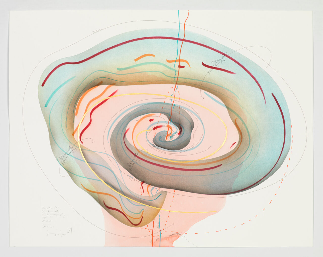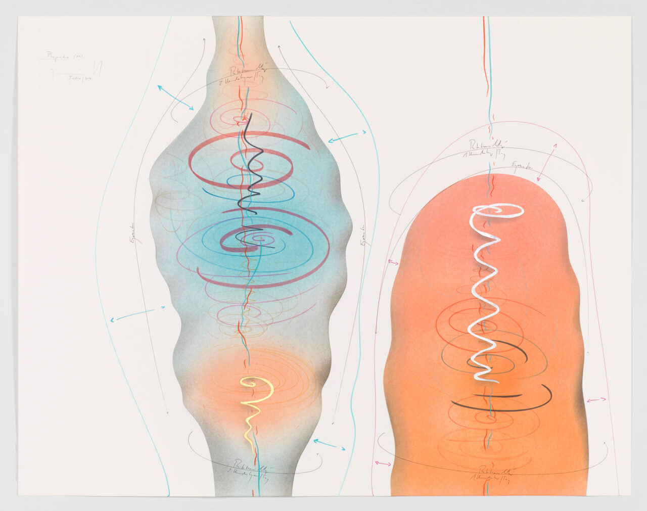 Ink, gold leaf, aluminium leaf, oil chalks, pastels, pencil on paper Unique work Signed