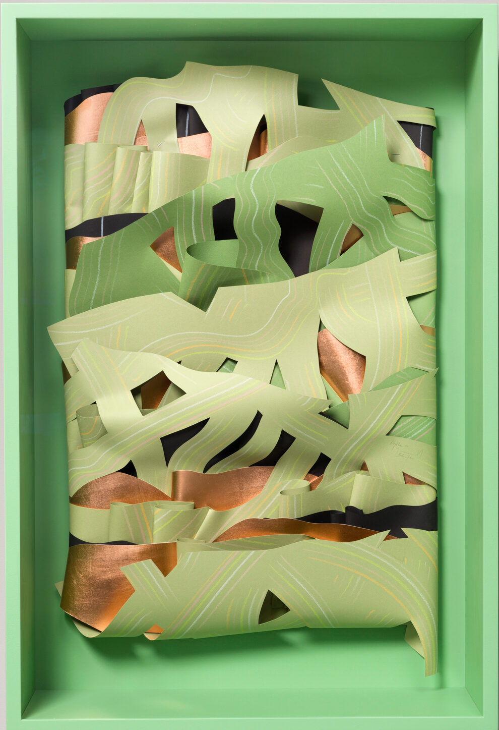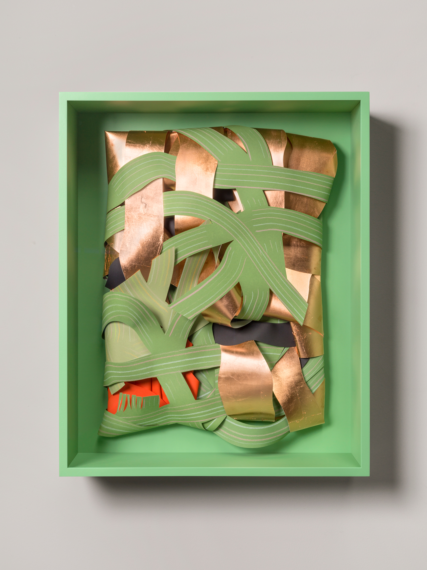 Oil chalk, copper leaf on paper on wood, unique, signed