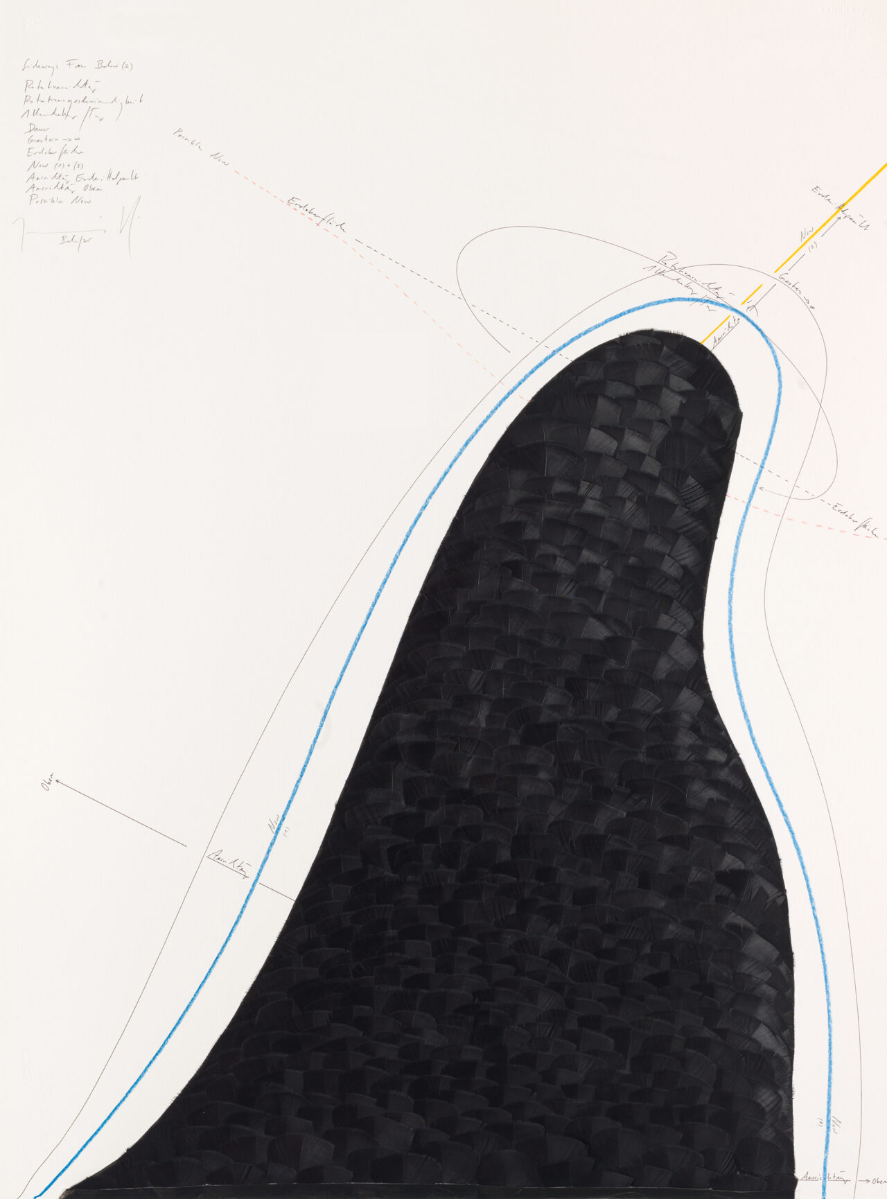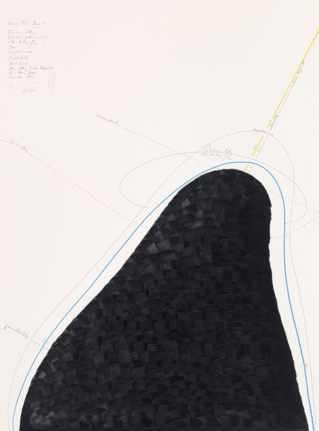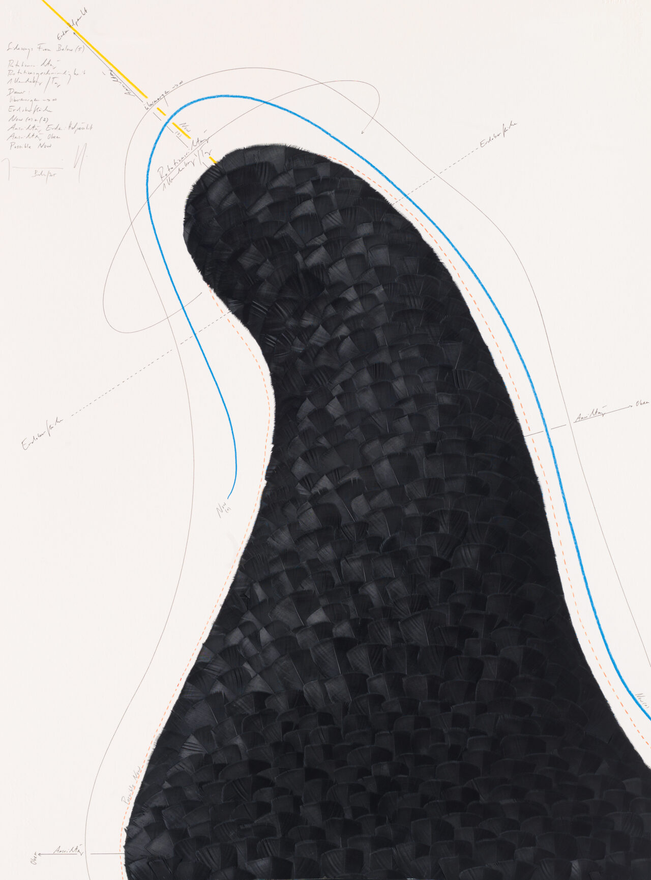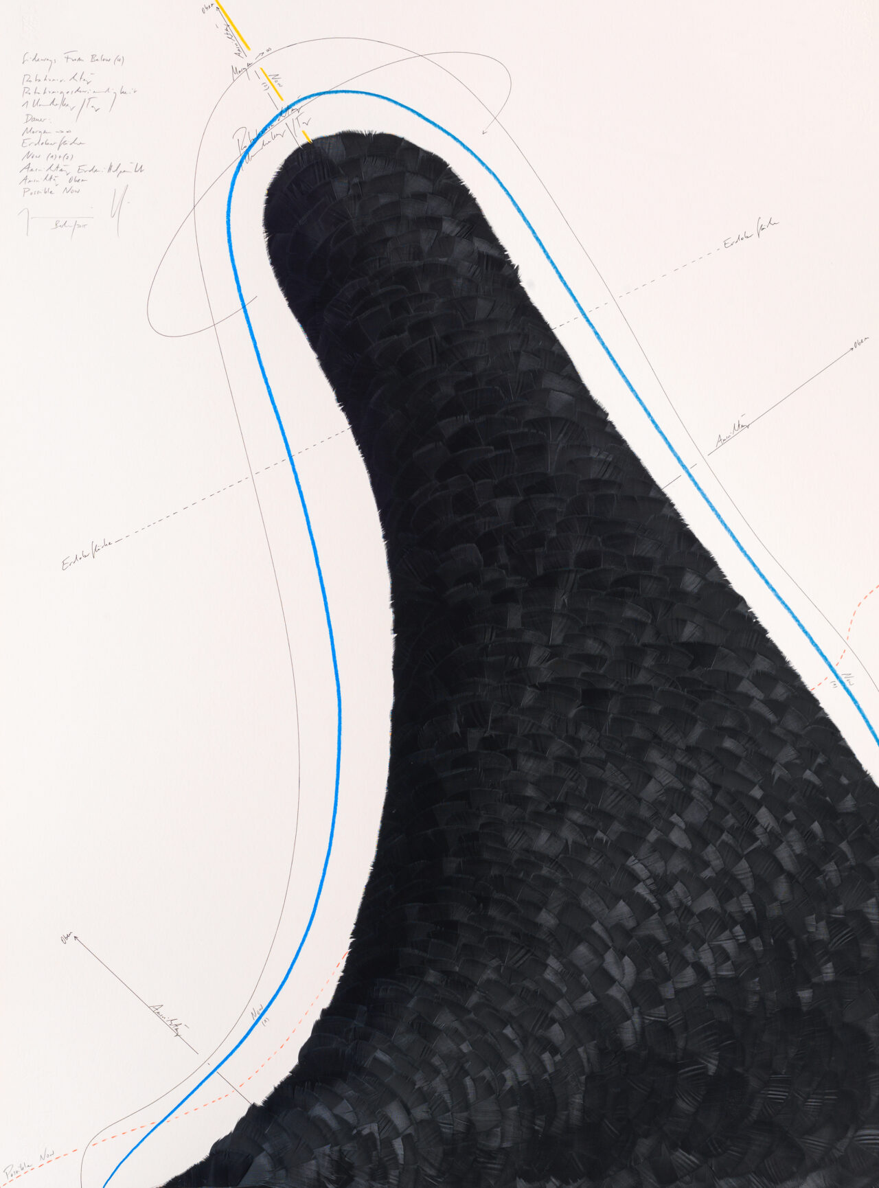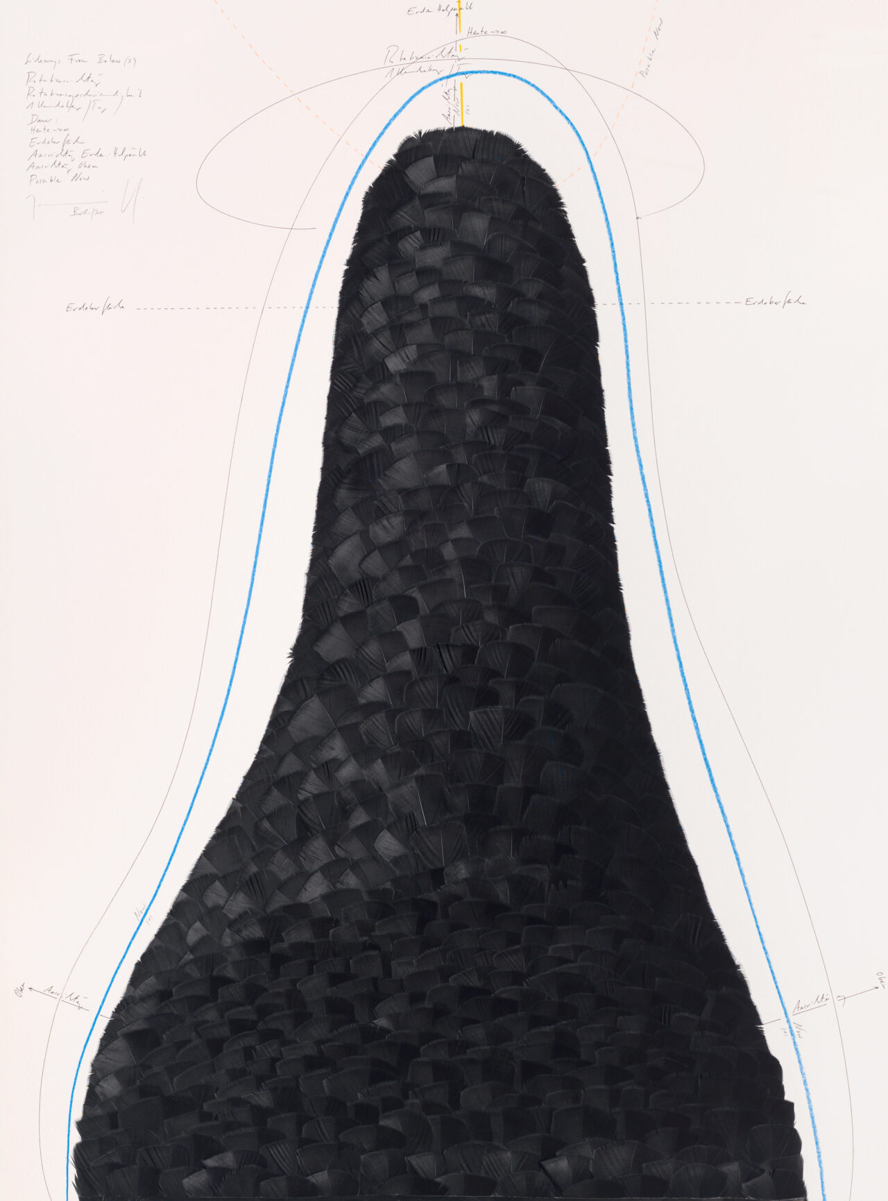 Ink, feathers, oil chalks, India ink, pencil on paper, unique, signed