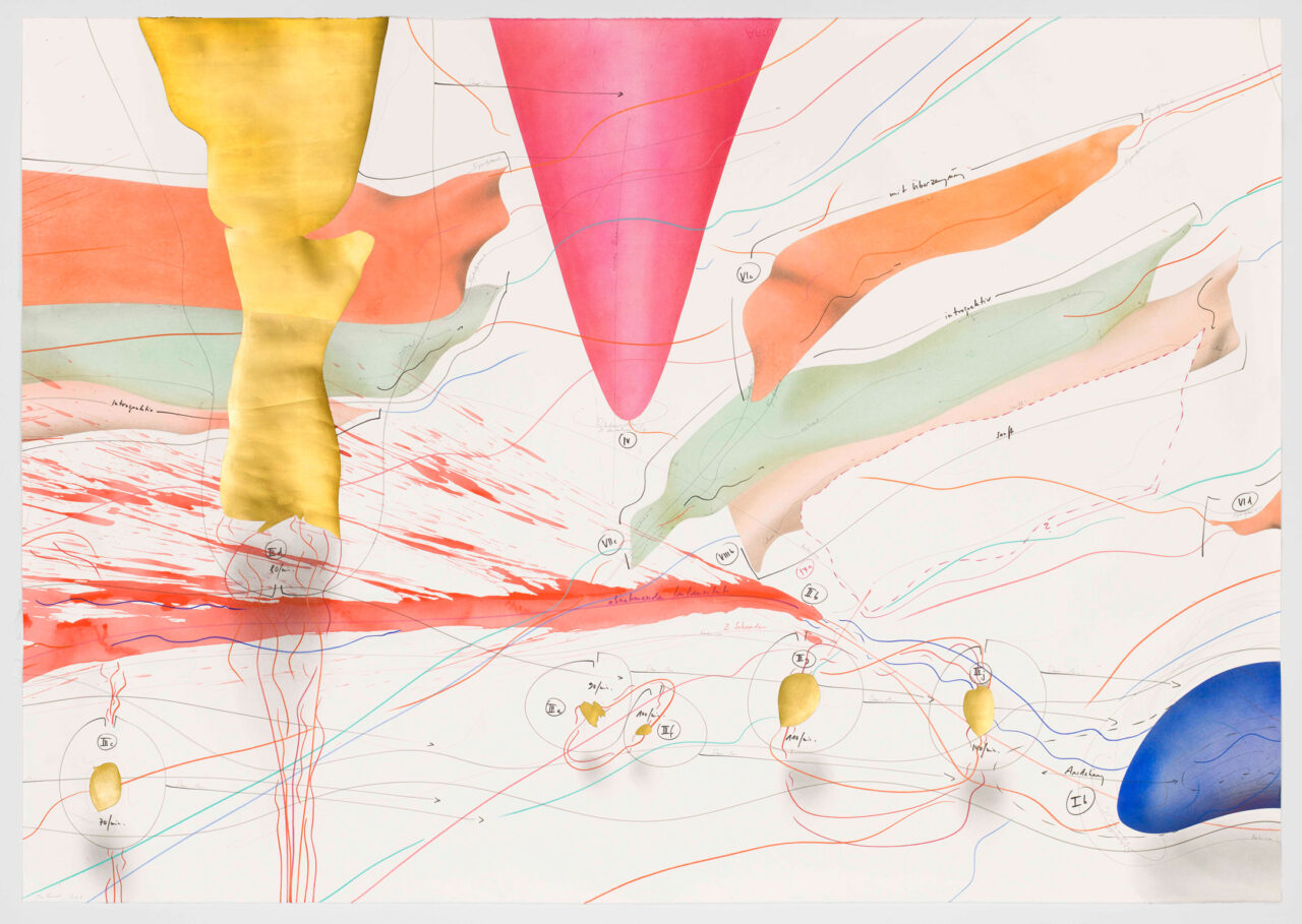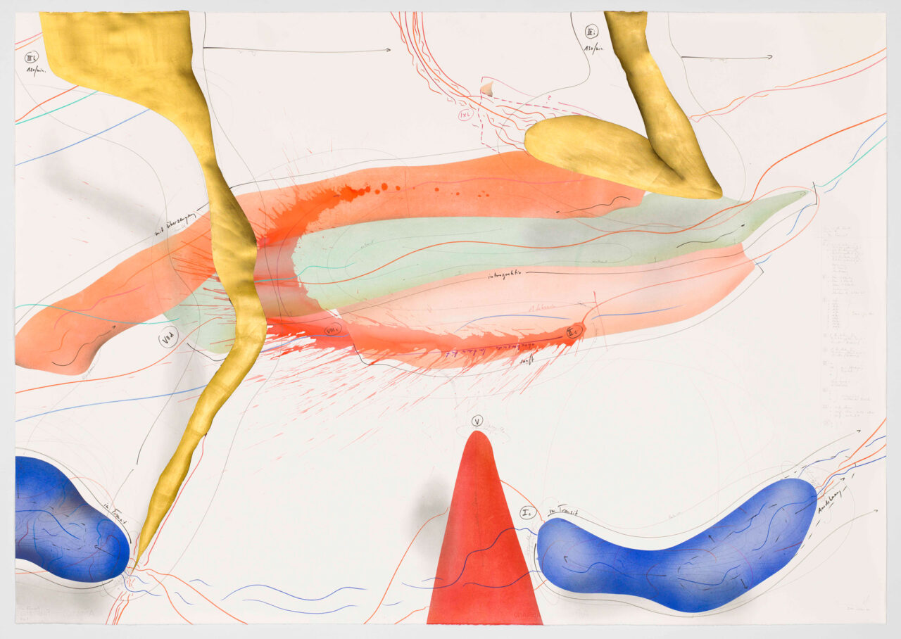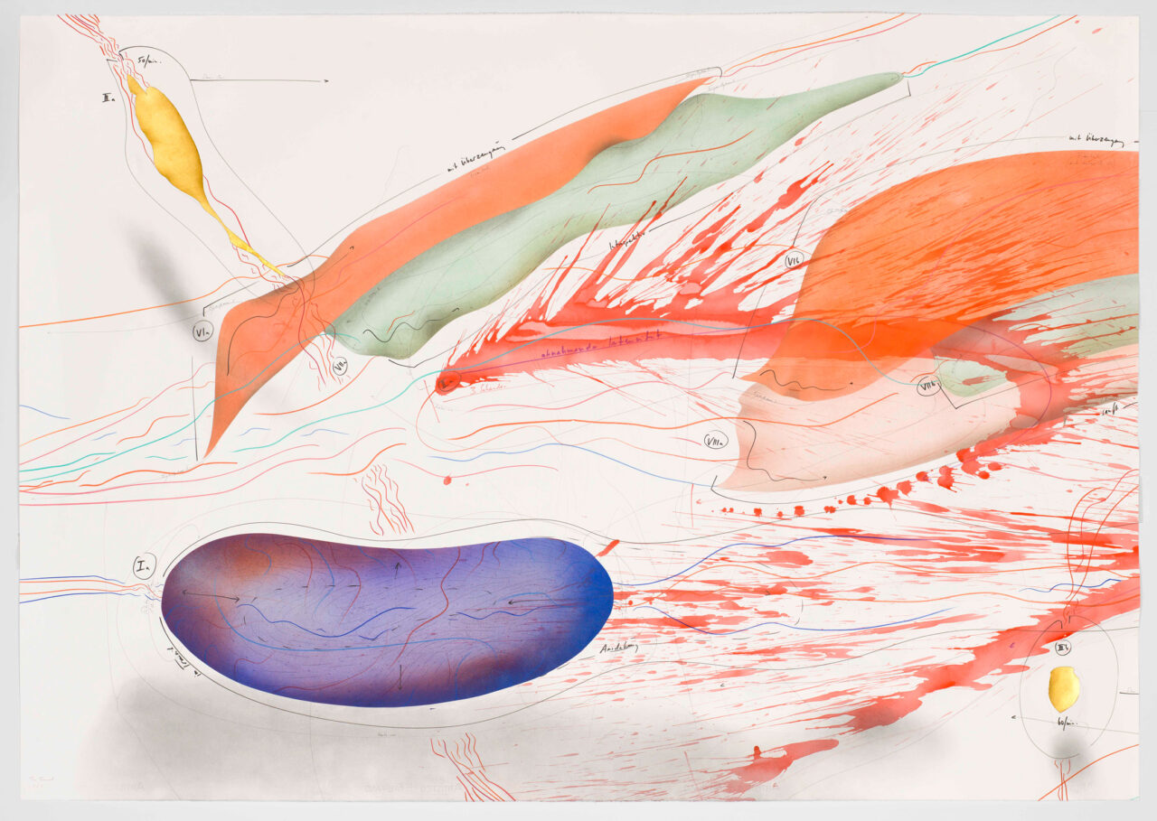 Ink, gold leaf, india ink, oil chalks, acrylic paint, pastels, pencil on paper, unique, signed