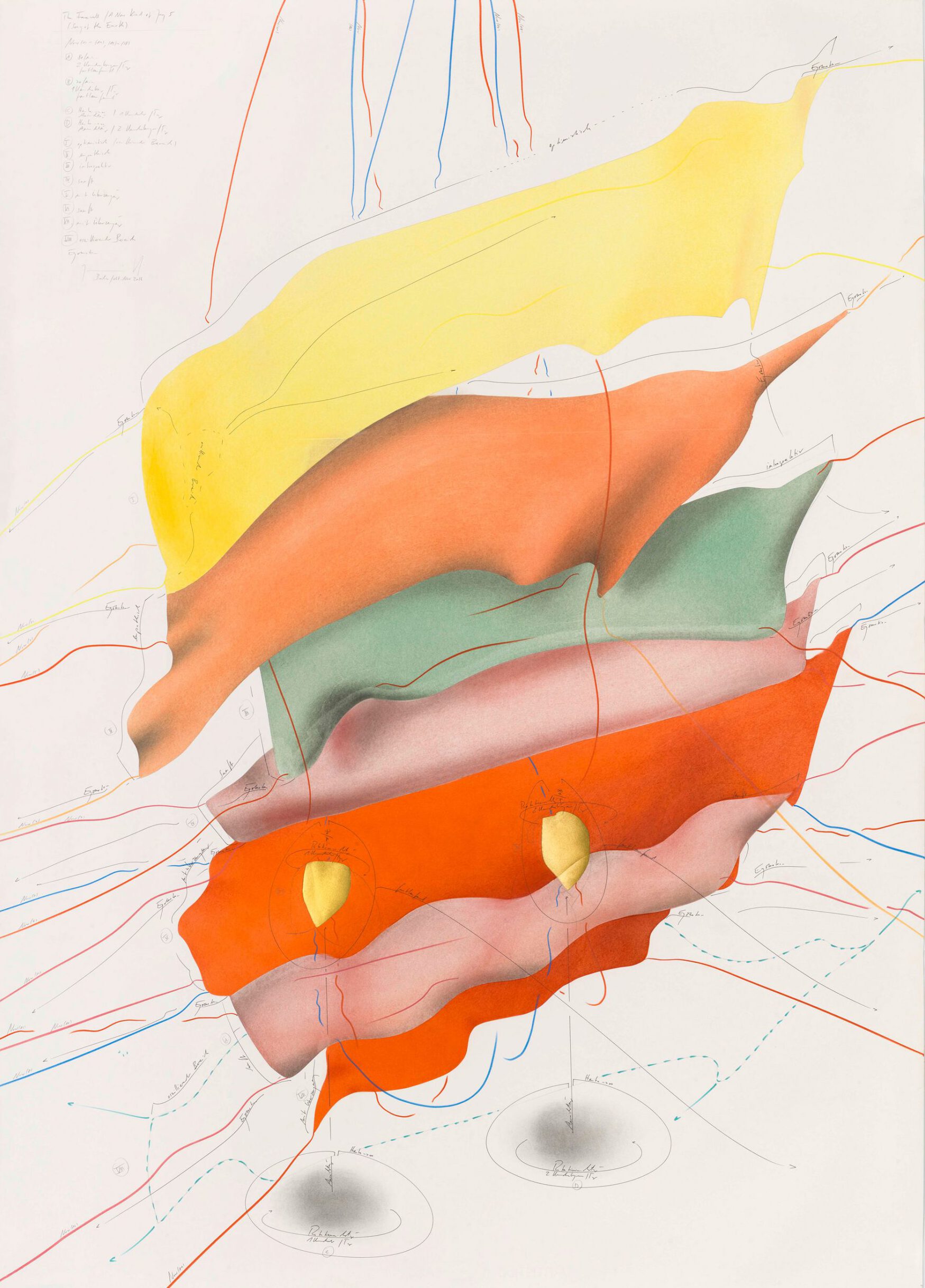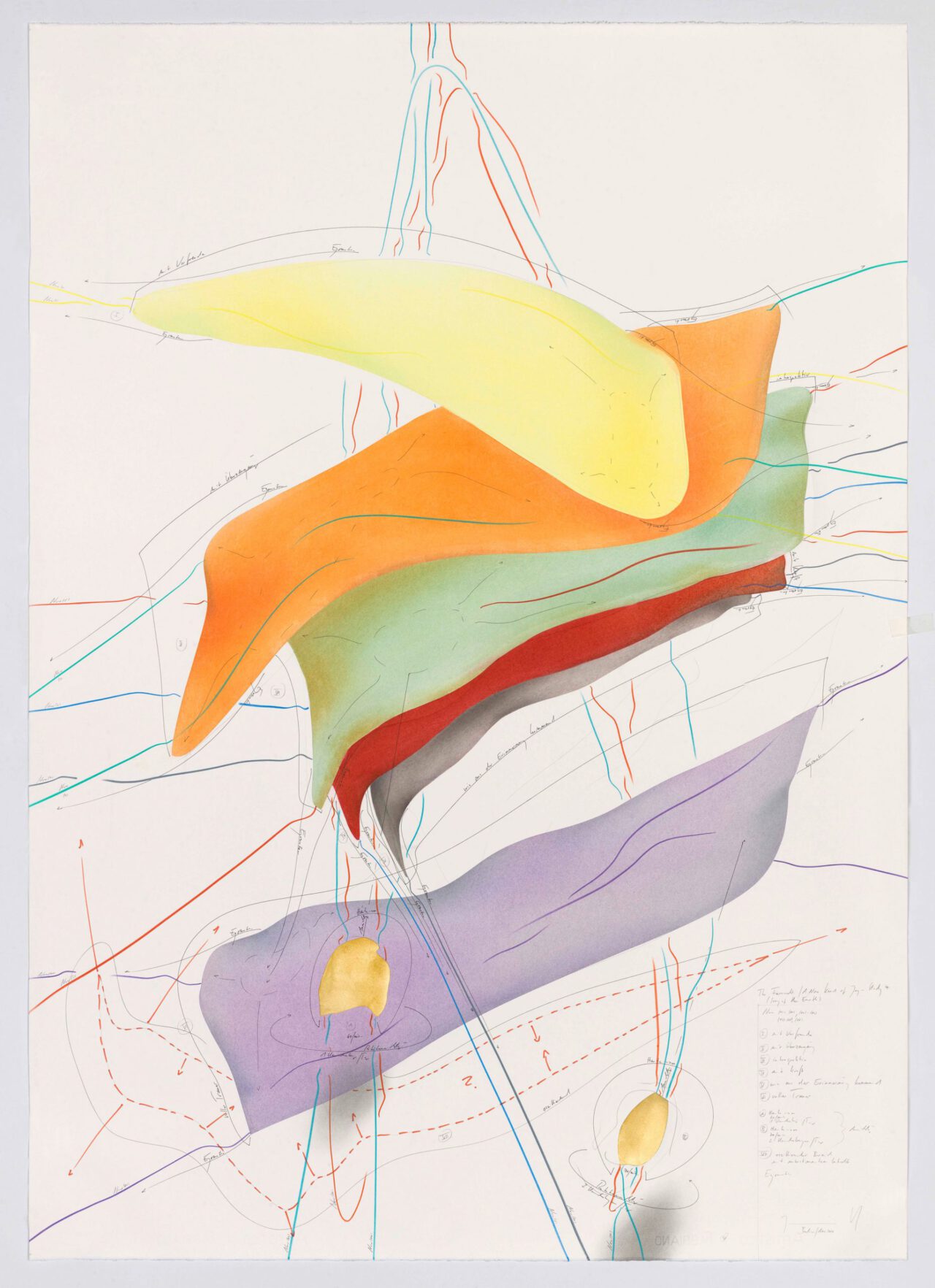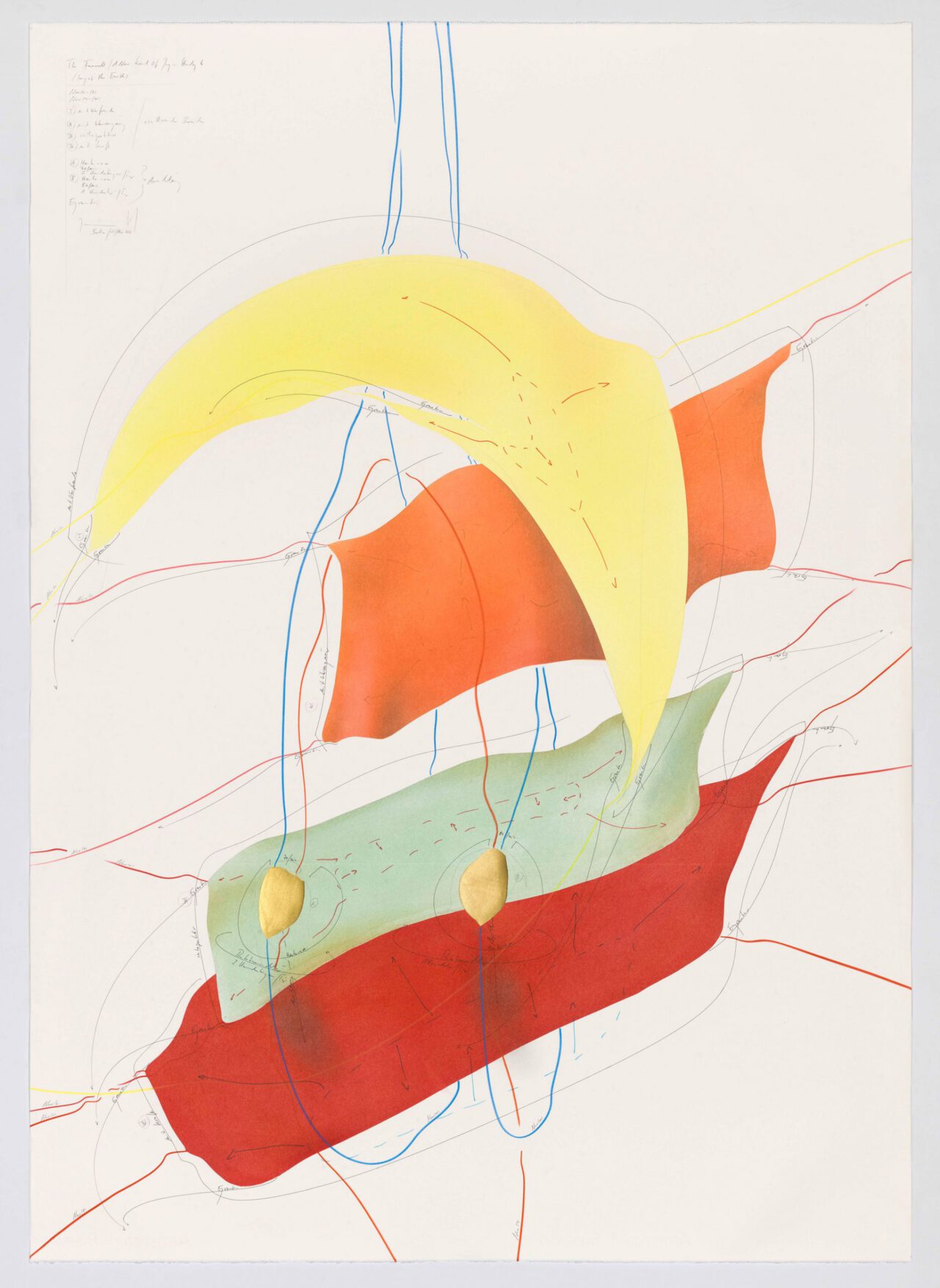 Ink, gold leaf, oil chalks, pastels, pencil on paper, unique, signed