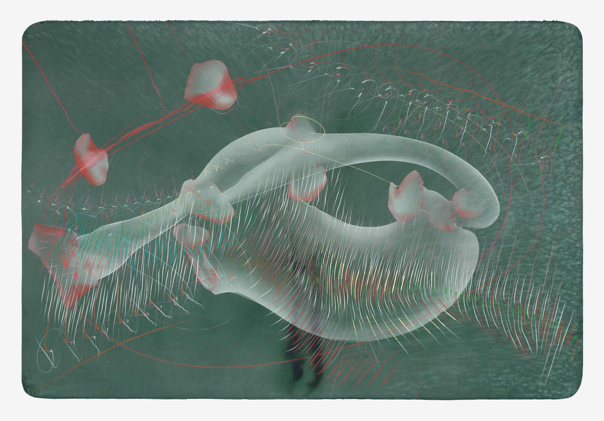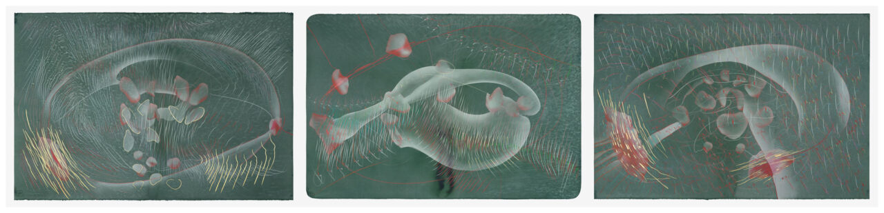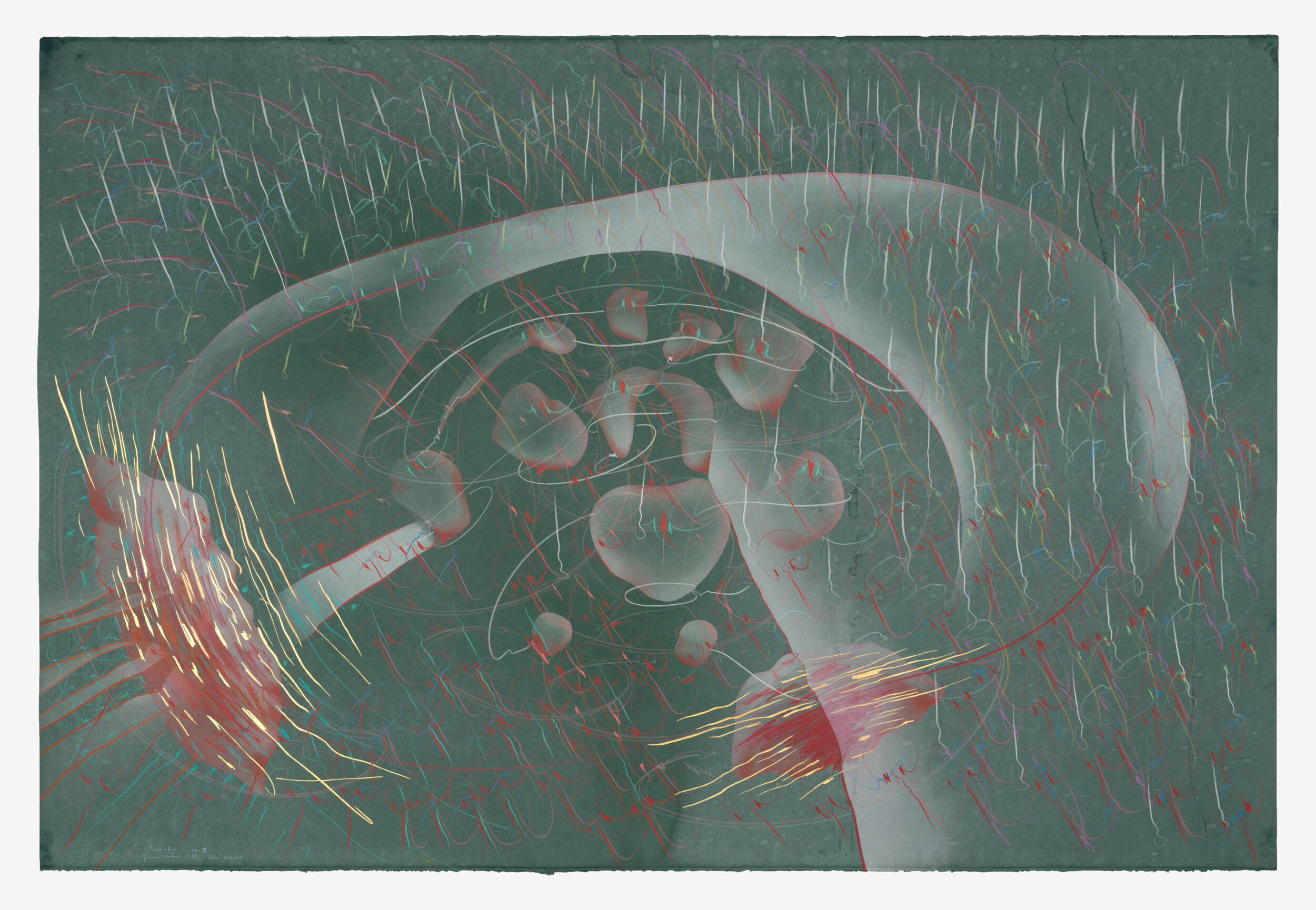 gold leaf, pastels, oil chalks, india ink on paper, unique, signed