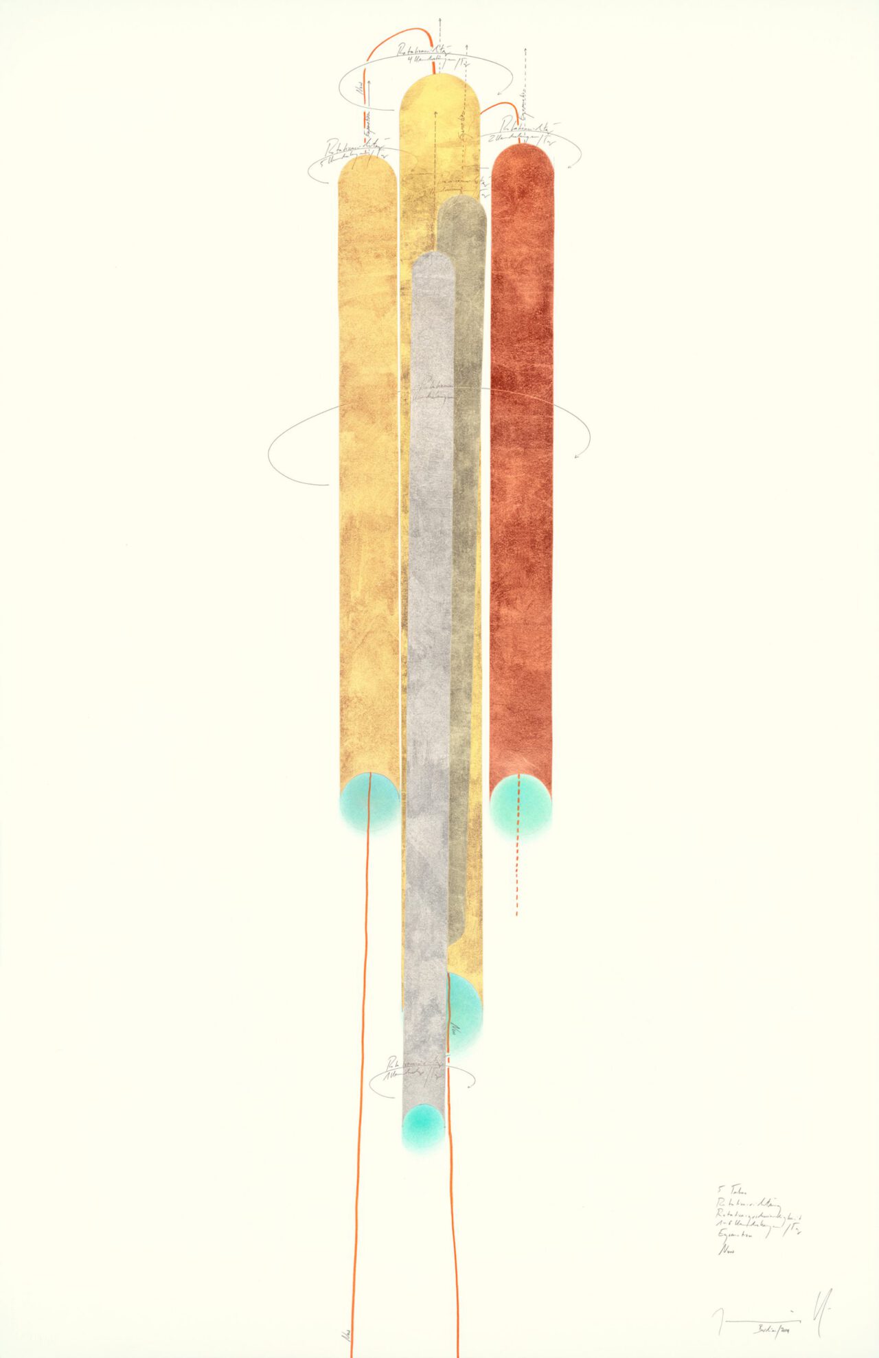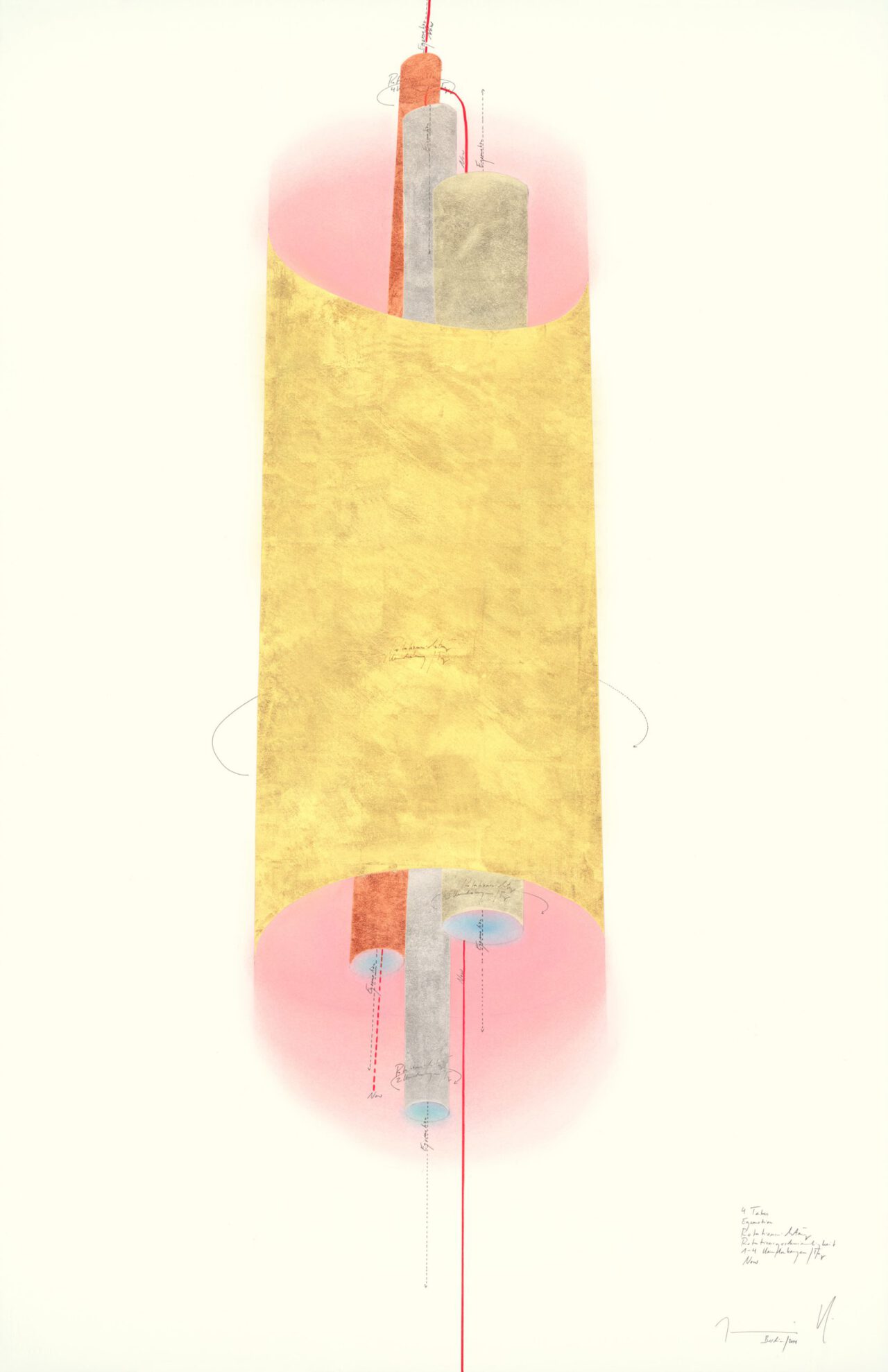 Ink, gold leaf, oil chalks, pastels, graphite on paper, unique, signed
